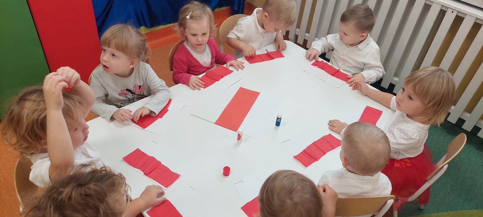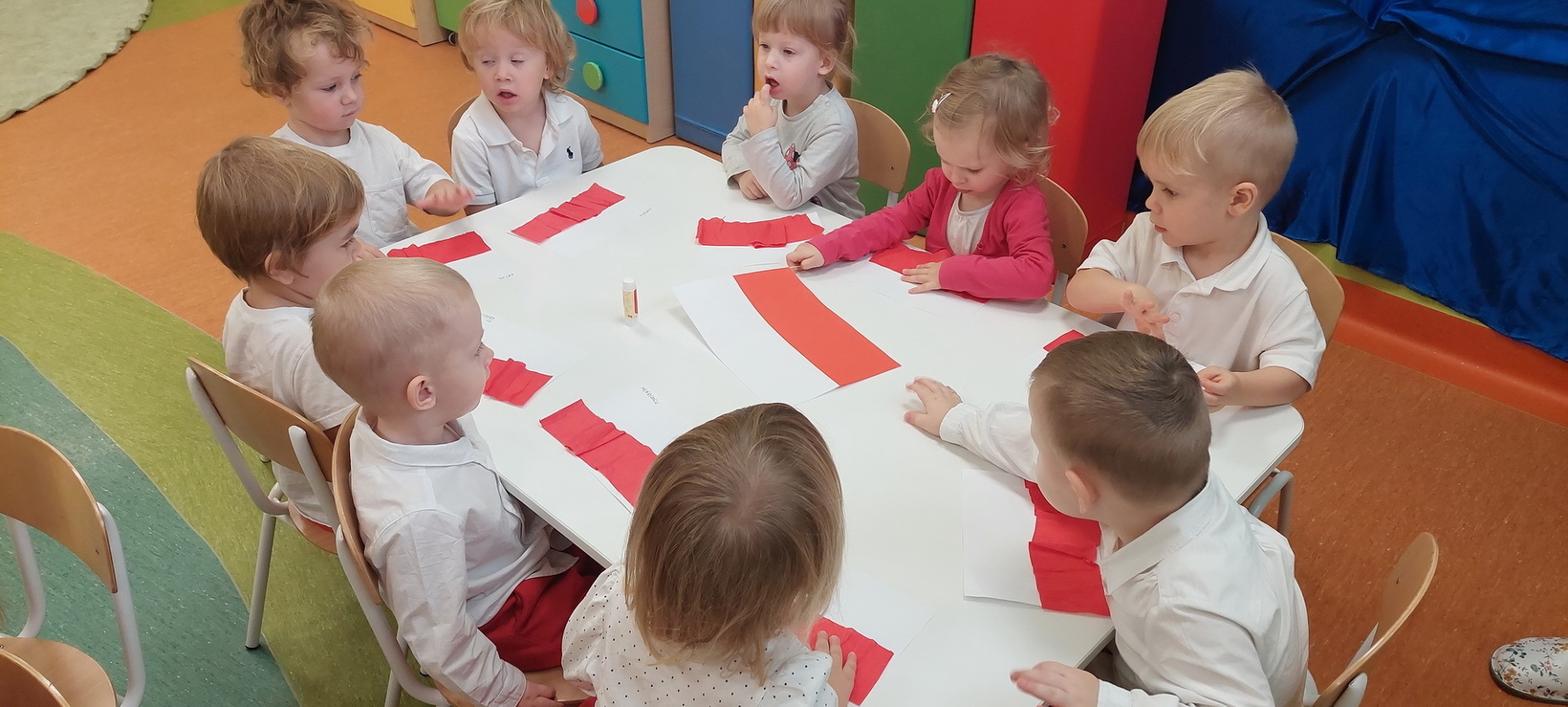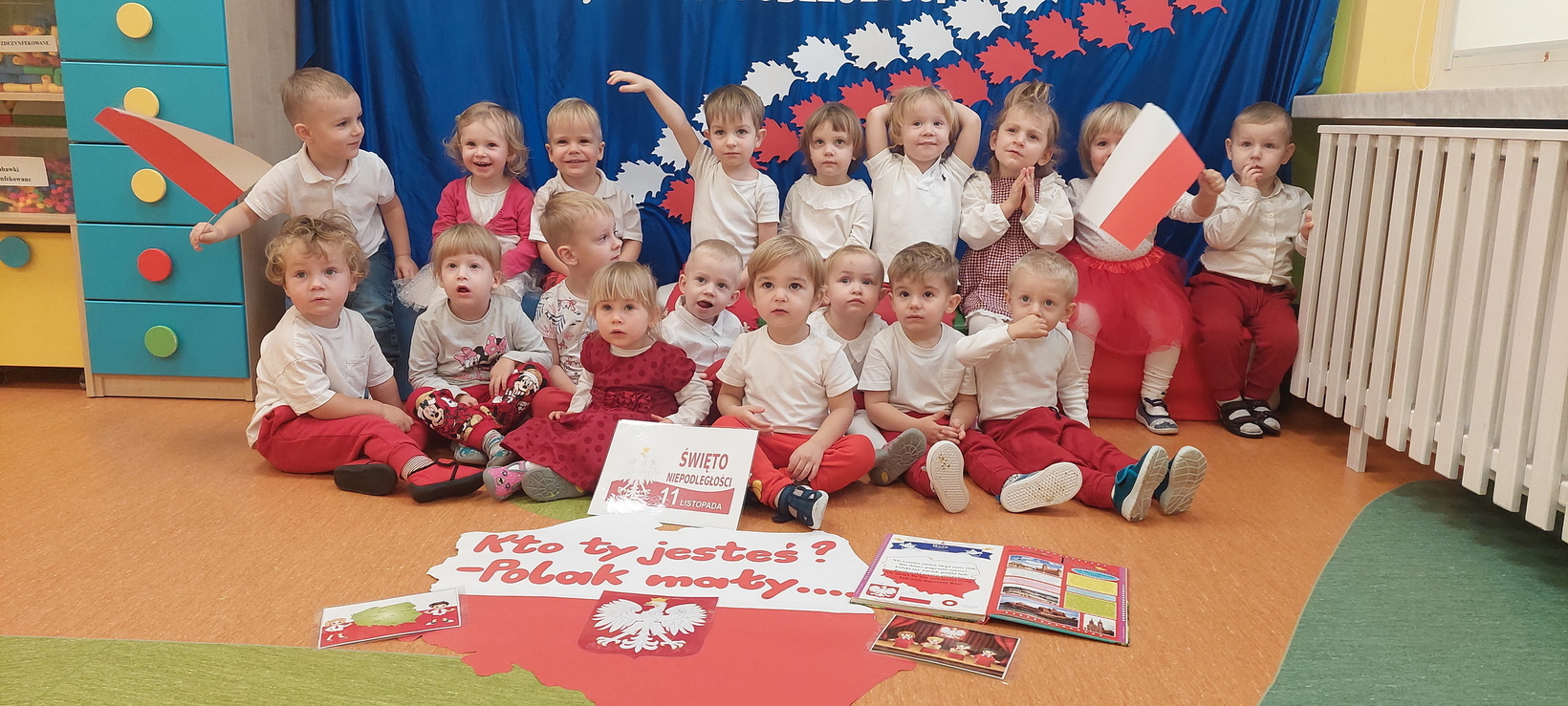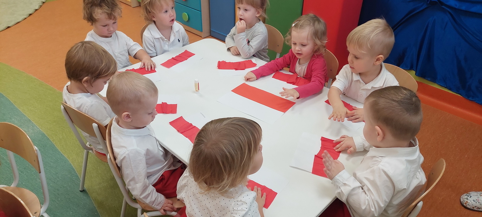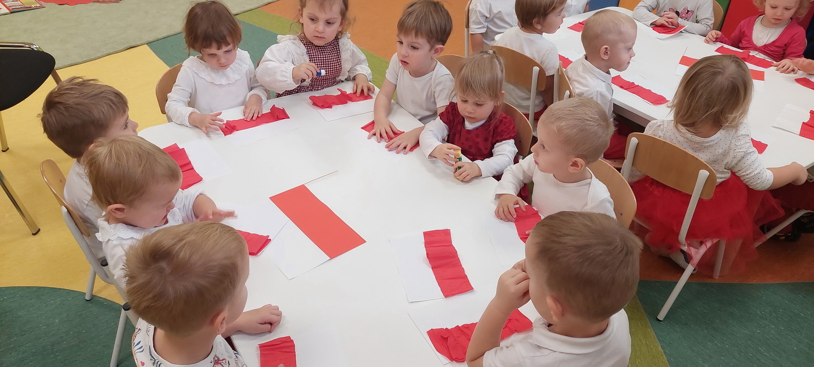 Dzisiaj w grupie starszaków świętowaliśmy Narodowe Święto Niepodległości. Głównym celem tej uroczystości było kształtowanie przywiązania do kraju ojczystego, jego kultury i tradycji. Dzięki udziałowi w tego typu uroczystościach dzieci od najmłodszych lat uczą się patriotyzmu, kształtują pozytywne postawy i uczucia patriotyczne. Dzieci zapoznały się z symbolami narodowymi oraz wykonały pracę plastyczną.