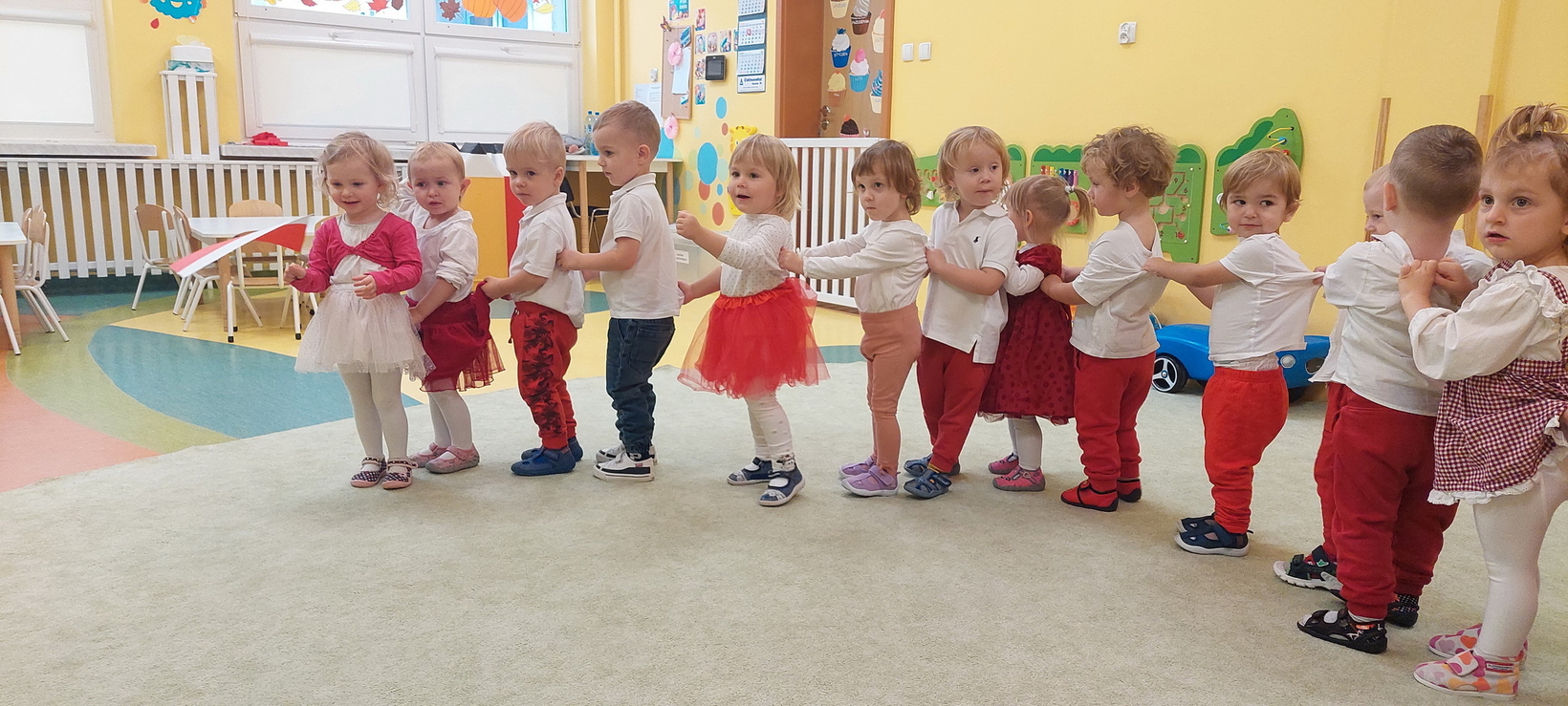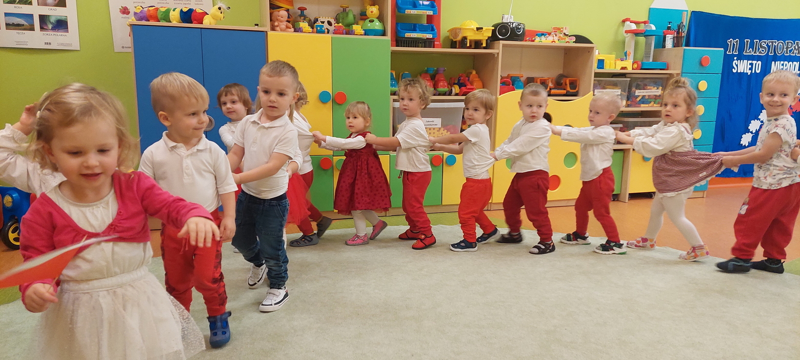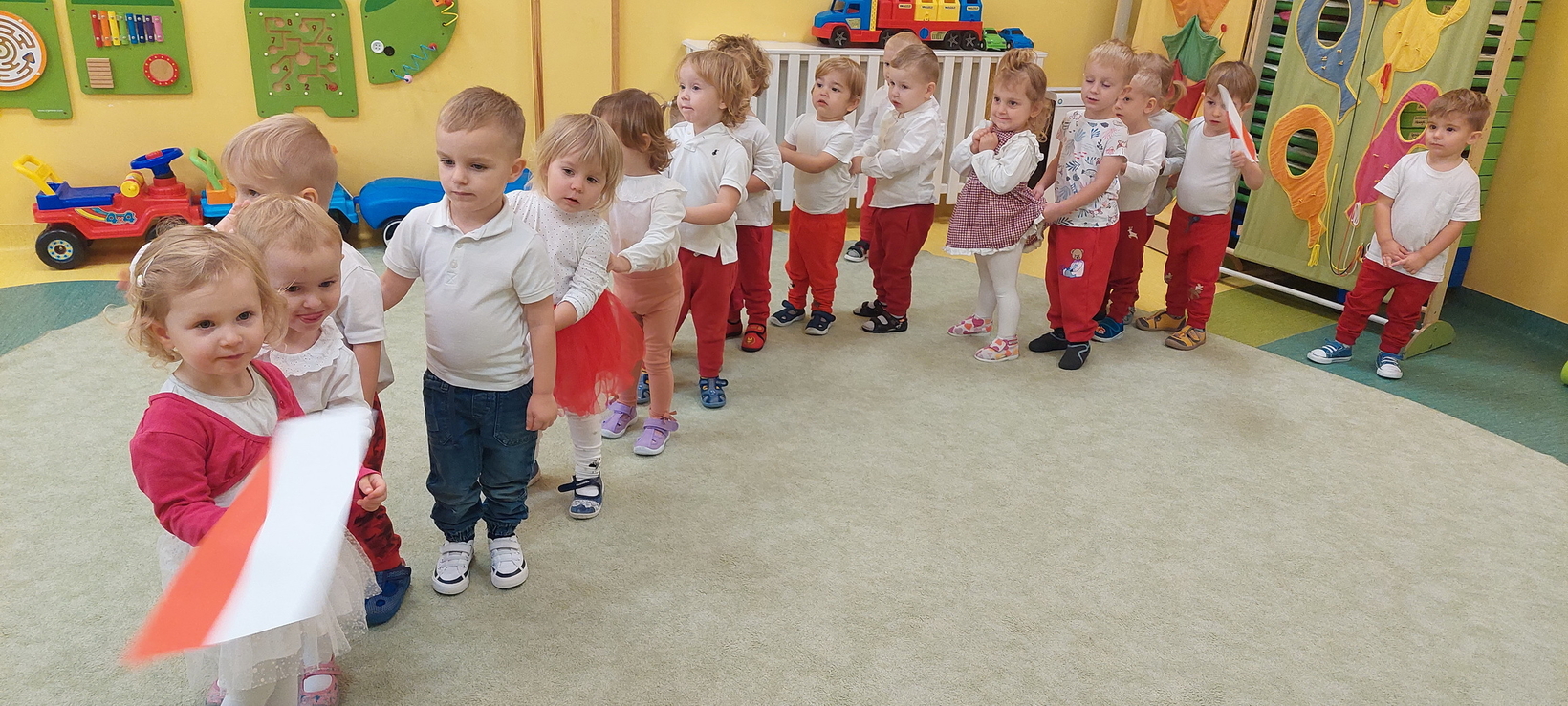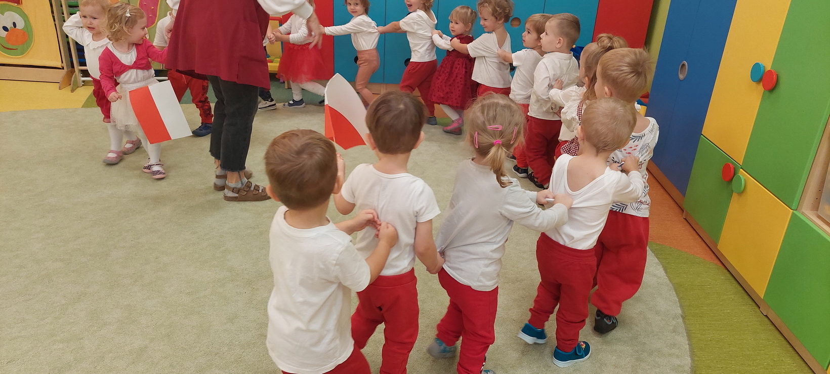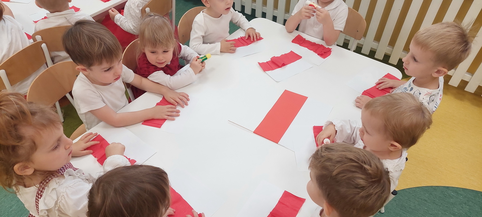 Dzisiaj w grupie starszaków świętowaliśmy Narodowe Święto Niepodległości. Głównym celem tej uroczystości było kształtowanie przywiązania do kraju ojczystego, jego kultury i tradycji. Dzięki udziałowi w tego typu uroczystościach dzieci od najmłodszych lat uczą się patriotyzmu, kształtują pozytywne postawy i uczucia patriotyczne. Dzieci zapoznały się z symbolami narodowymi oraz wykonały pracę plastyczną.