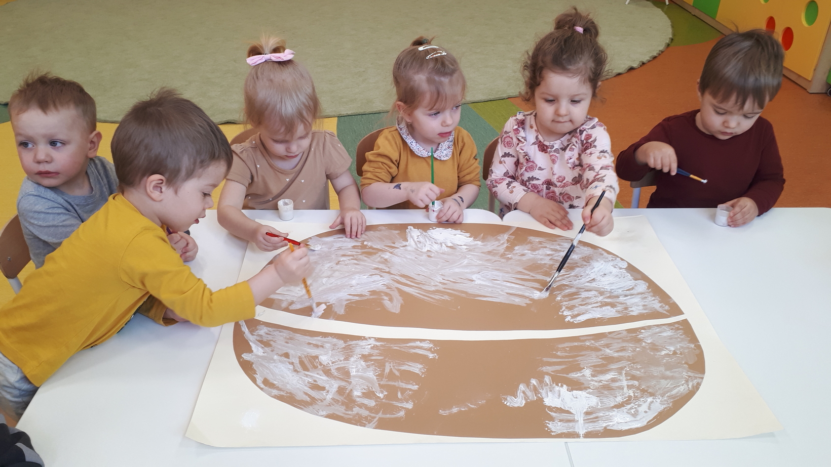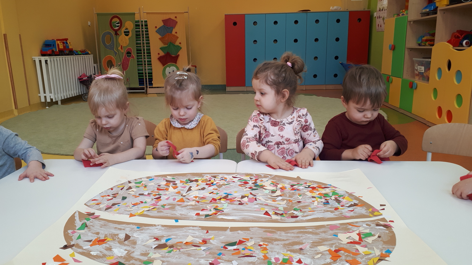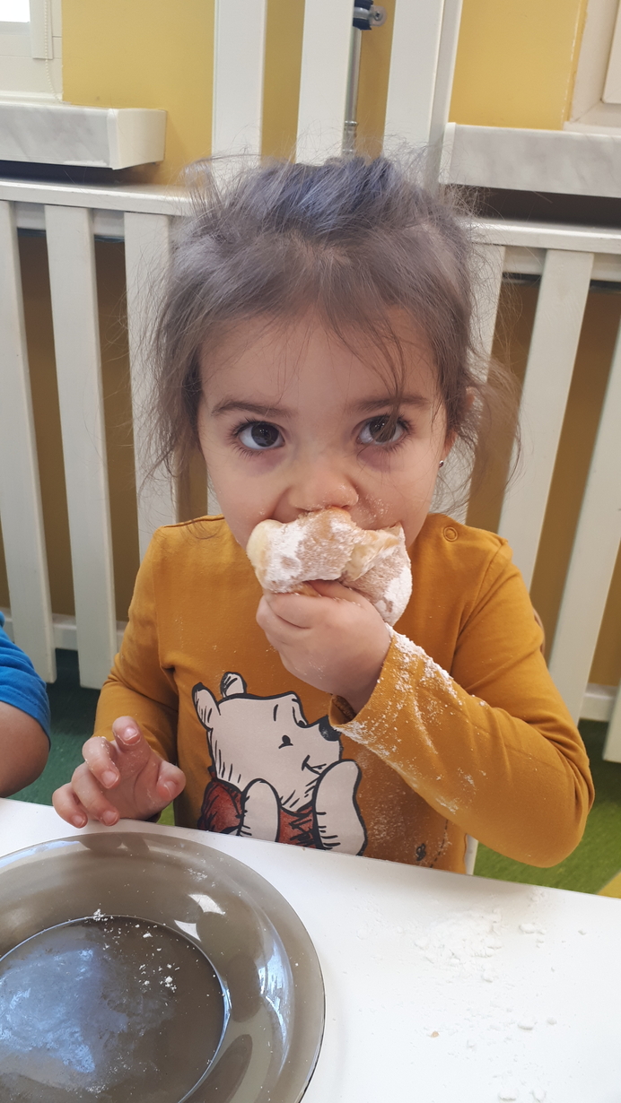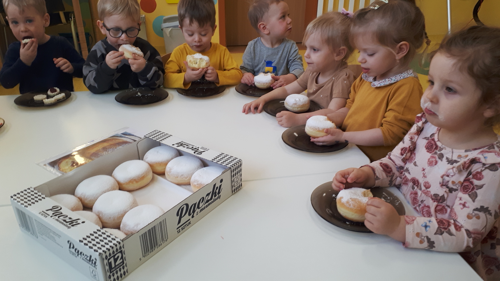 W grupie naszych starszaków ten dzień zaczął się od pogadanki na temat tradycji i obrzędów związanych z tłustym czwartkiem. Potem dzieci wykonały i udekorowały plakat przedstawiający dużego pączka. Z kawałków materiału dzieci uczyły się wykonać chrust, który wzbudził ogromne zainteresowanie. Na koniec tego słodkiego dnia nadszedł czas na degustację pysznych pączków.