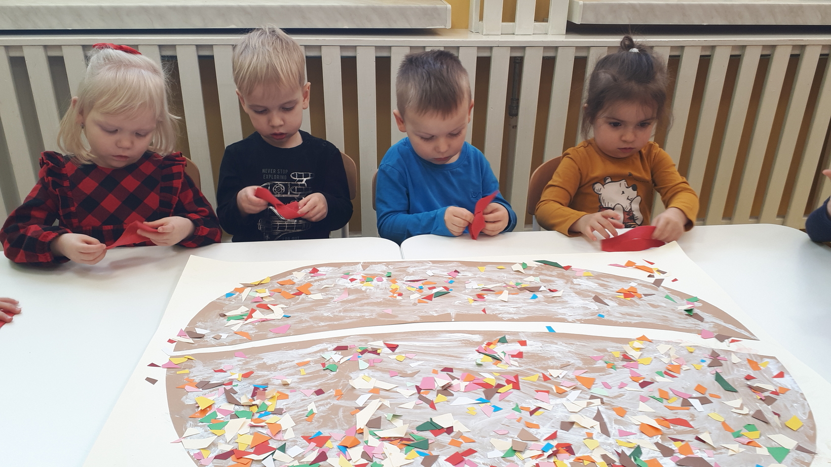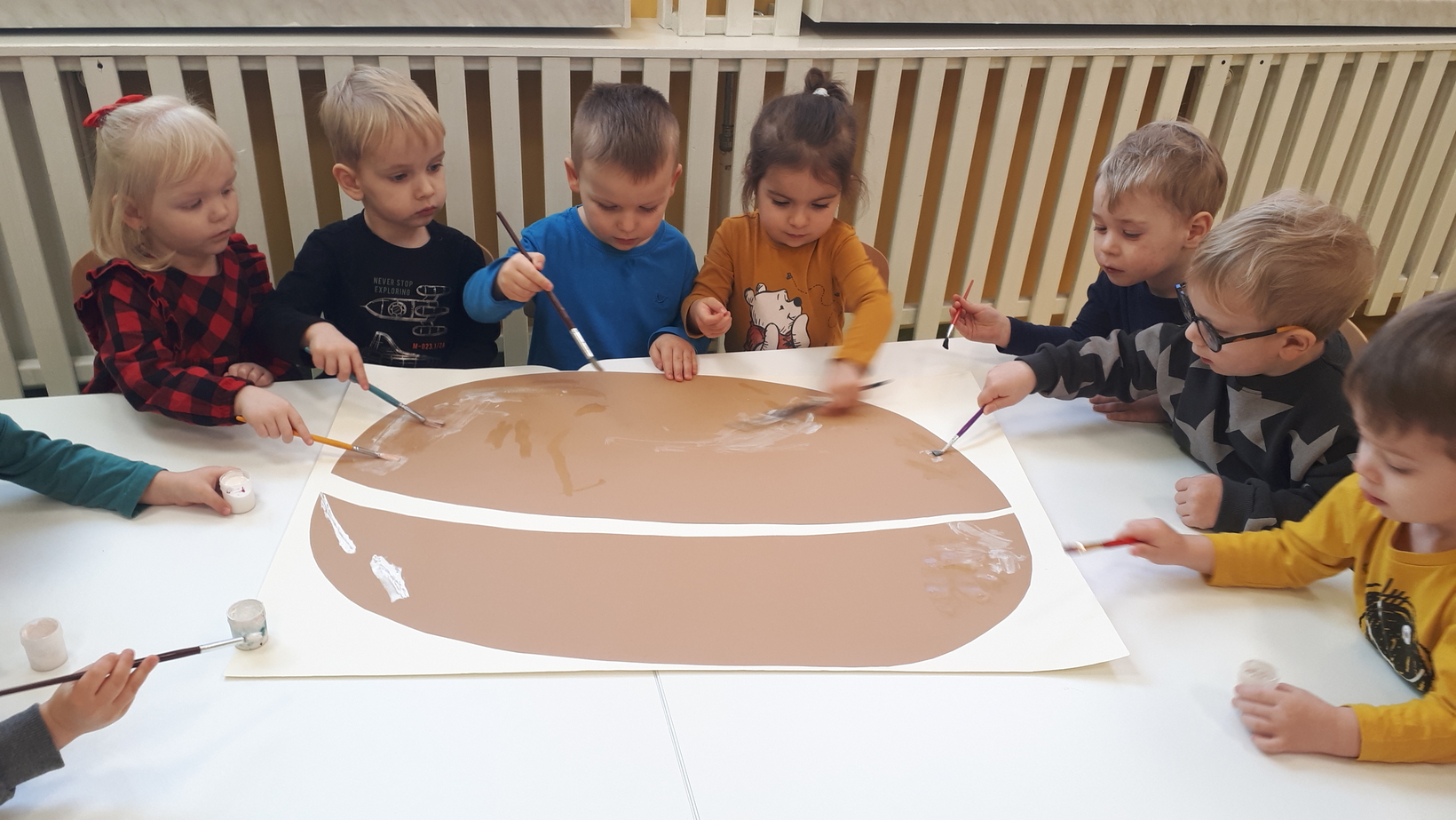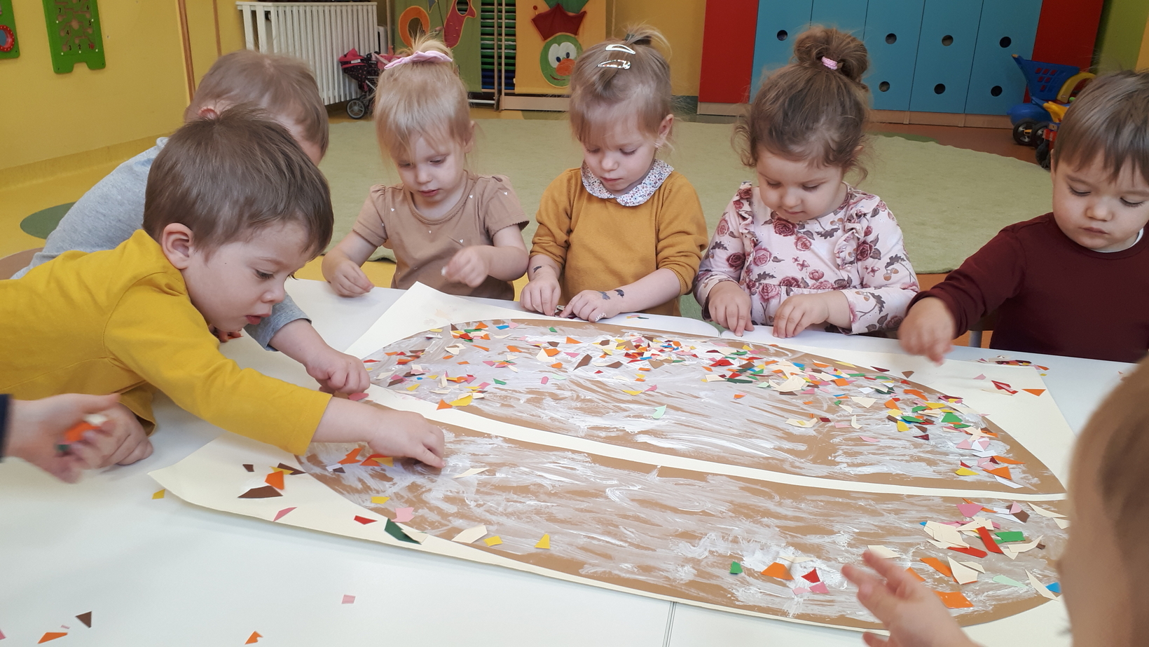 W grupie naszych starszaków ten dzień zaczął się od pogadanki na temat tradycji i obrzędów związanych z tłustym czwartkiem. Potem dzieci wykonały i udekorowały plakat przedstawiający dużego pączka. Z kawałków materiału dzieci uczyły się wykonać chrust, który wzbudził ogromne zainteresowanie. Na koniec tego słodkiego dnia nadszedł czas na degustację pysznych pączków.
