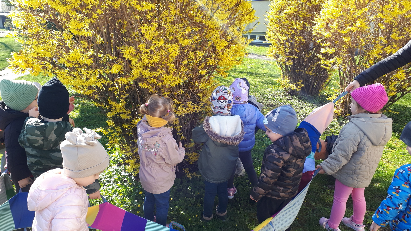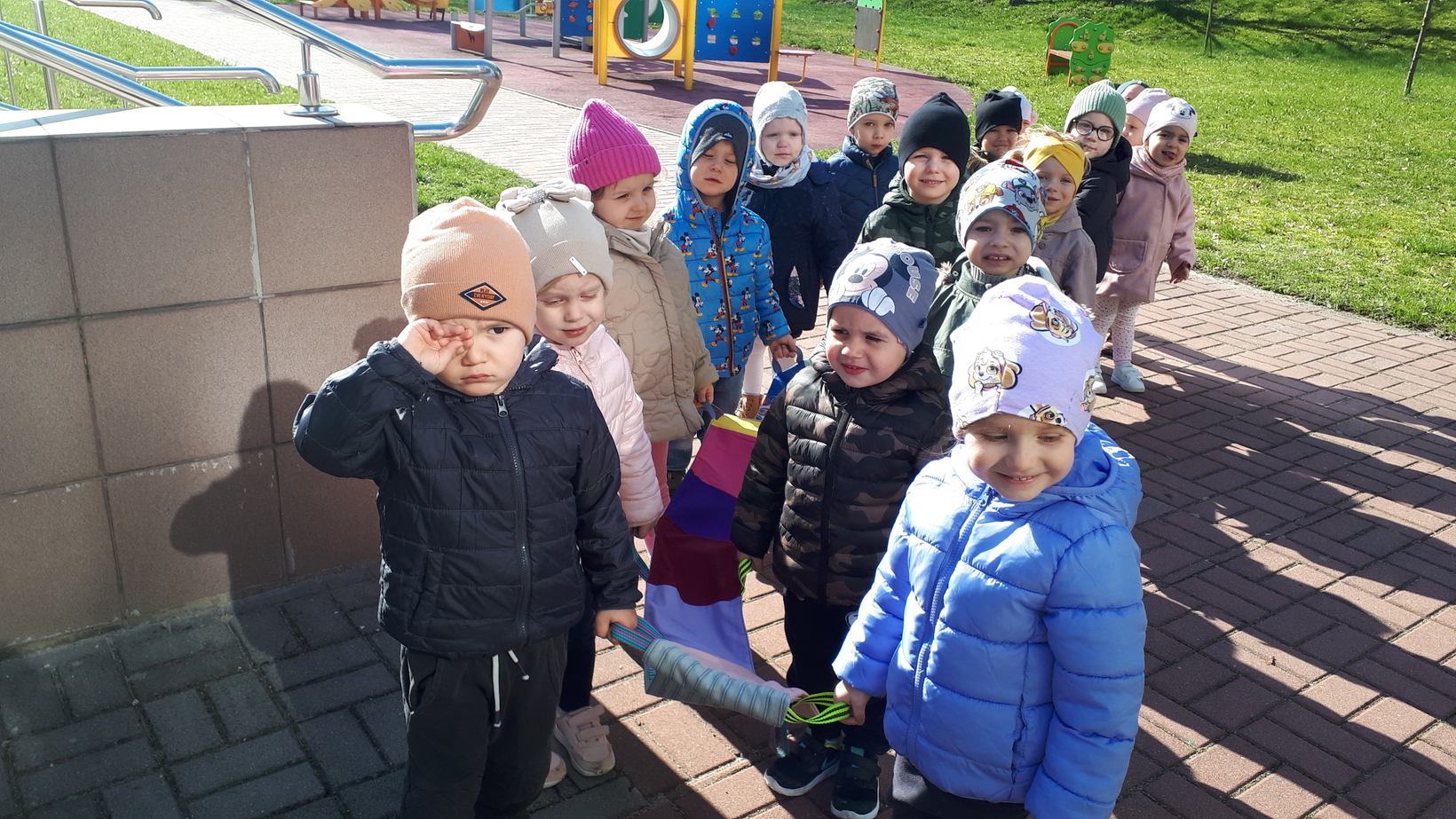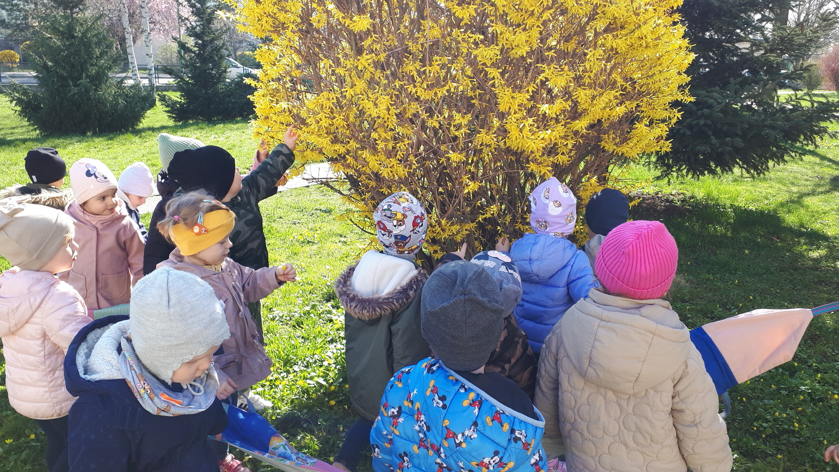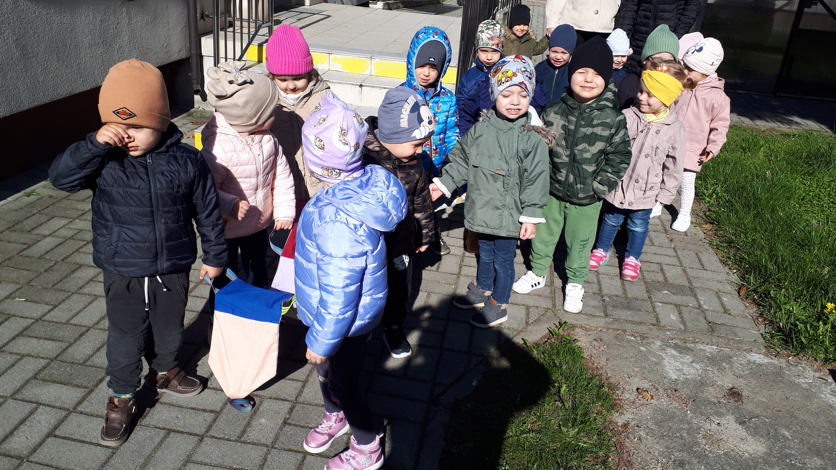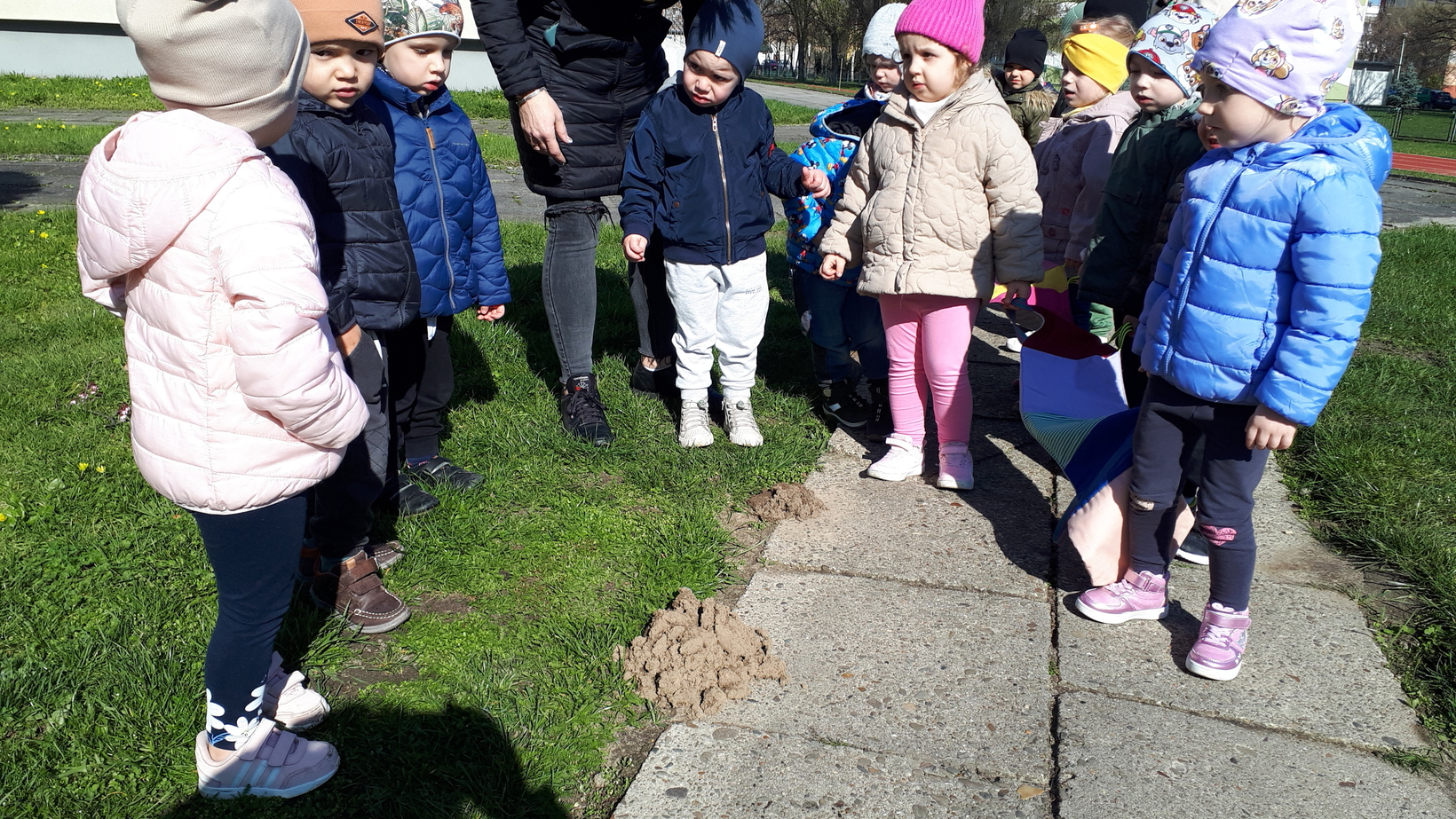 Dzieci bardzo lubią przebywać na świeżym powietrzu szczególnie gdy sprzyja temu pogoda. To właśnie dzisiaj w naszym żłobku starszaki wraz z opiekunkami wyszły na pierwszy wiosenny spacer. Dzieci radośnie maszerowały w blasku słonecznych promieni śpiewając piosenki. Wspólnie wsłuchiwaliśmy się w śpiew ptaków oraz rozmawialiśmy o pierwszych zwiastunach wiosny. Dzieci zaobserwowały kopczyk kreta i zaśpiewaliśmy znaną dzieciom piosenkę pt.,,Krecik, krecik, zielony ma berecik.......". To był wspaniały dzień na spacer w poszukiwaniu i rozpoznawaniu oznak wiosny.