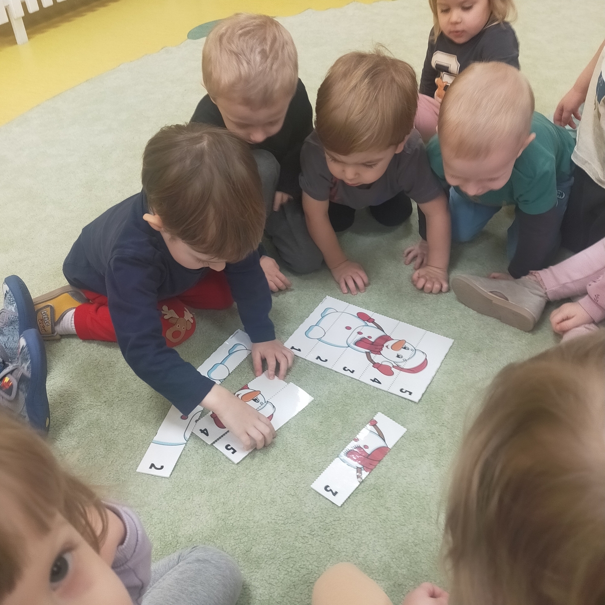 Następnie układały puzzle z sylwetą bałwana oraz samodzielnie składały bałwana z gotowych elementów papieru.