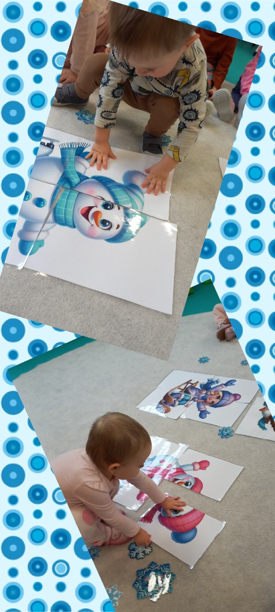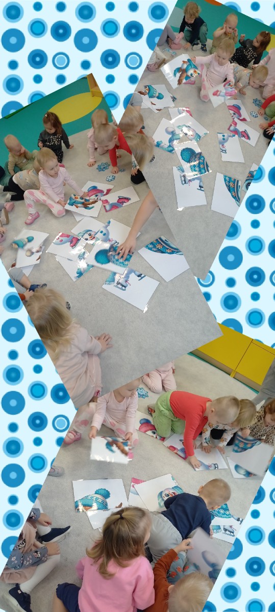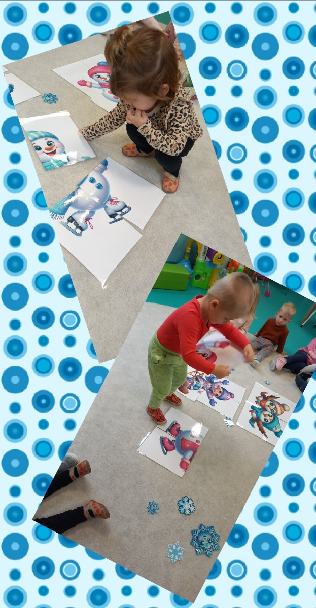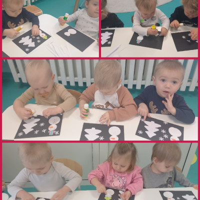 Zdjęcia przedstawiają dzieci biorące udział w zajęciach o tematyce zimowej.