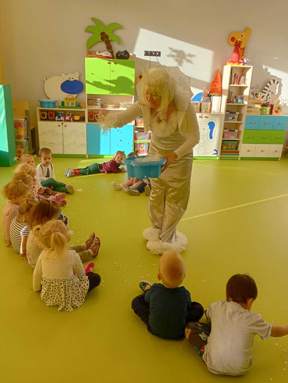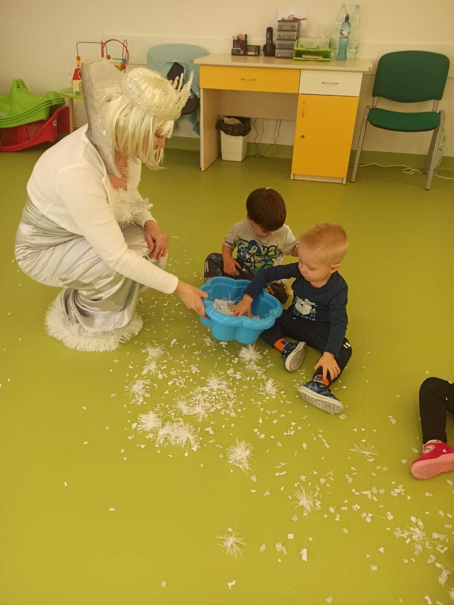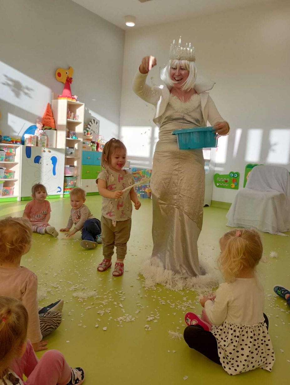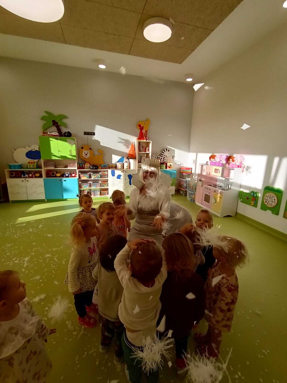 Do naszych maluchów w odwiedziny przyszła Pani Zima, która używając swojej magicznej różdżki wyczarowała dla dzieci śnieg!