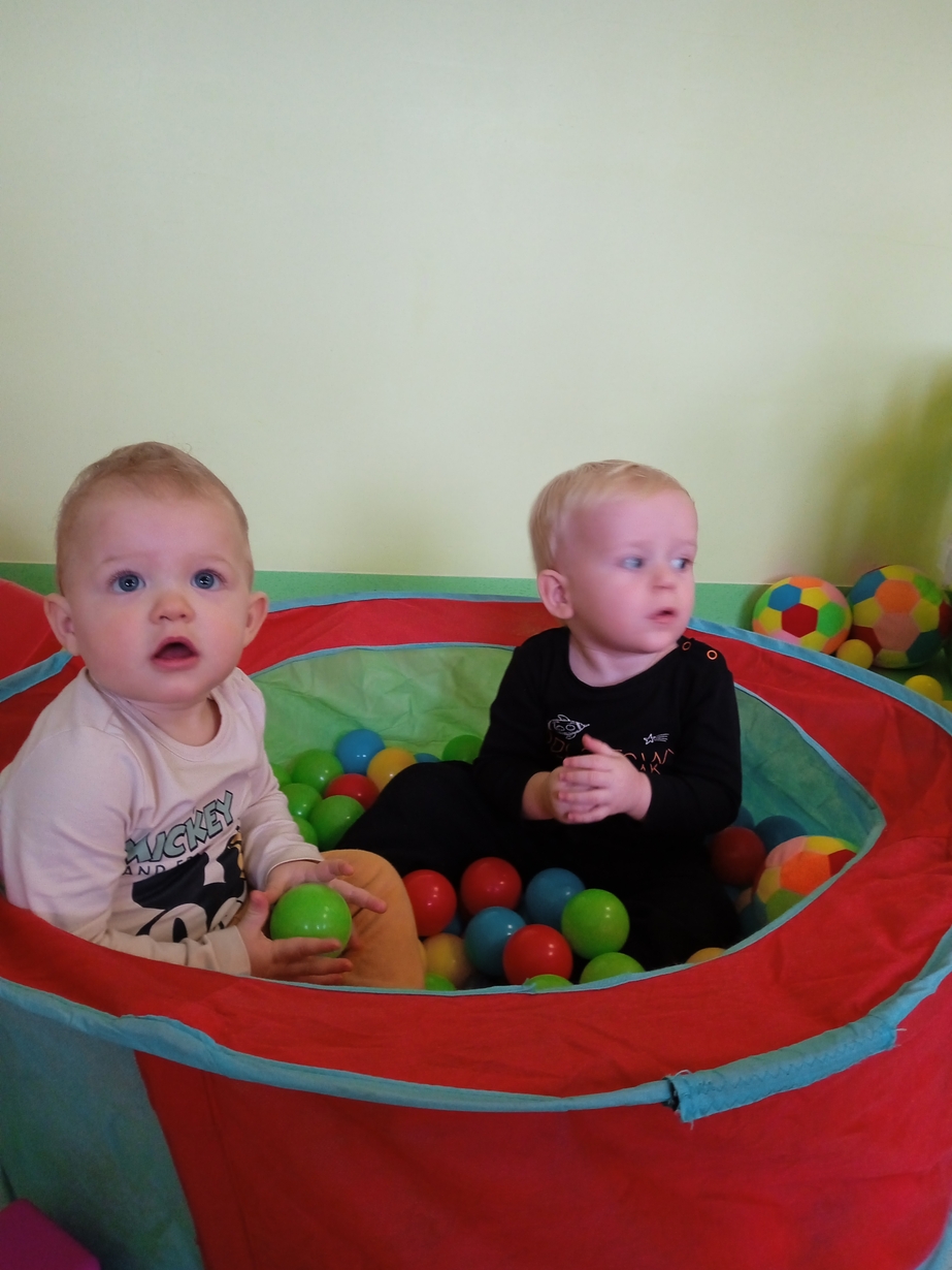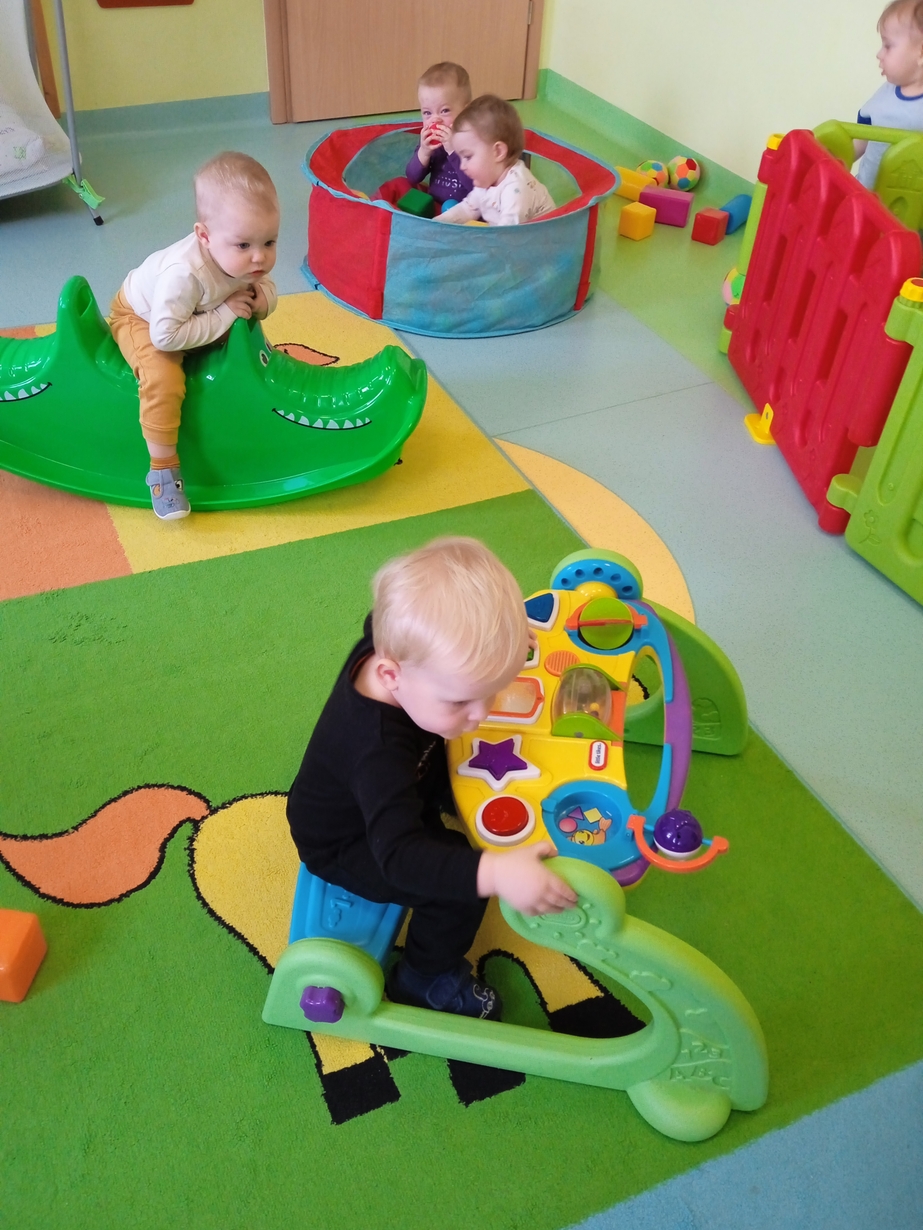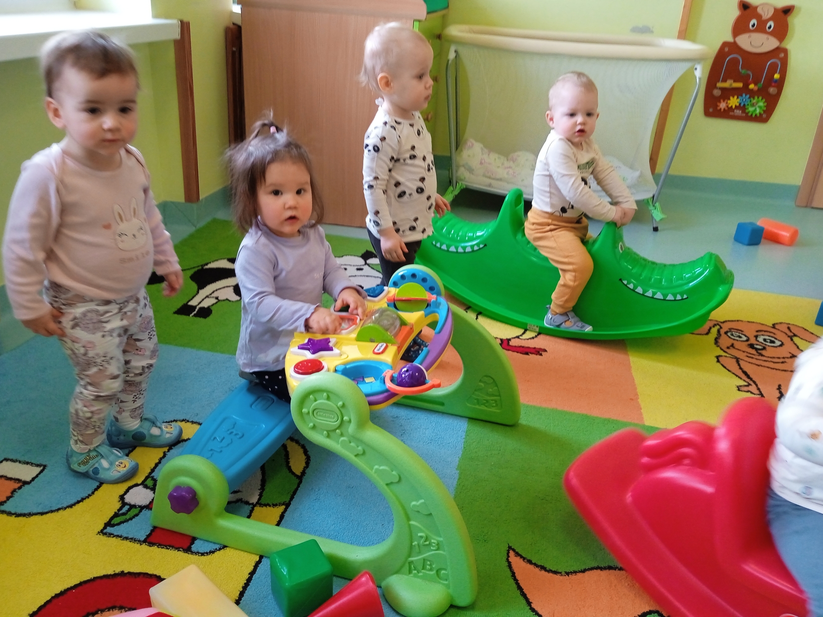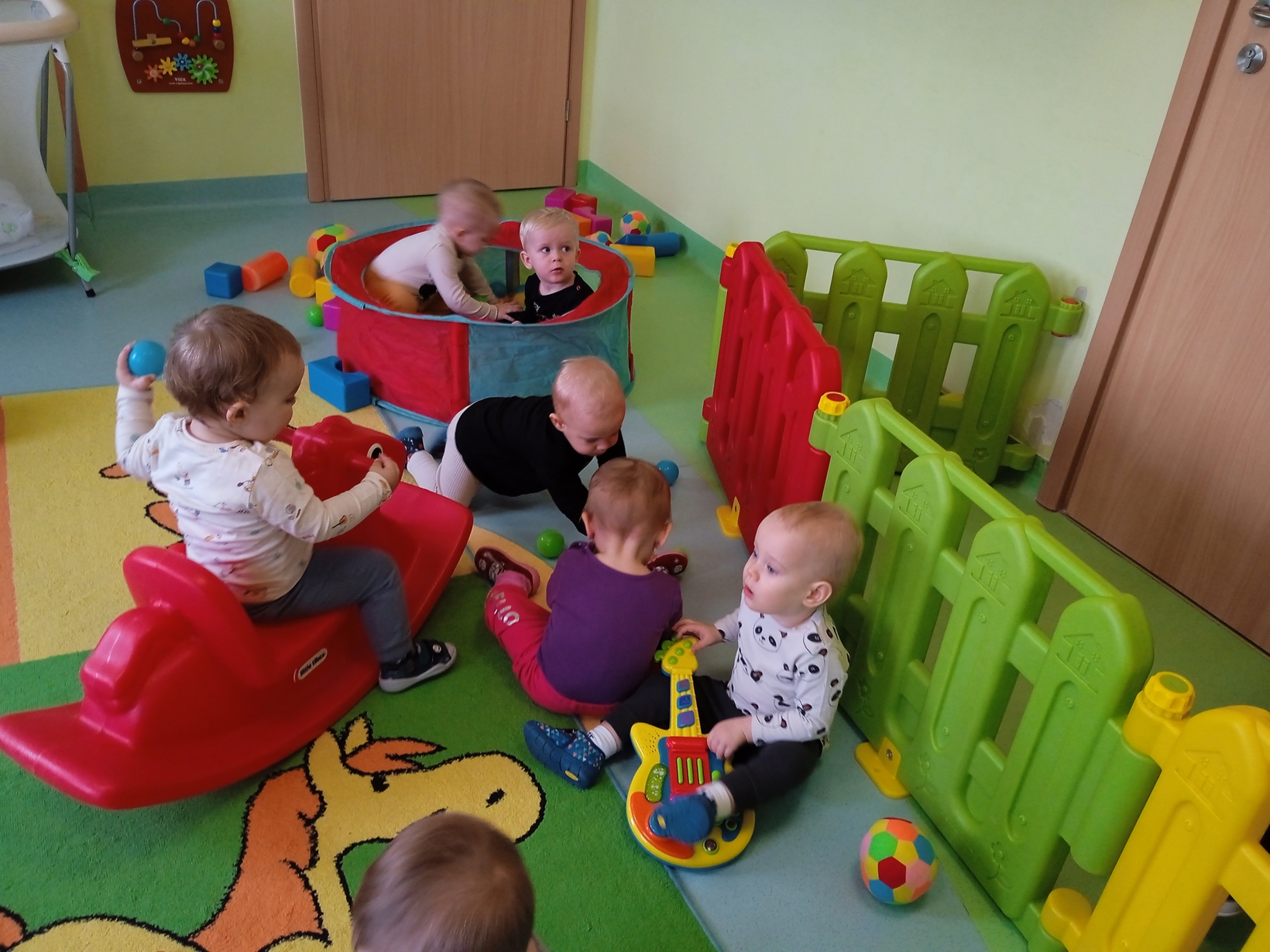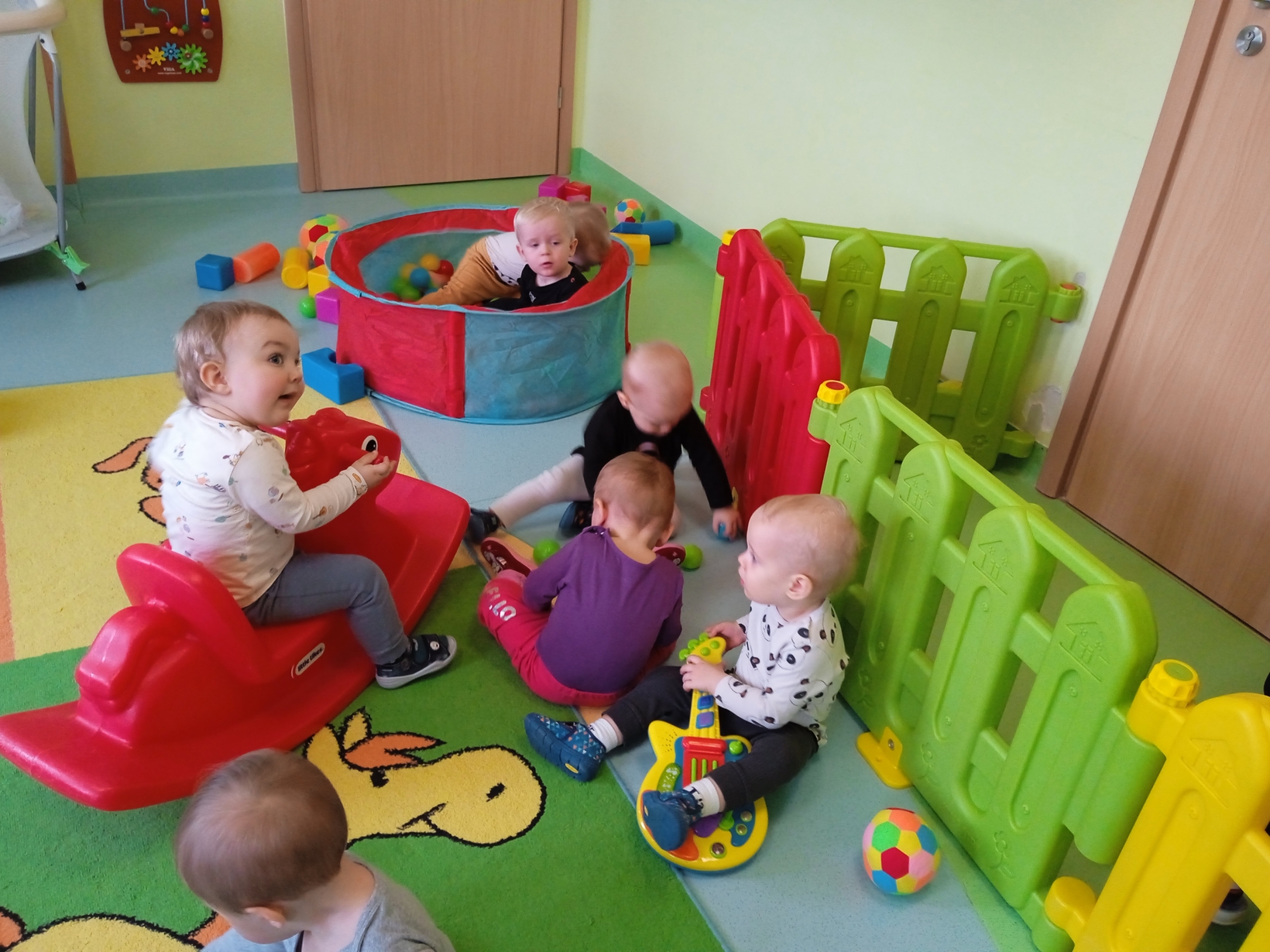 Na zewnątrz deszczowa pogoda. Ciocie urozmaiciły czas dzieciom z grupy ,, Żabki" organizując salę zabaw pełną atrakcji i wesołej zabawy.
