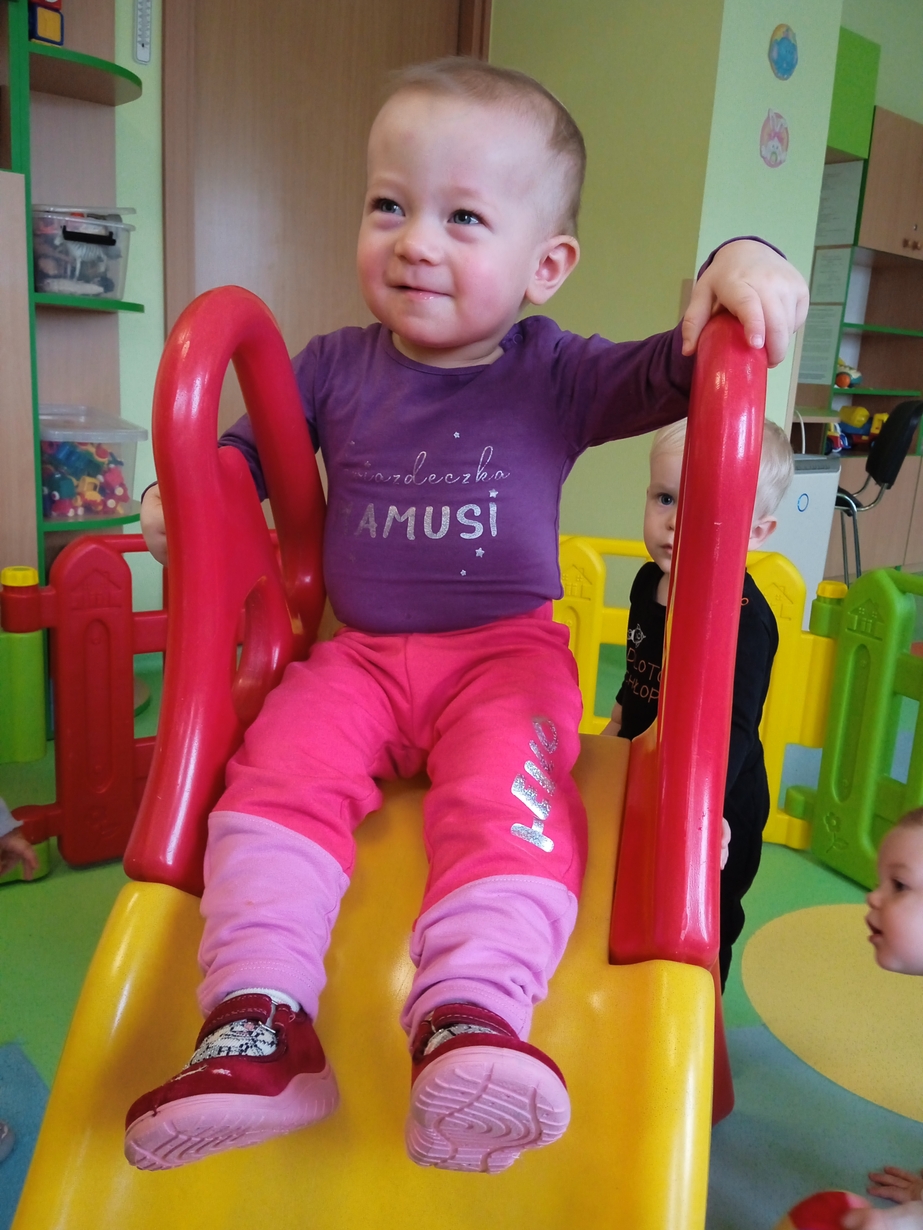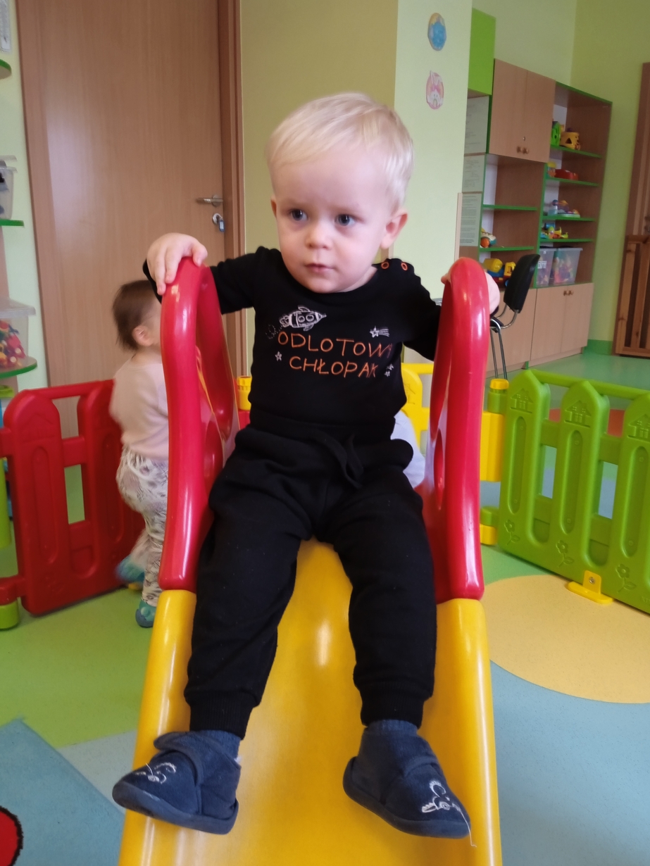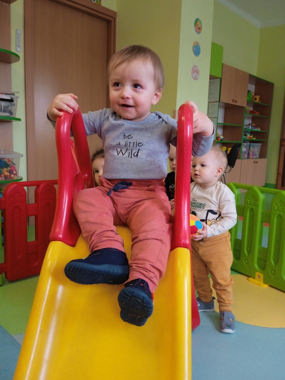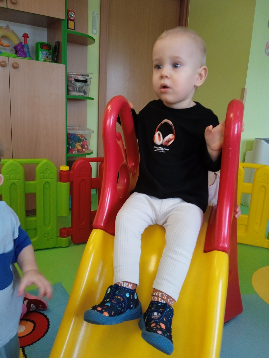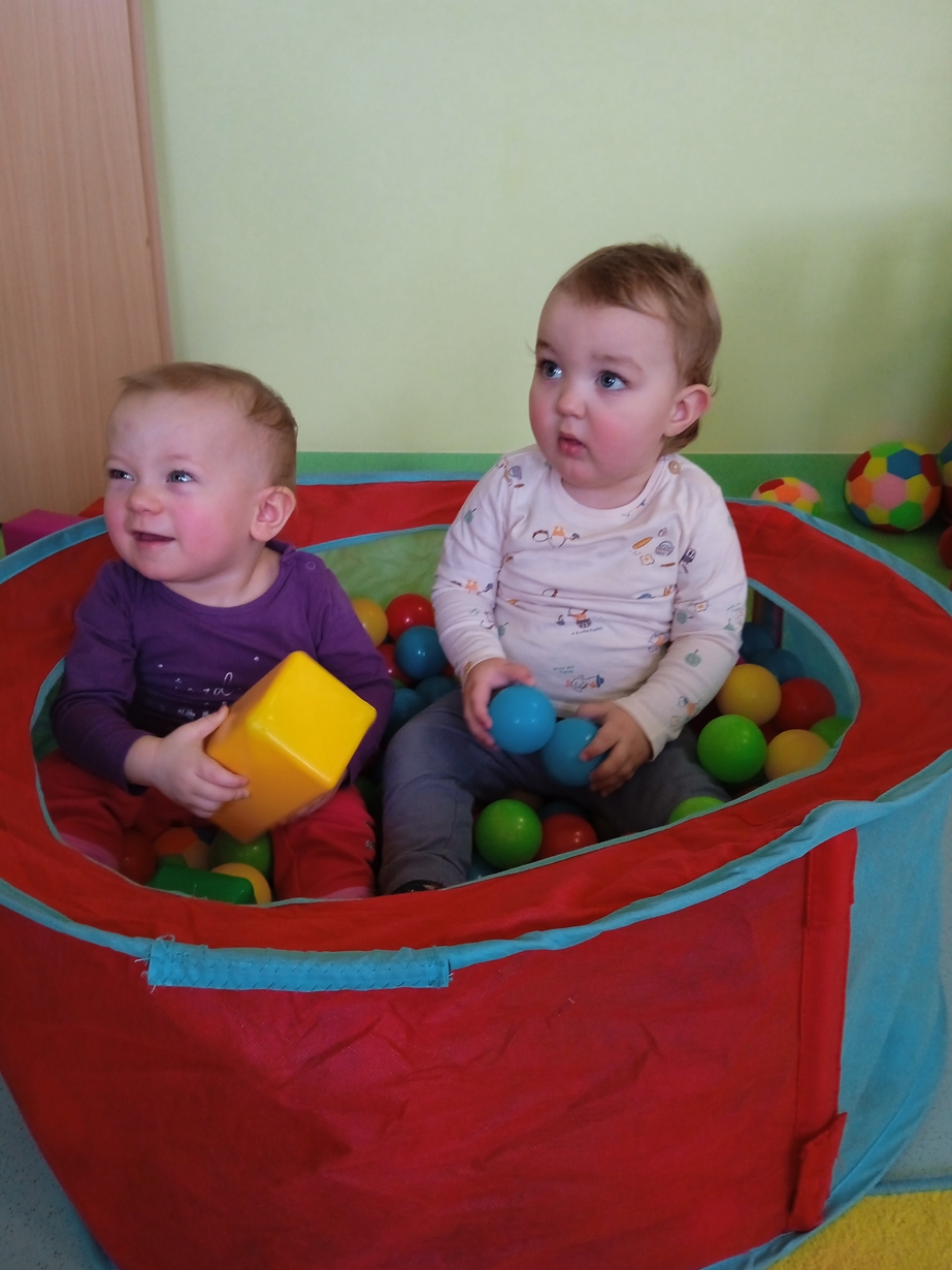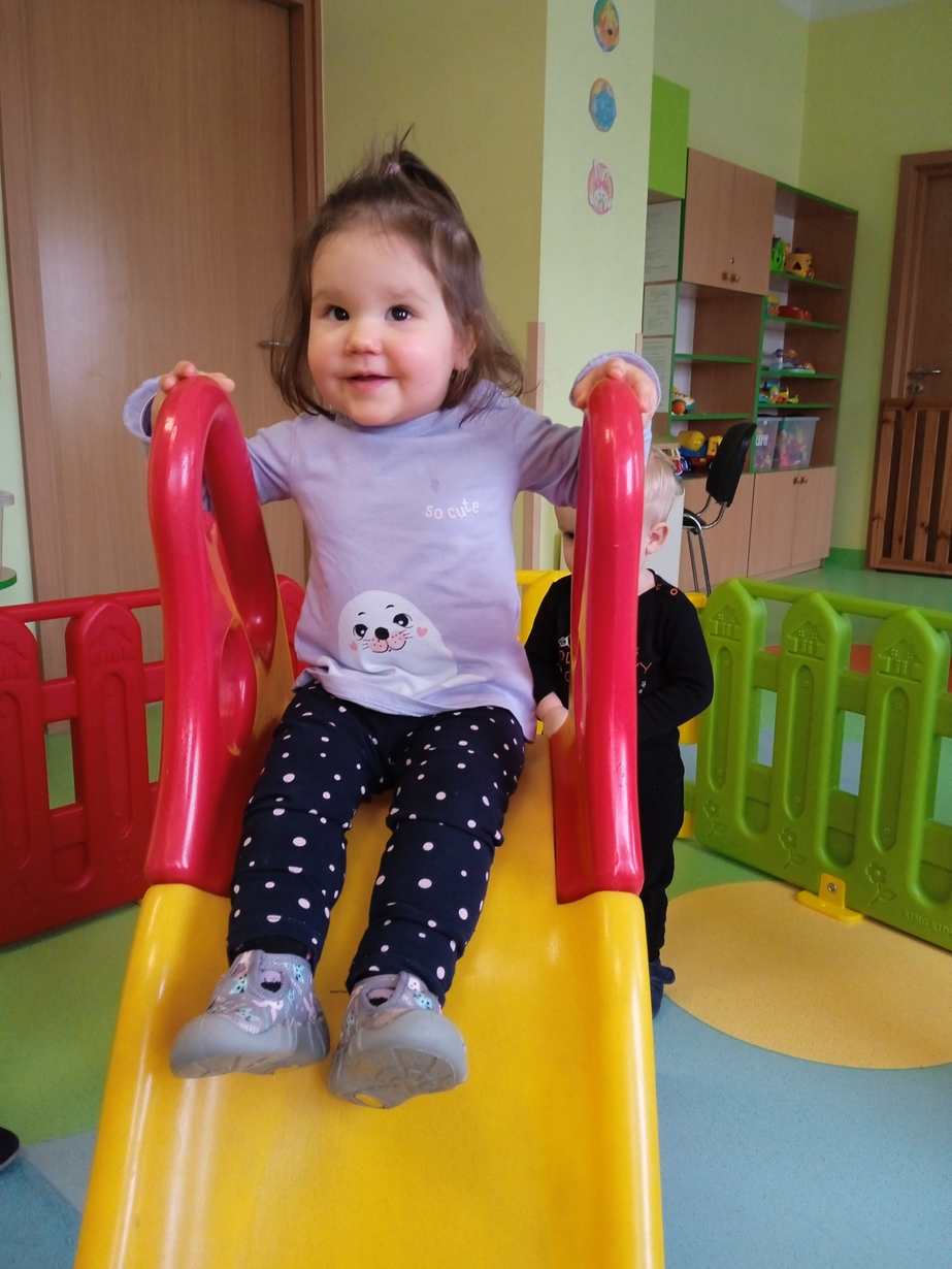 Na zewnątrz deszczowa pogoda. Ciocie urozmaiciły czas dzieciom z grupy ,, Żabki" organizując salę zabaw pełną atrakcji i wesołej zabawy.