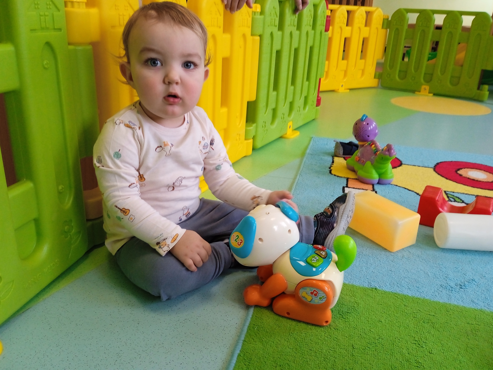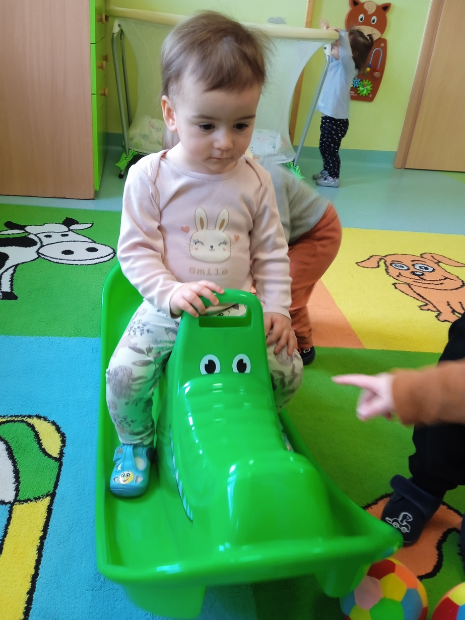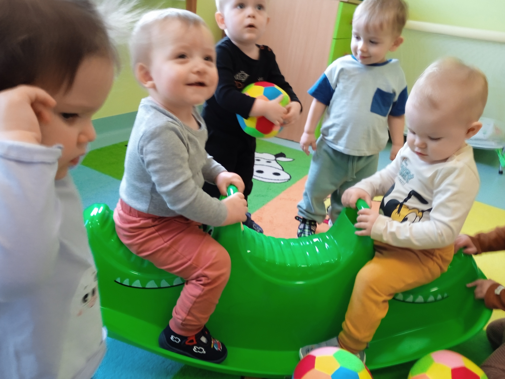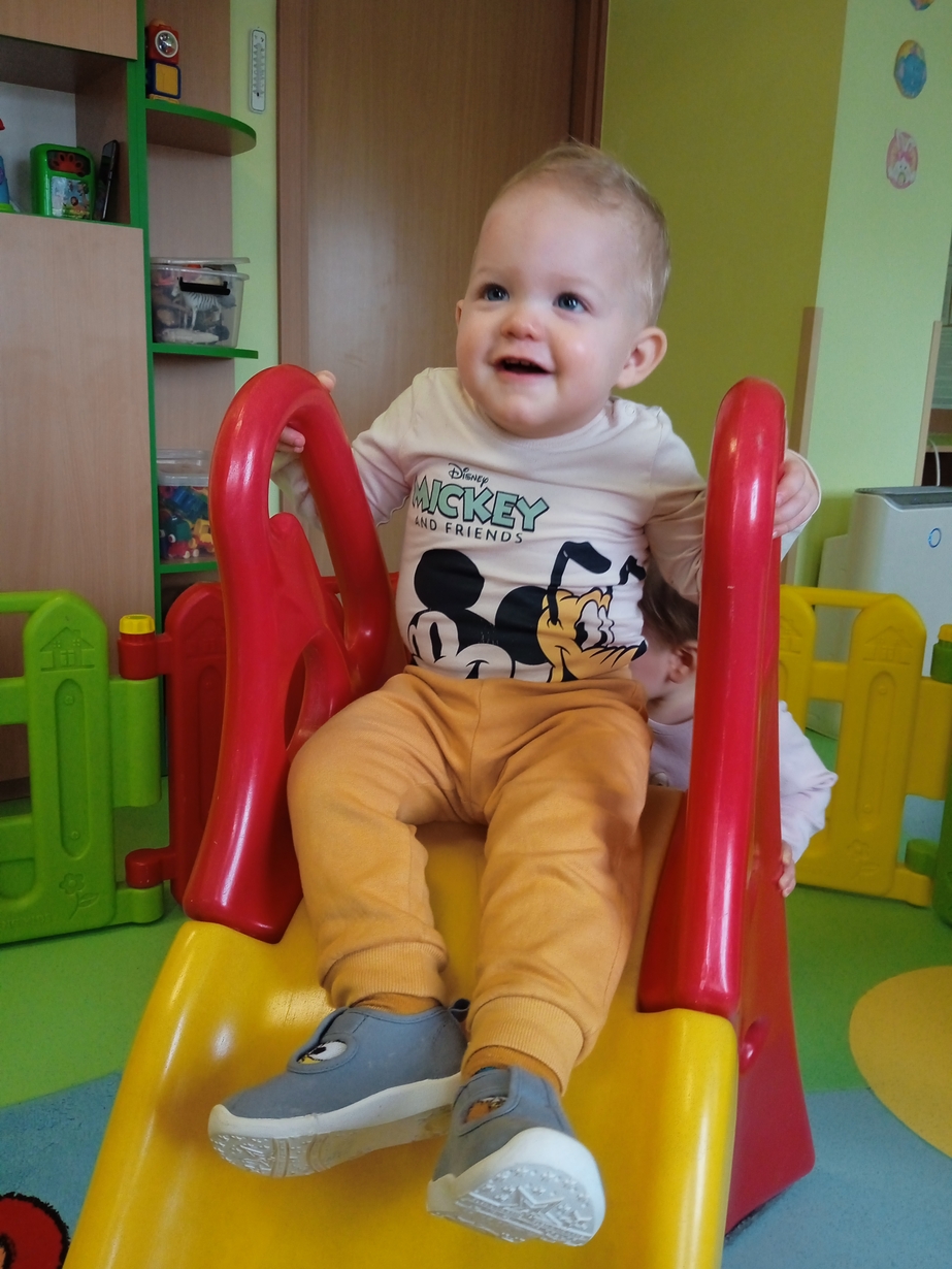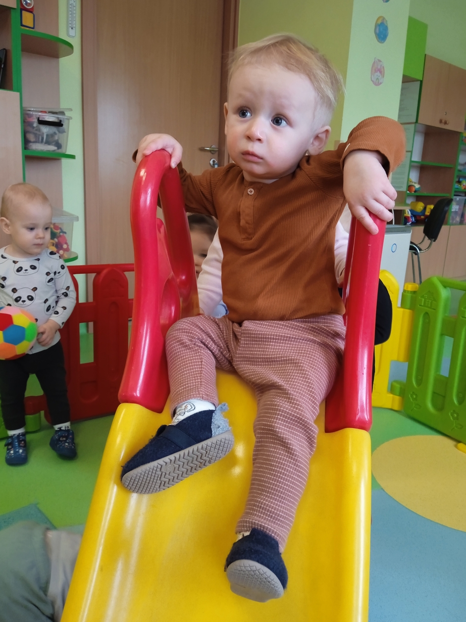 Na zewnątrz deszczowa pogoda. Ciocie urozmaiciły czas dzieciom z grupy ,, Żabki" organizując salę zabaw pełną atrakcji i wesołej zabawy.