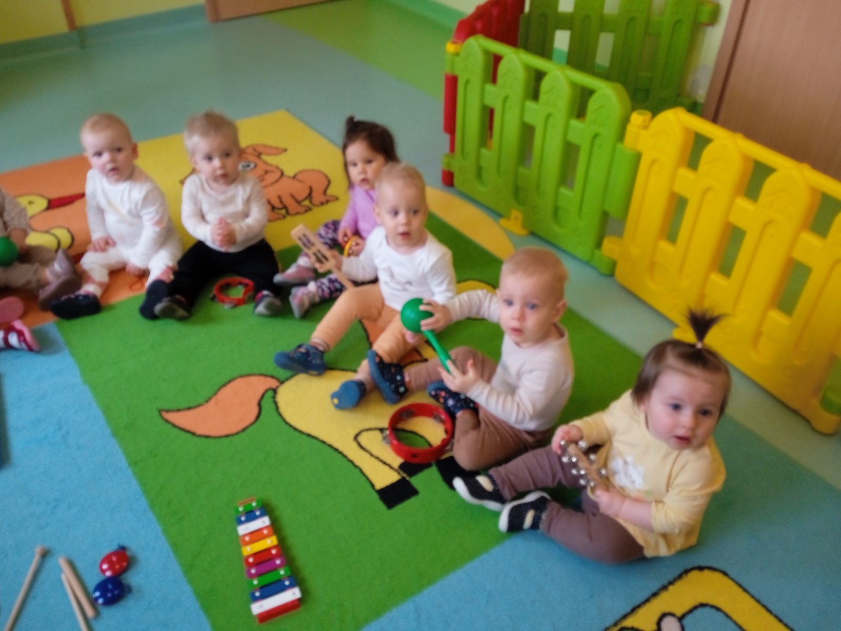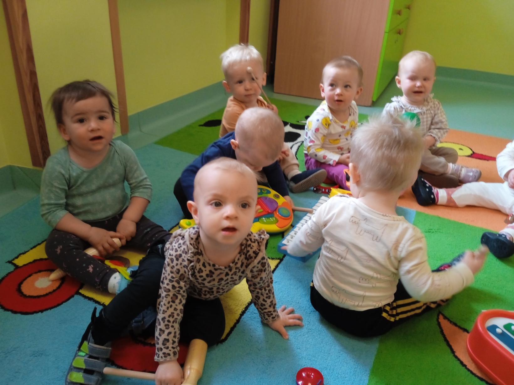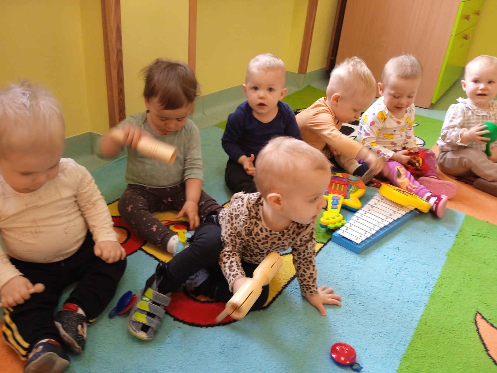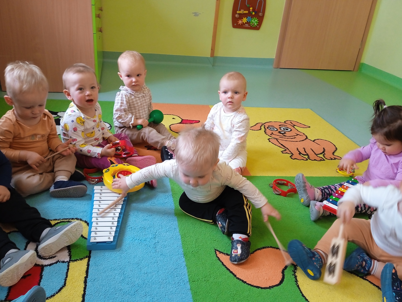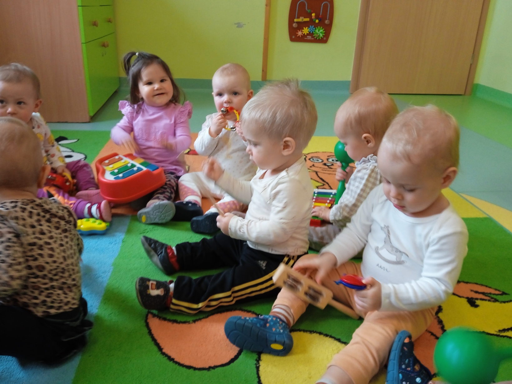 Dzieci z grupy ,,Żabki" miały zajęcia muzyczne.Maluszki zapoznały się z instrumentami muzycznymi, grały na nich ,poznawały jakie wydają dźwięki.