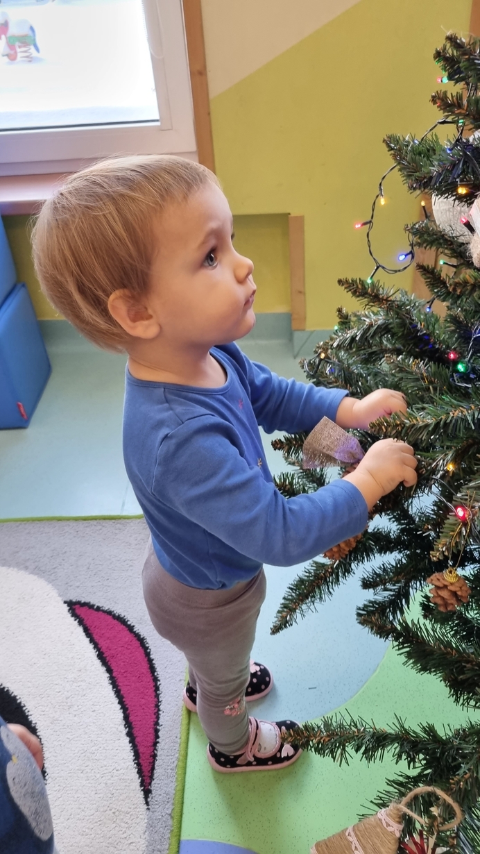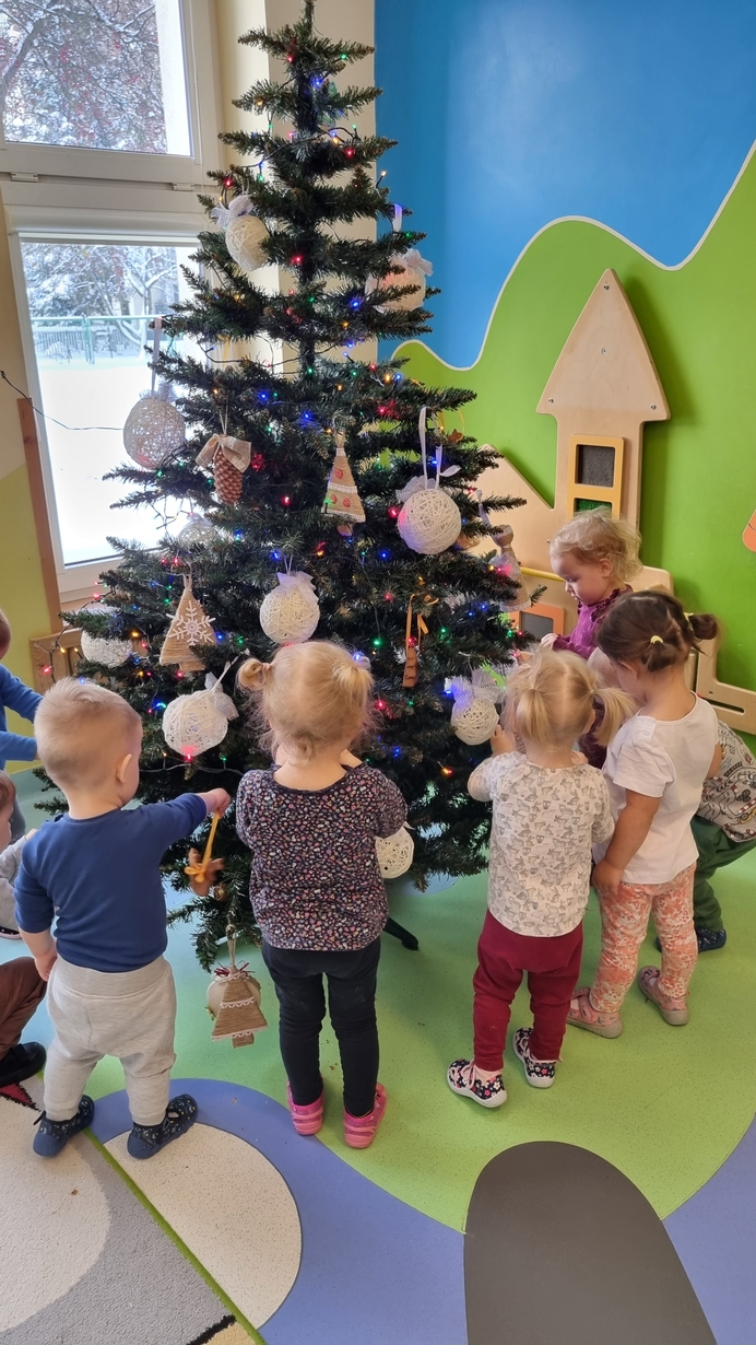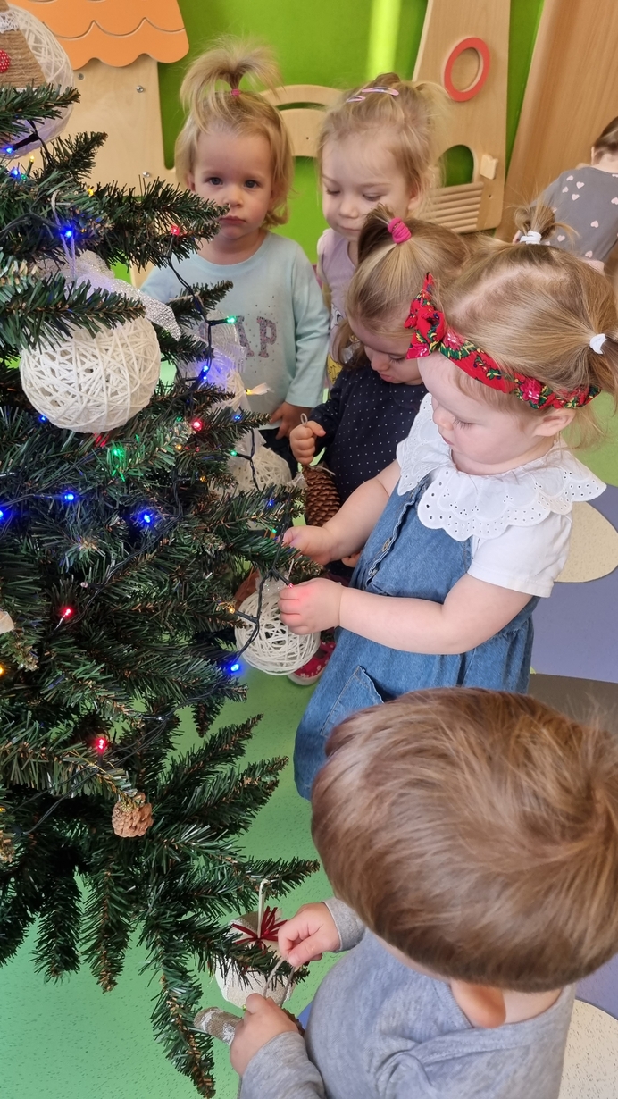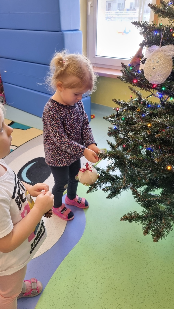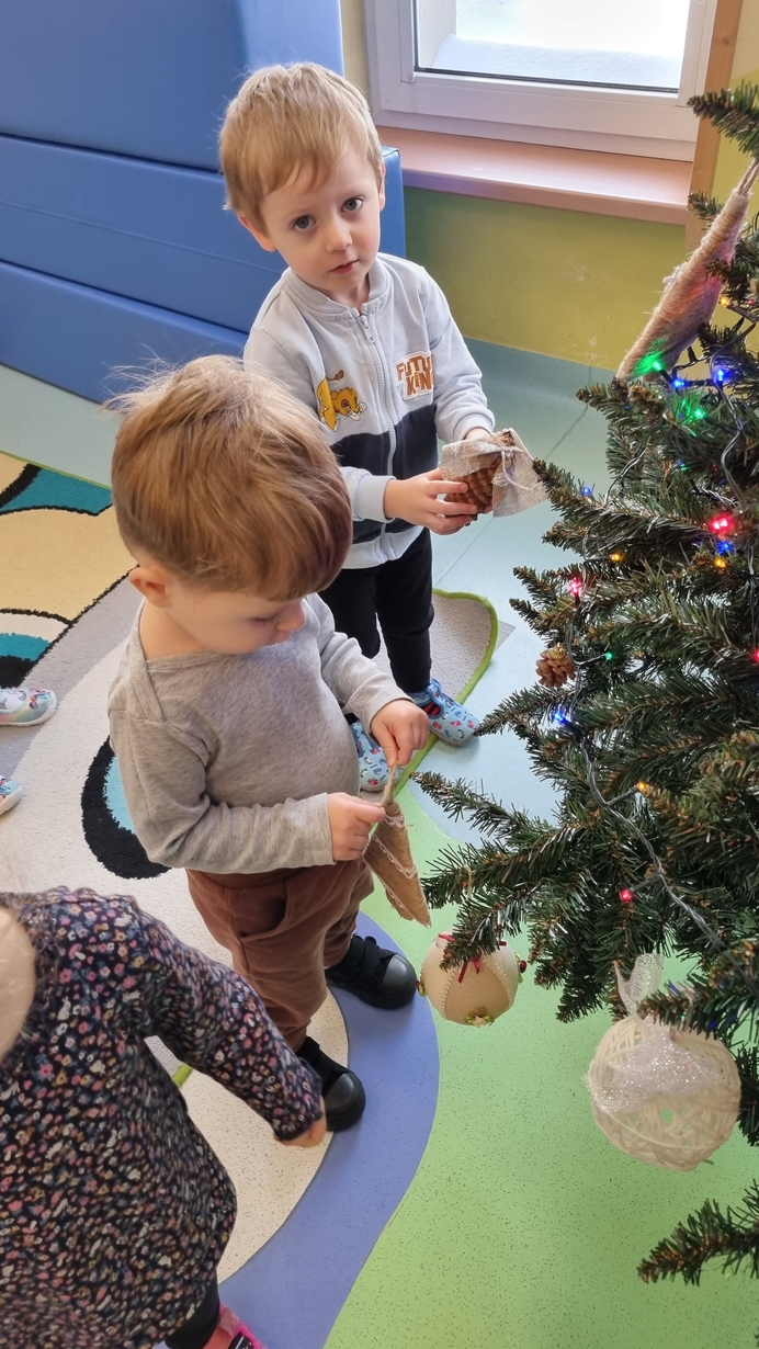 Dzieci z grupy Muchomorów na początku grudnia zaangażowały się w strojenie naszej wspólnej choinki,