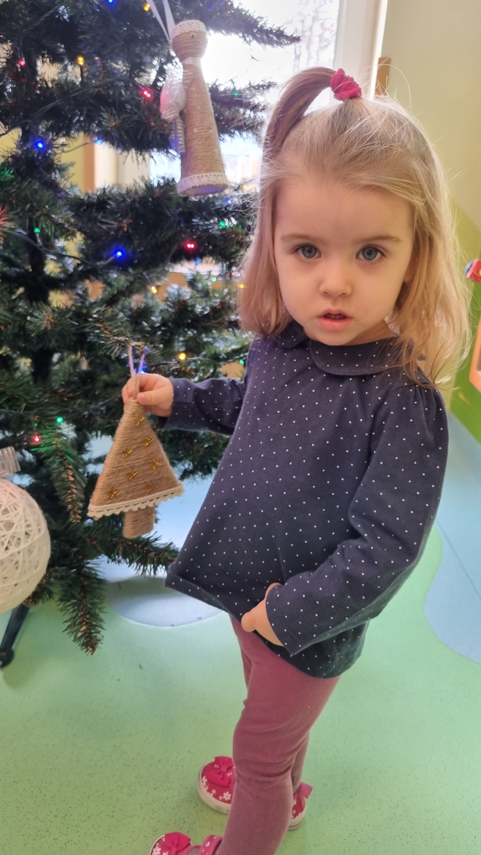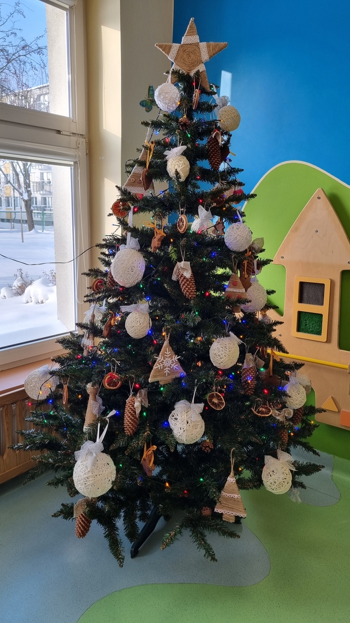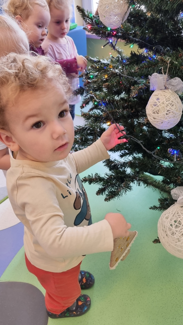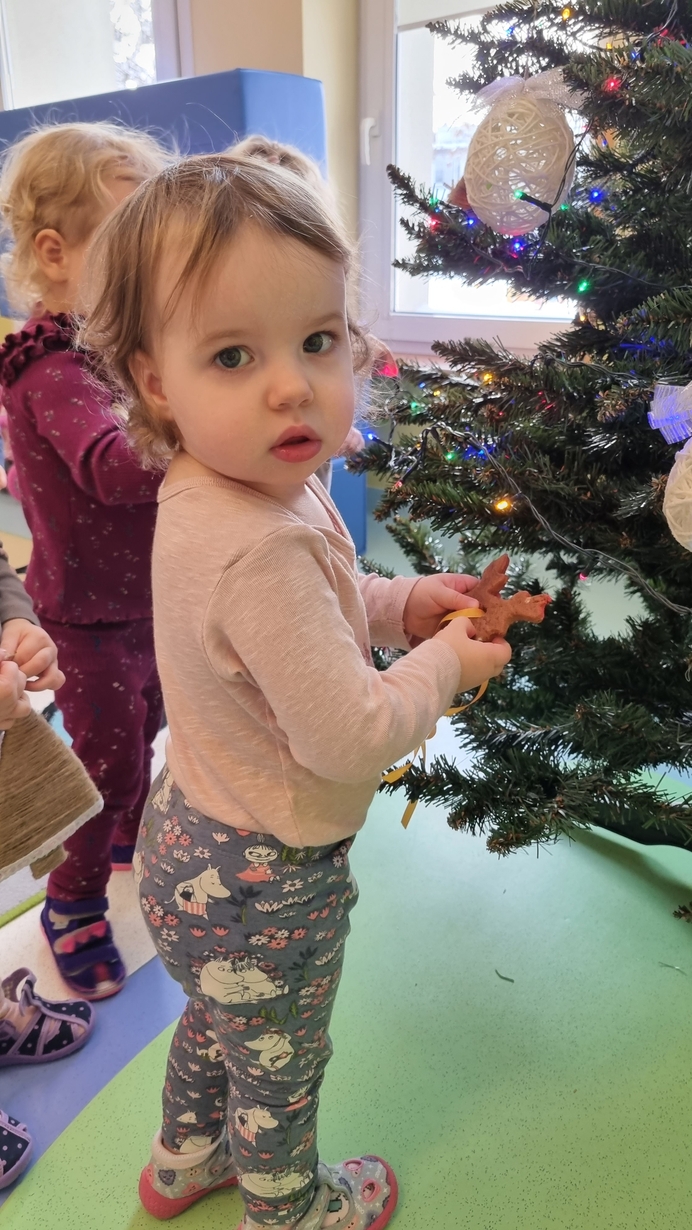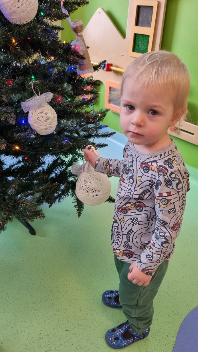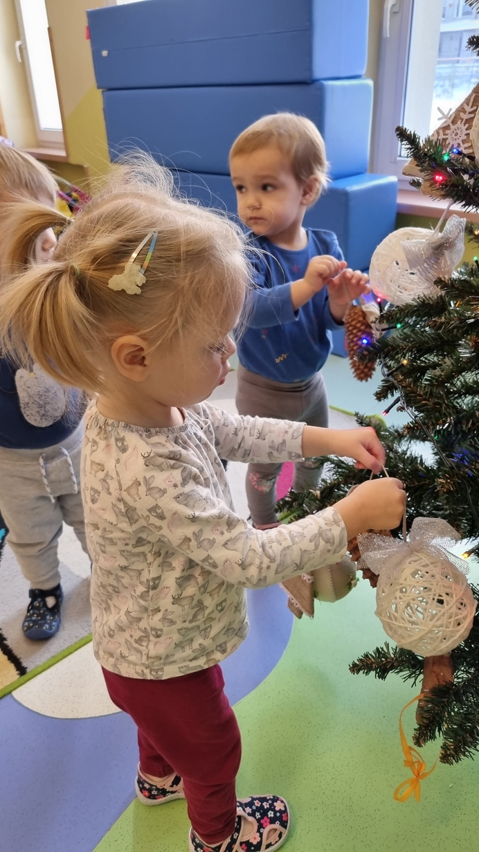 Dzieci z grupy Muchomorów na początku grudnia zaangażowały się w strojenie naszej wspólnej choinki,
