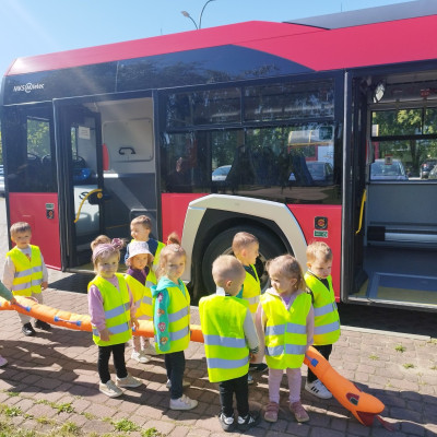 Zdjęcie przedstawia dzieci podczas zwiedzania miejskiego autobusu