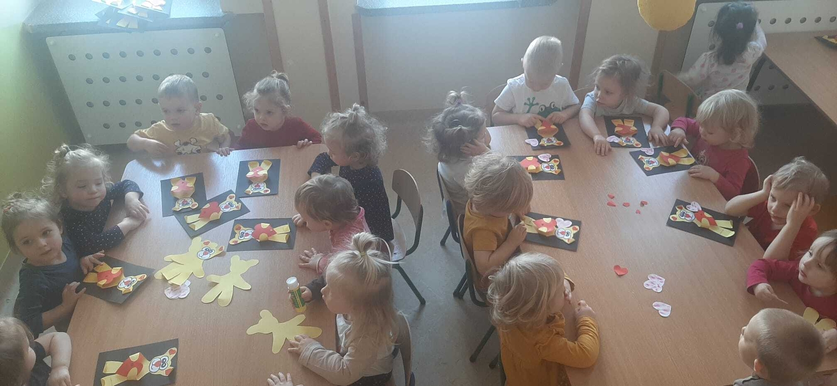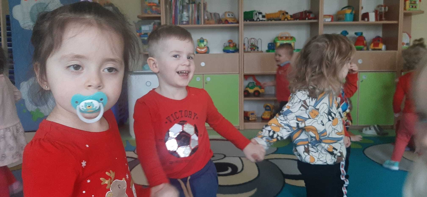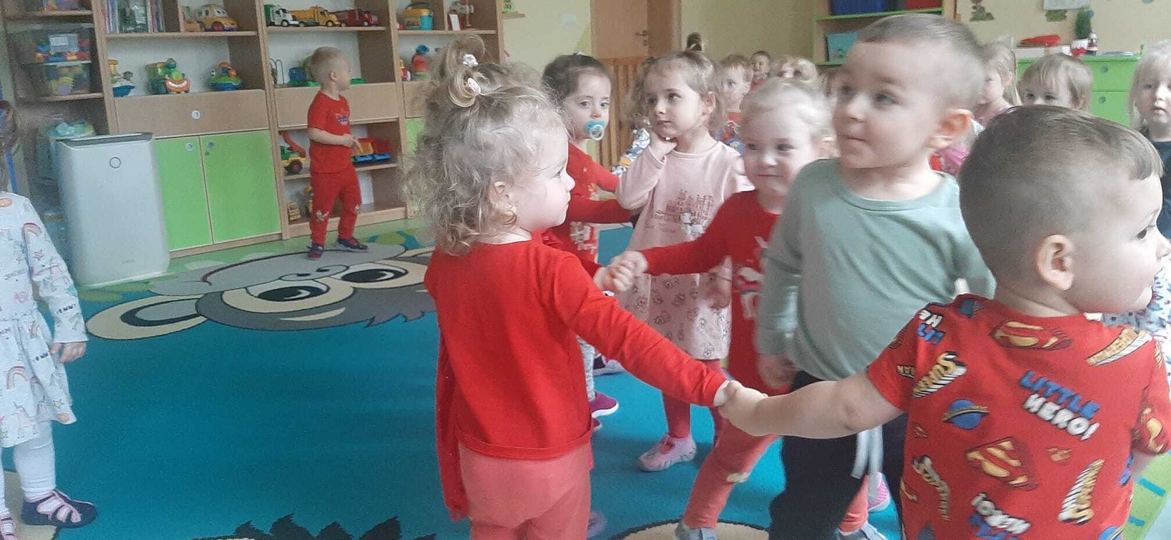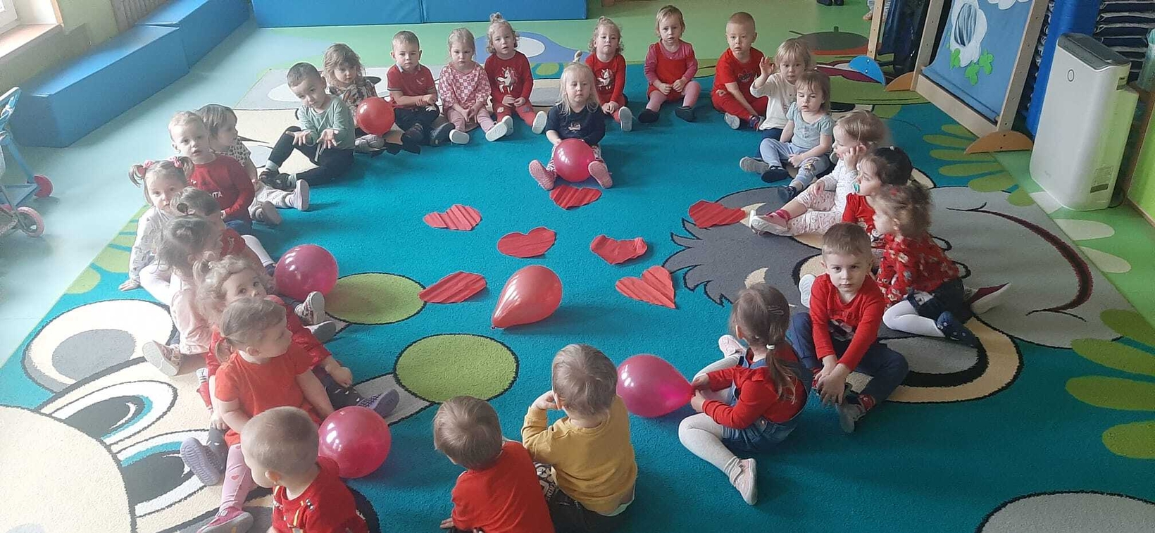 Radosna zabawa taneczna z okazji "WALENTYNEK".Nasze muchomorki w czerwonych strojach bawiły się przy dźwiękach muzyki.Od kilku dni trwały przygotowania do tego święta. Z tej okazji dzieci ozdabiały misia różnego rodzaju serduszkami.
