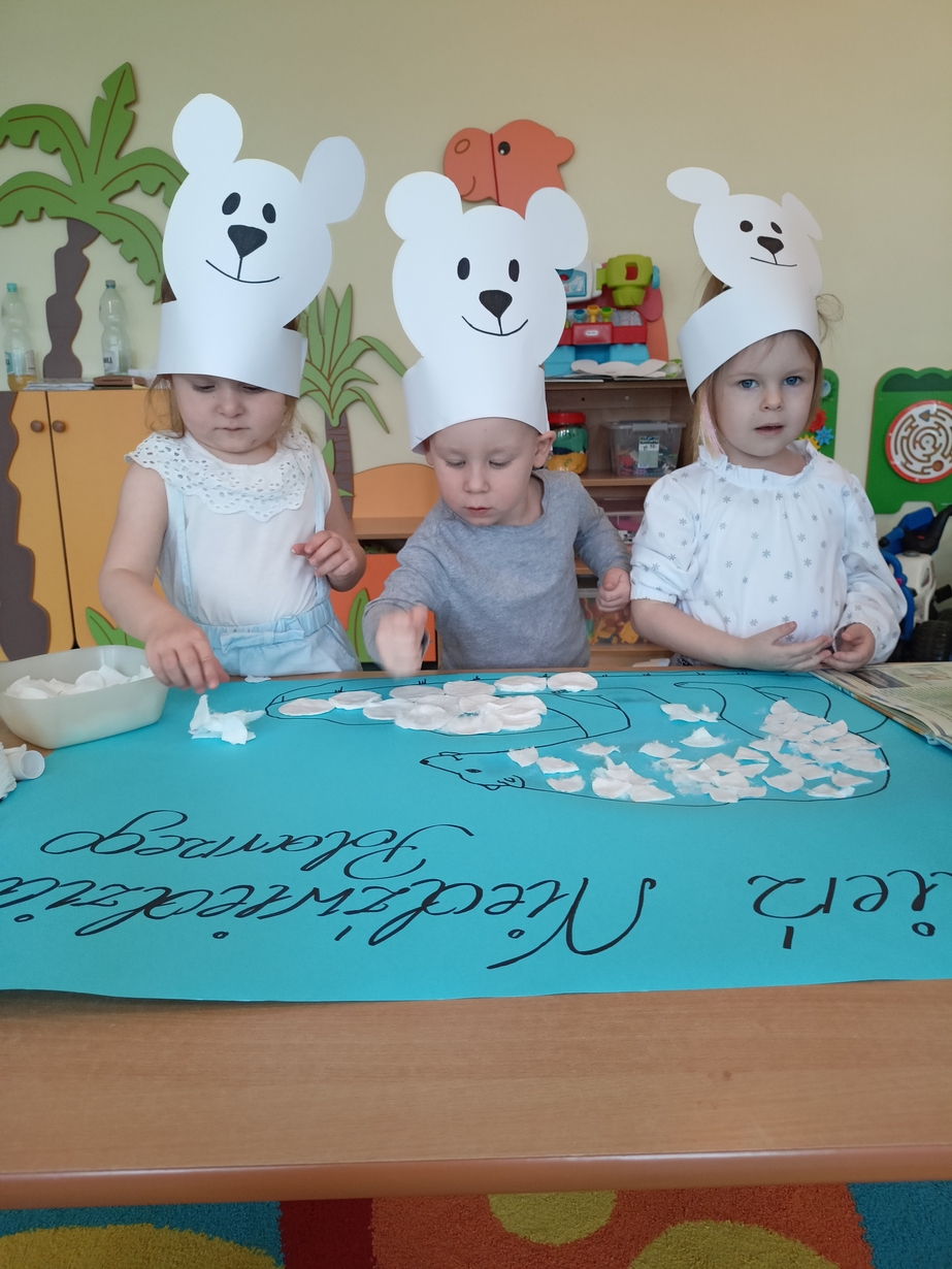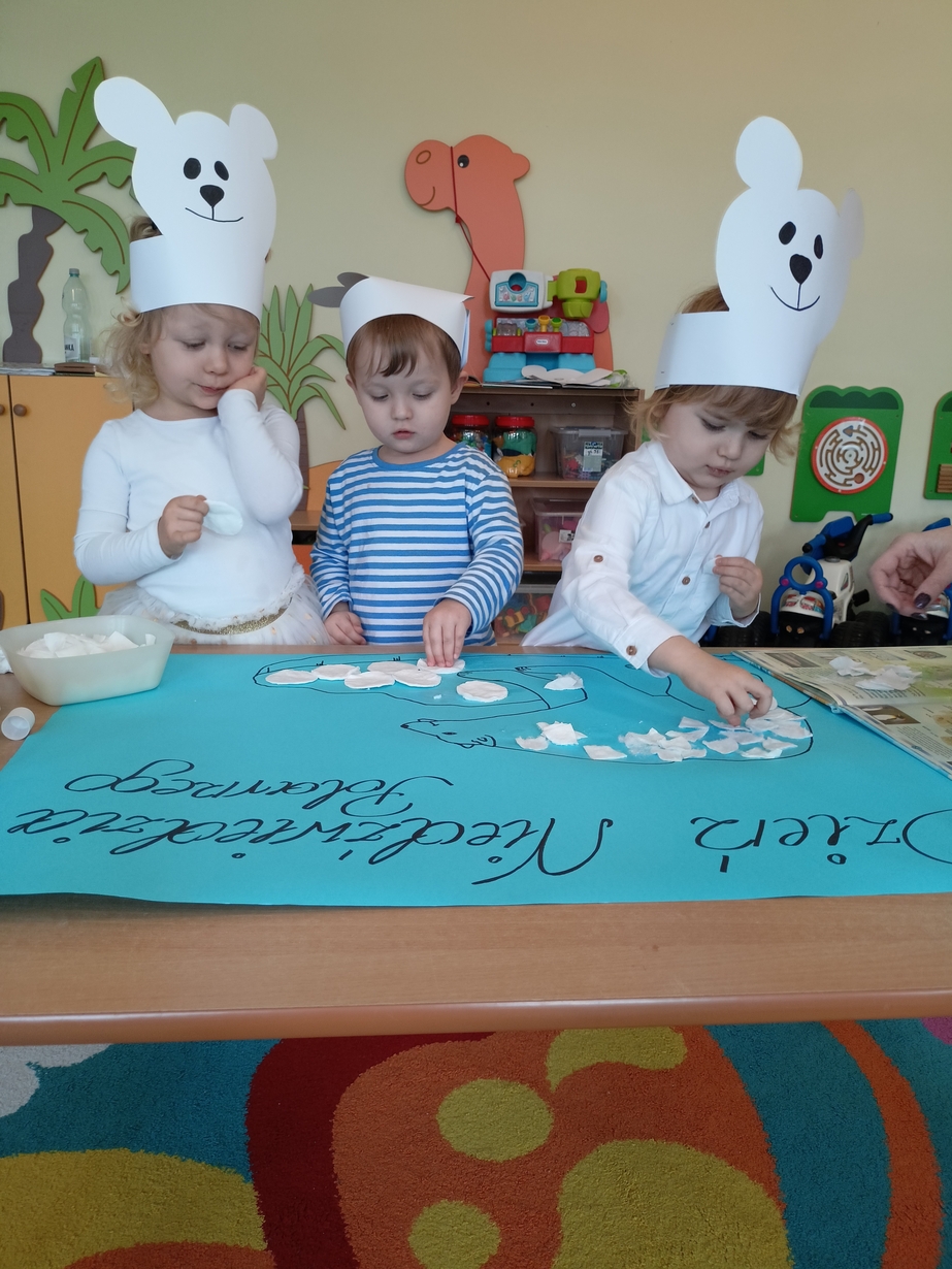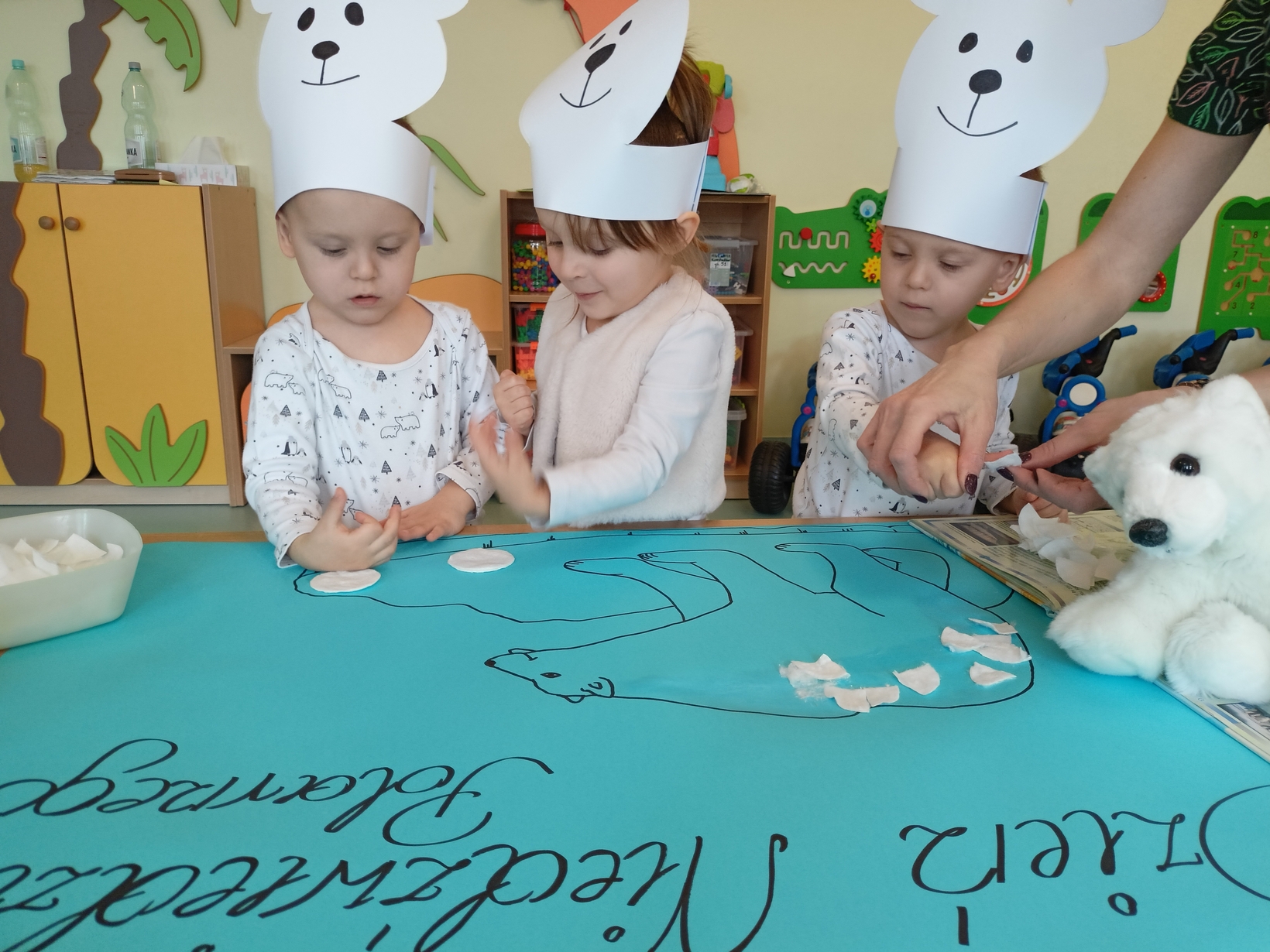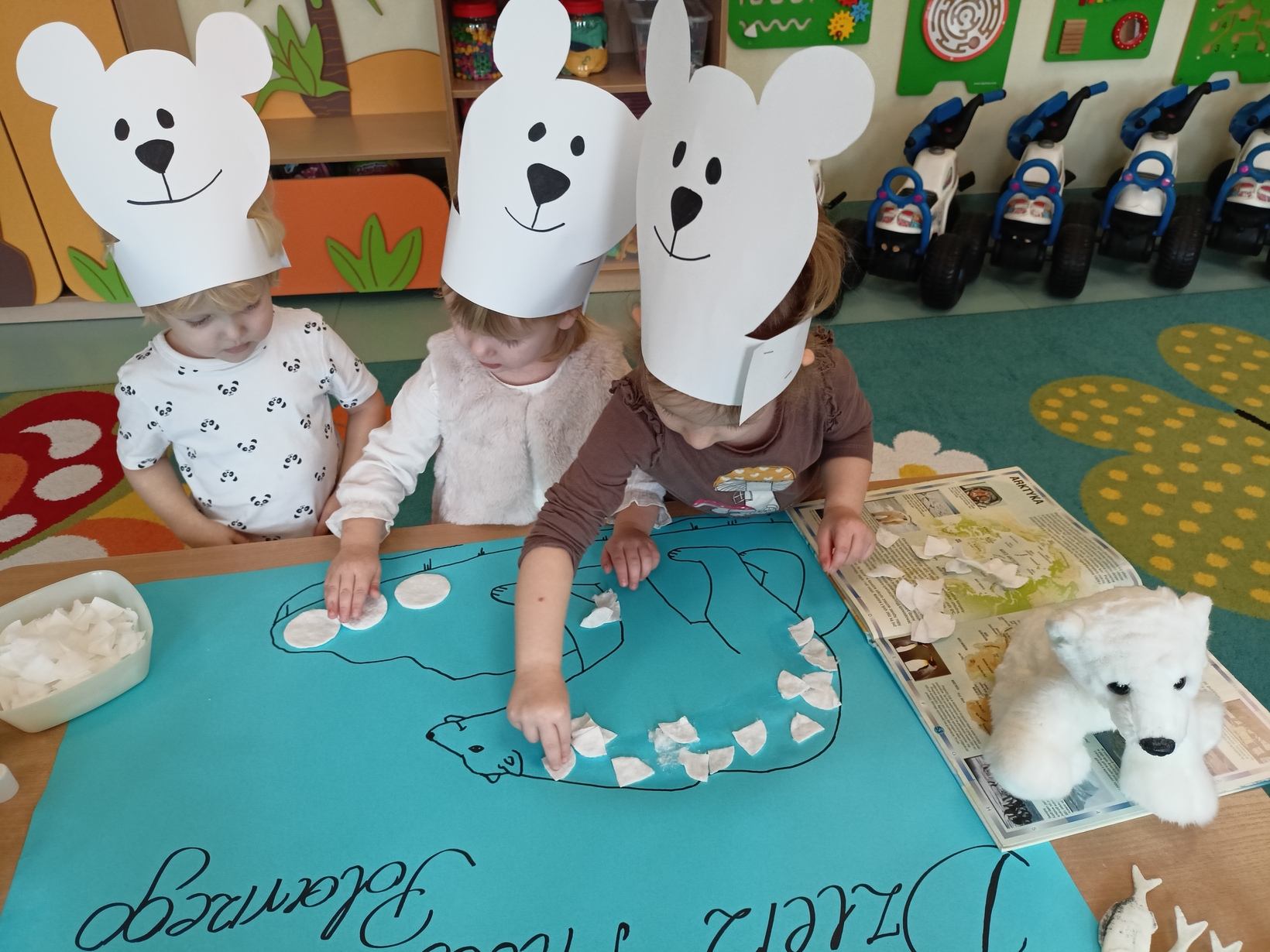 praca zespołowa, aktywność ruchowa i twórcza. Dzieci z grupy "Pszczółki" podczas zajęć wyklejały niedźwiedzia polsrnego.