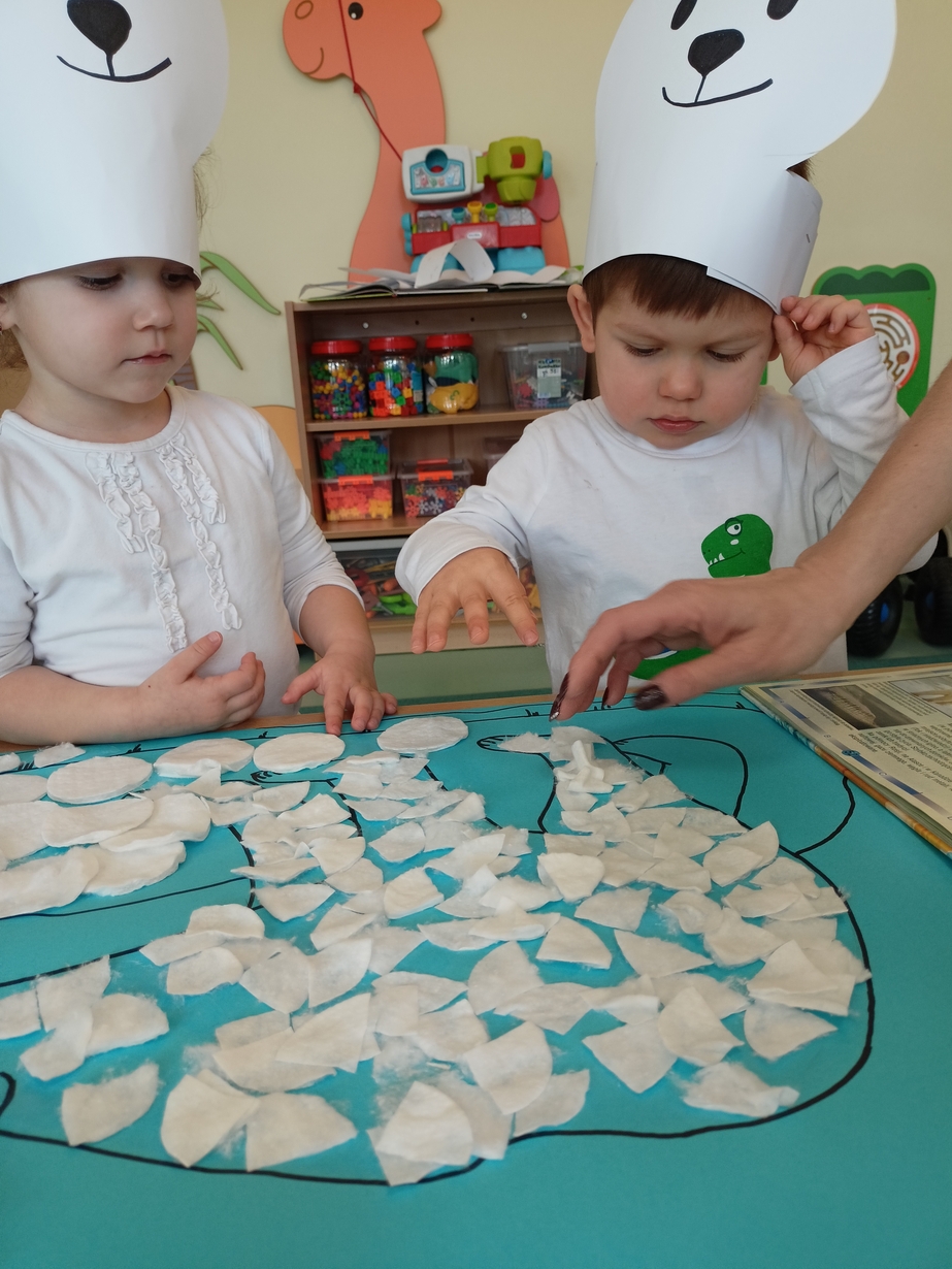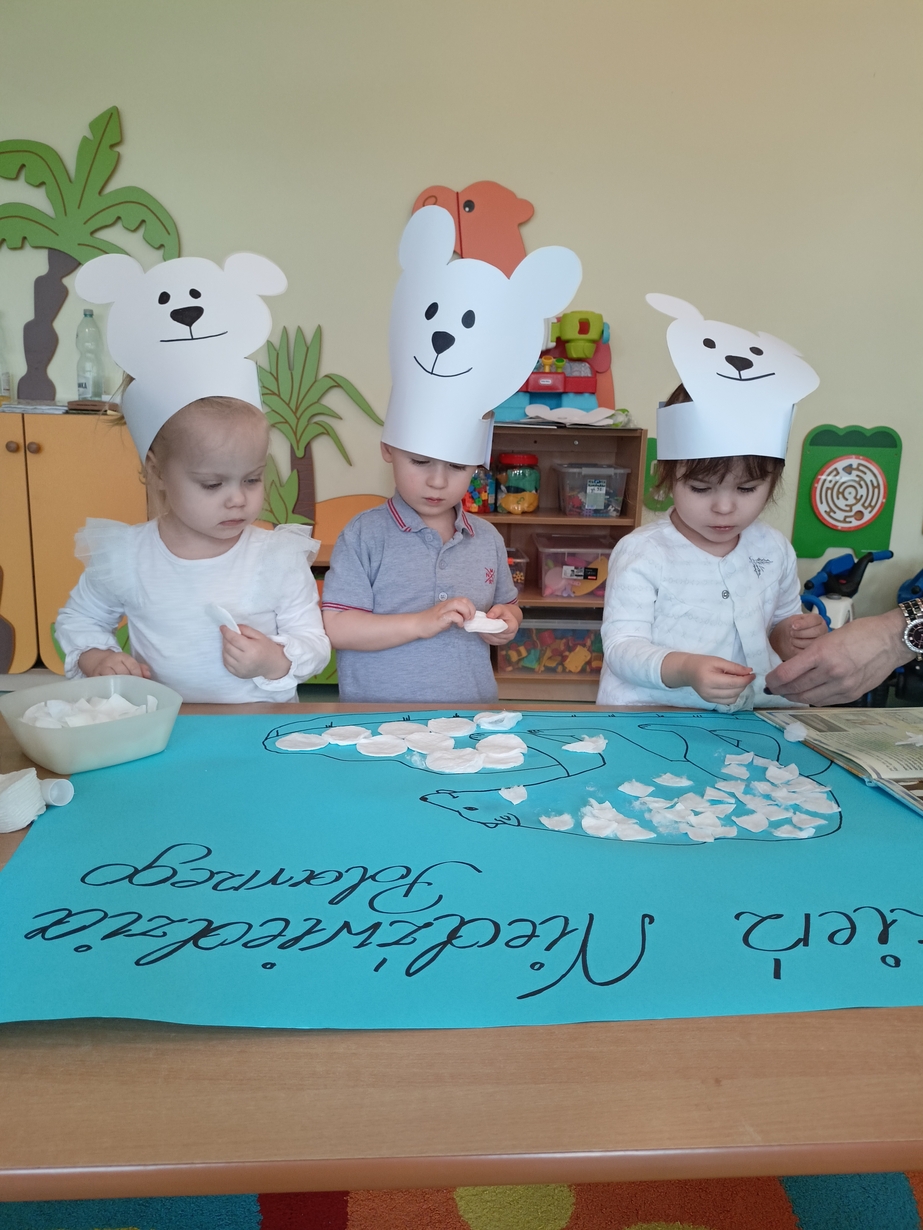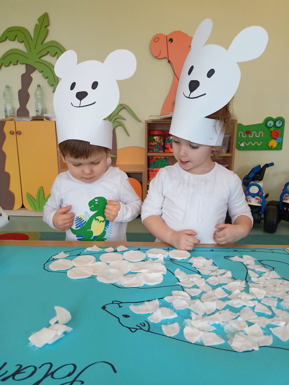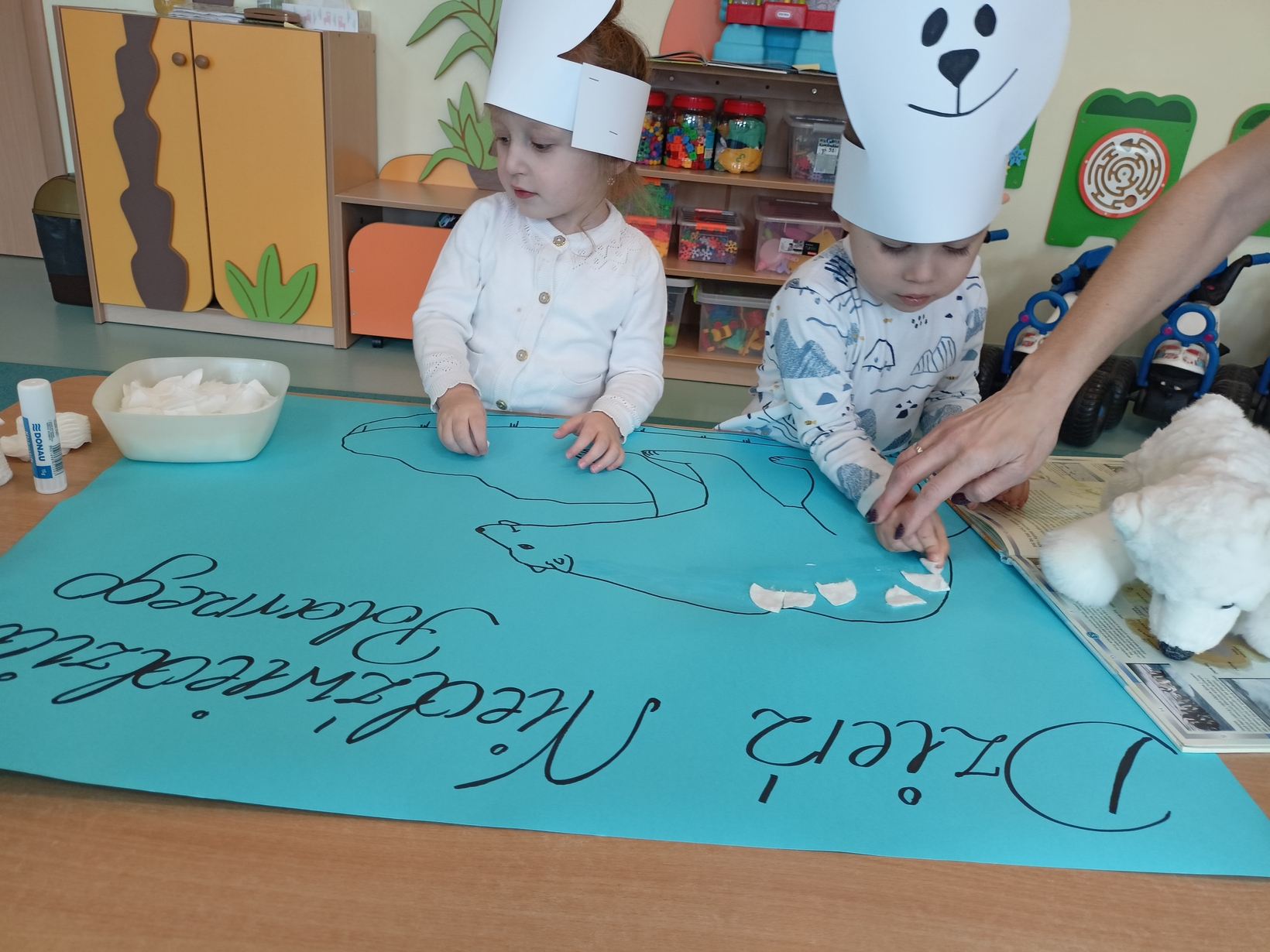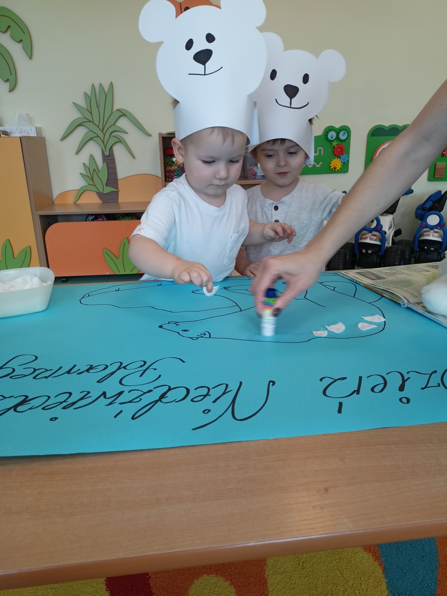 praca zespołowa, aktywność ruchowa i twórcza. Dzieci z grupy "Pszczółki" podczas zajęć wyklejały niedźwiedzia polsrnego.