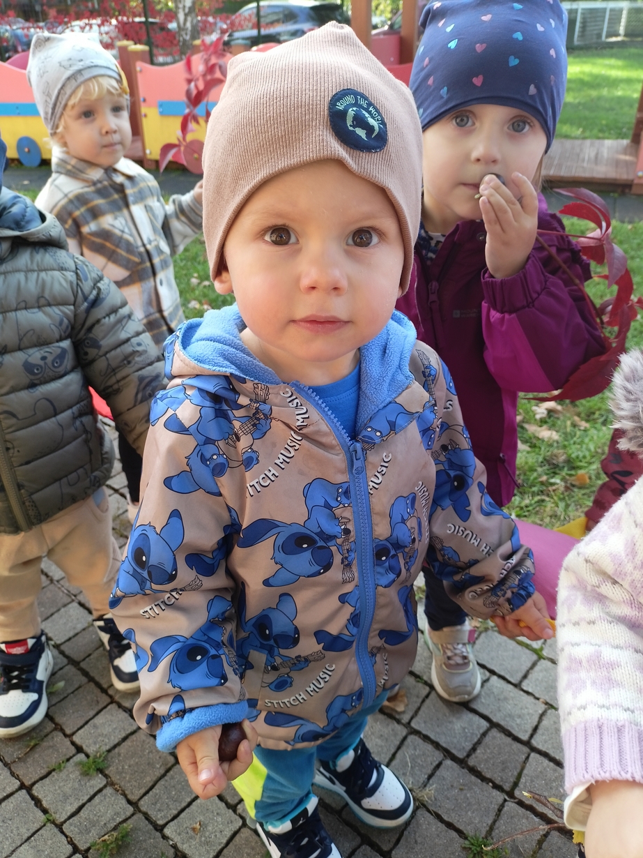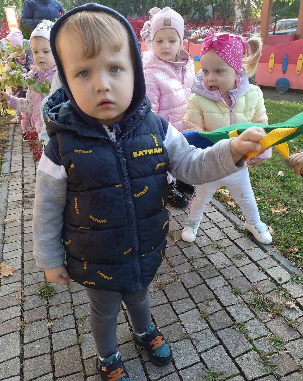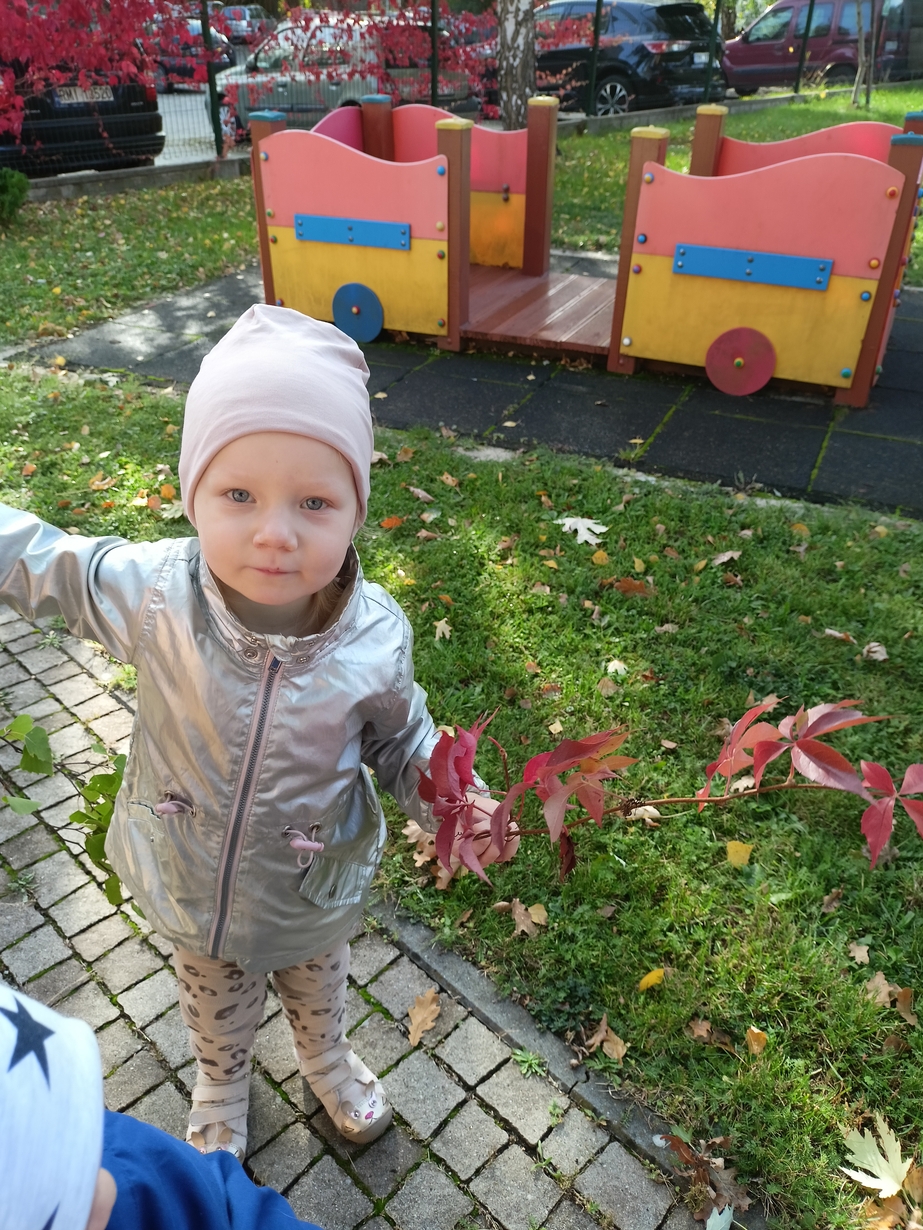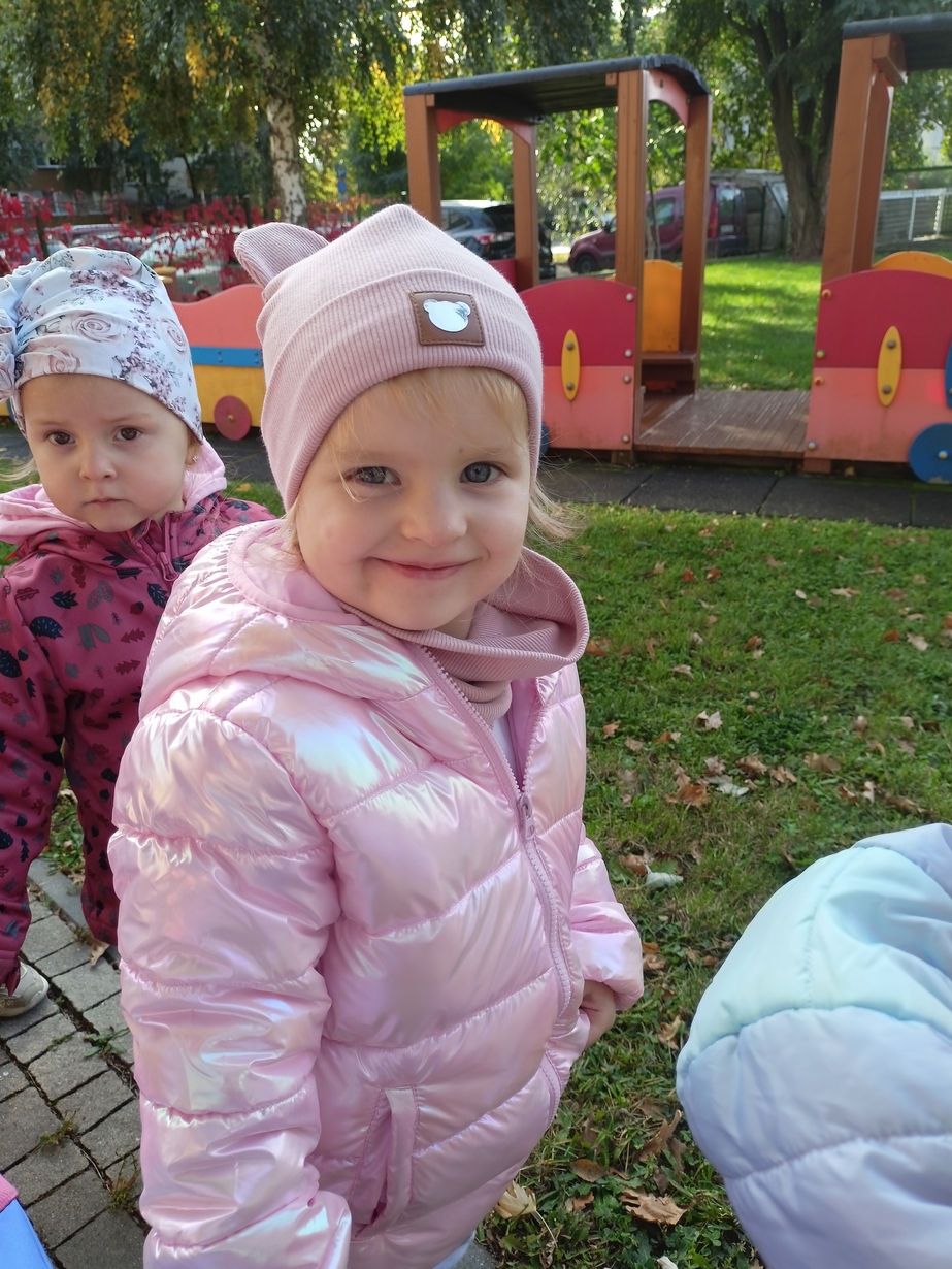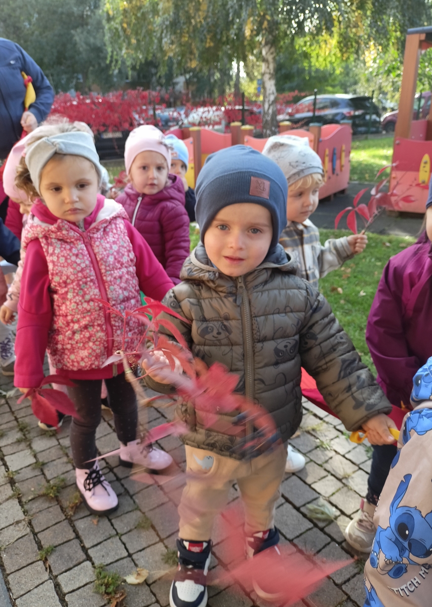 Dzieci z grupy"Pszczółki" wybrały się że śpiewem na spacer w poszukiwaniu oznak jesieni. Piękna pogoda jak i humor dopisywały dzieciom.