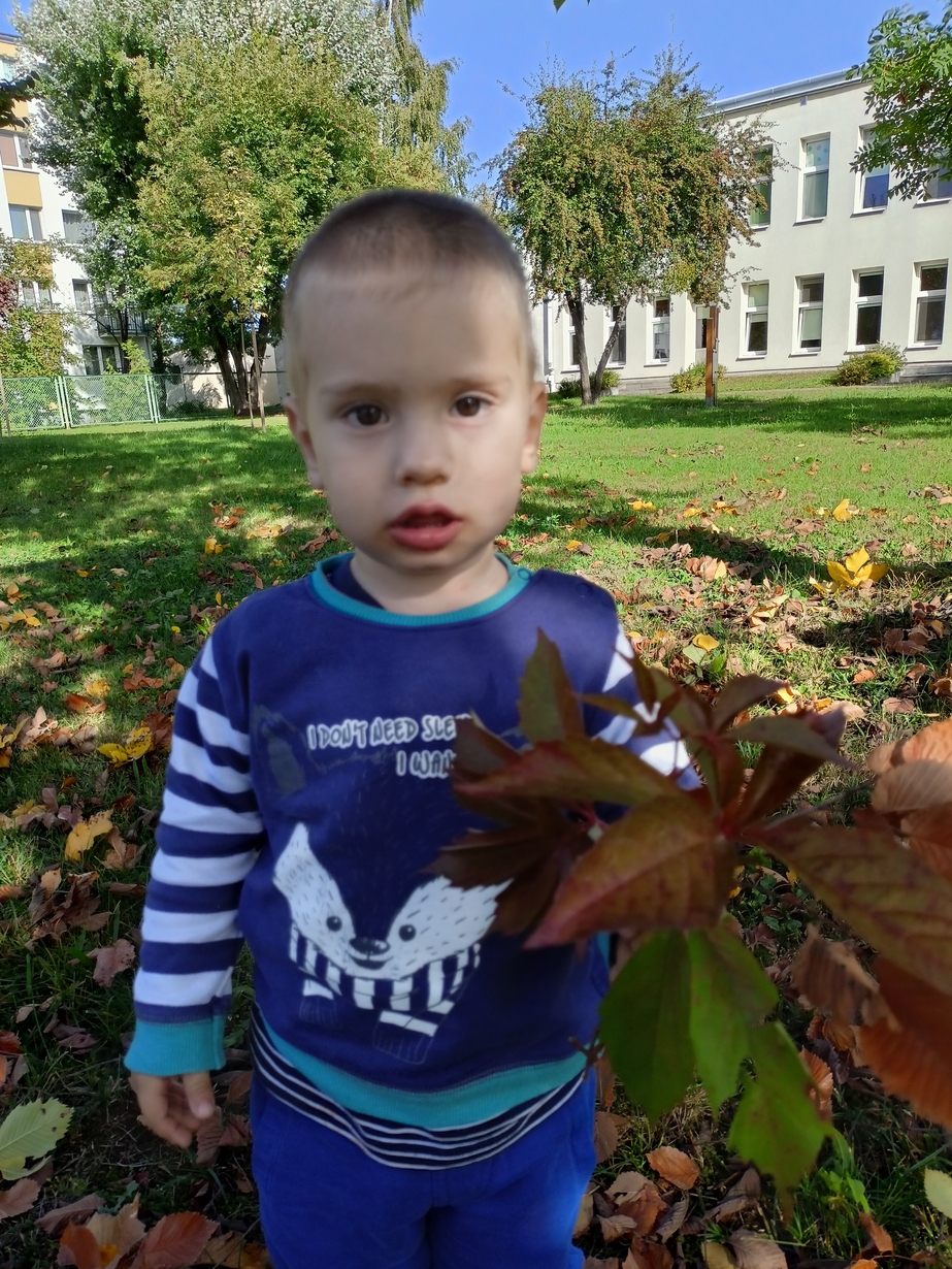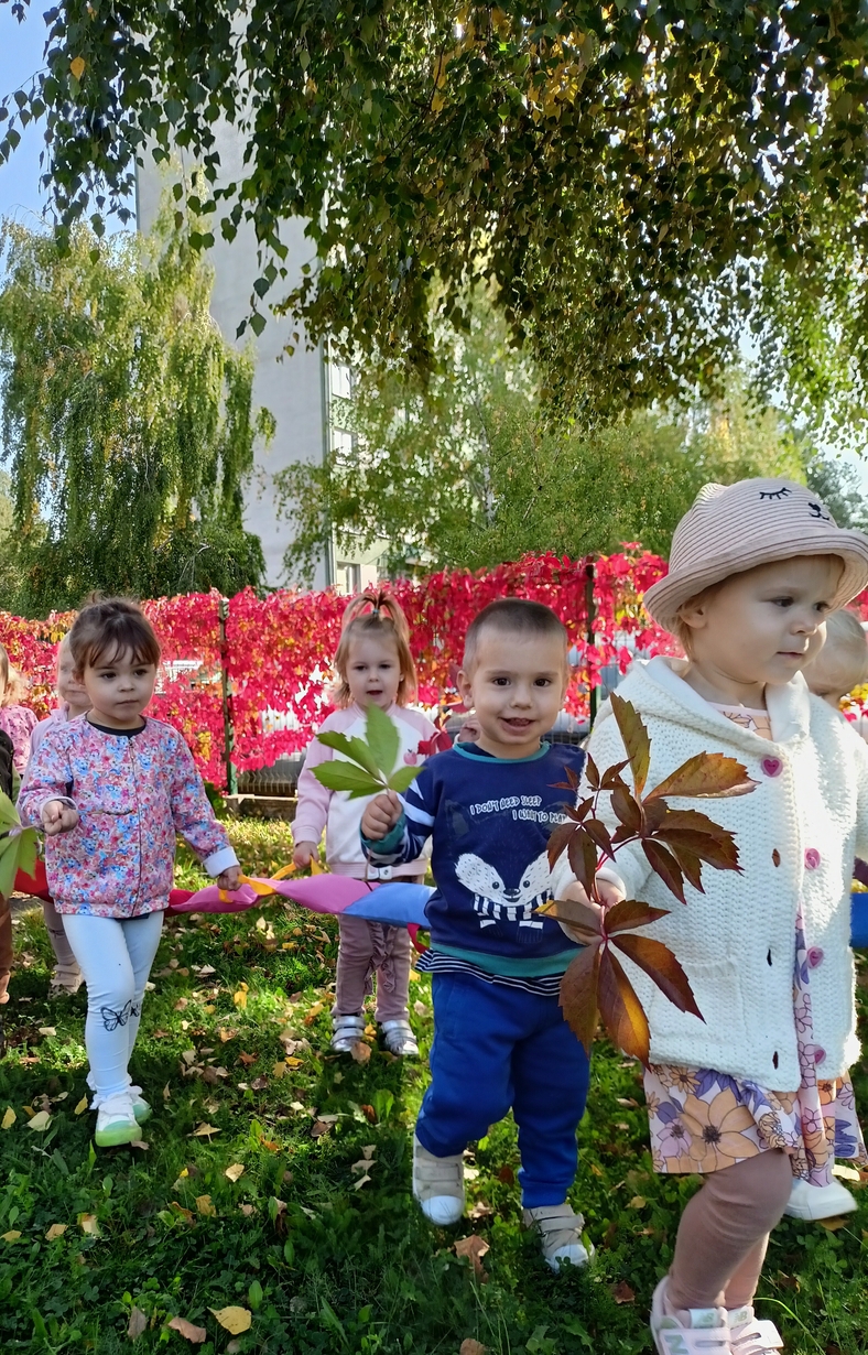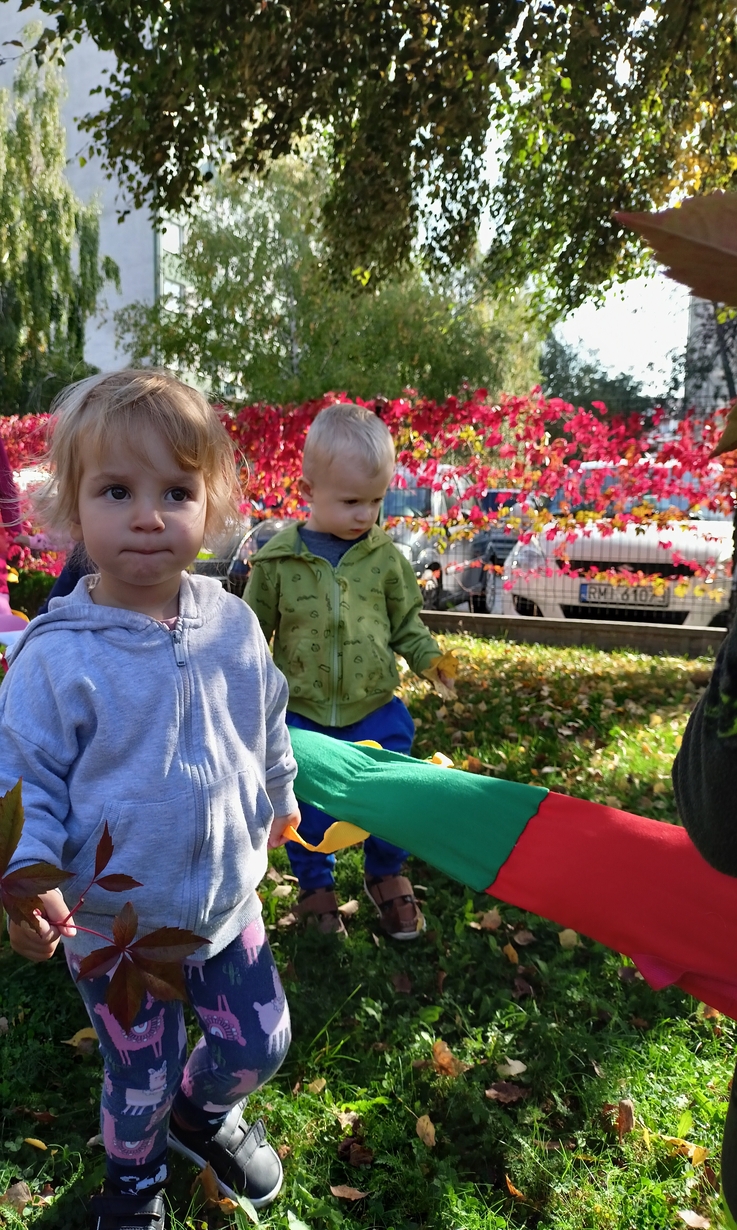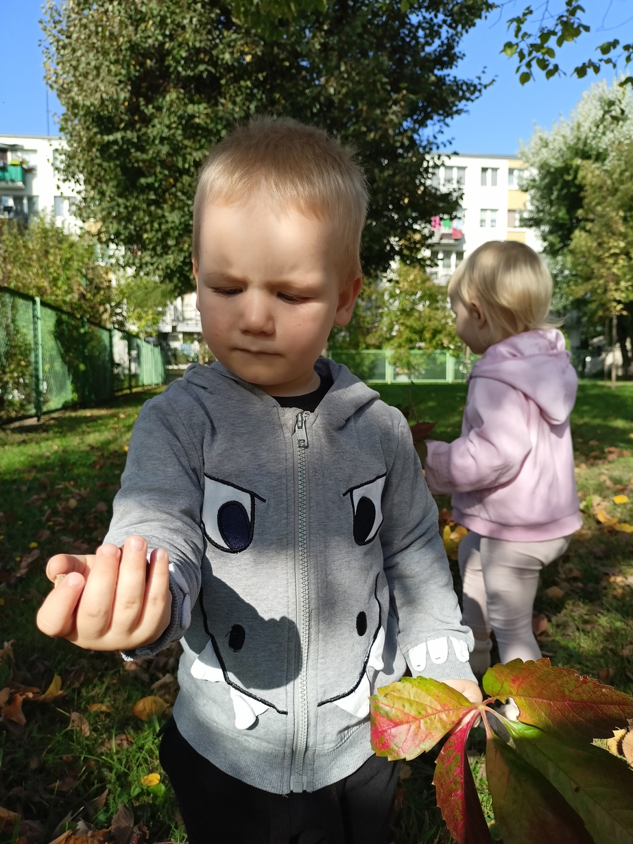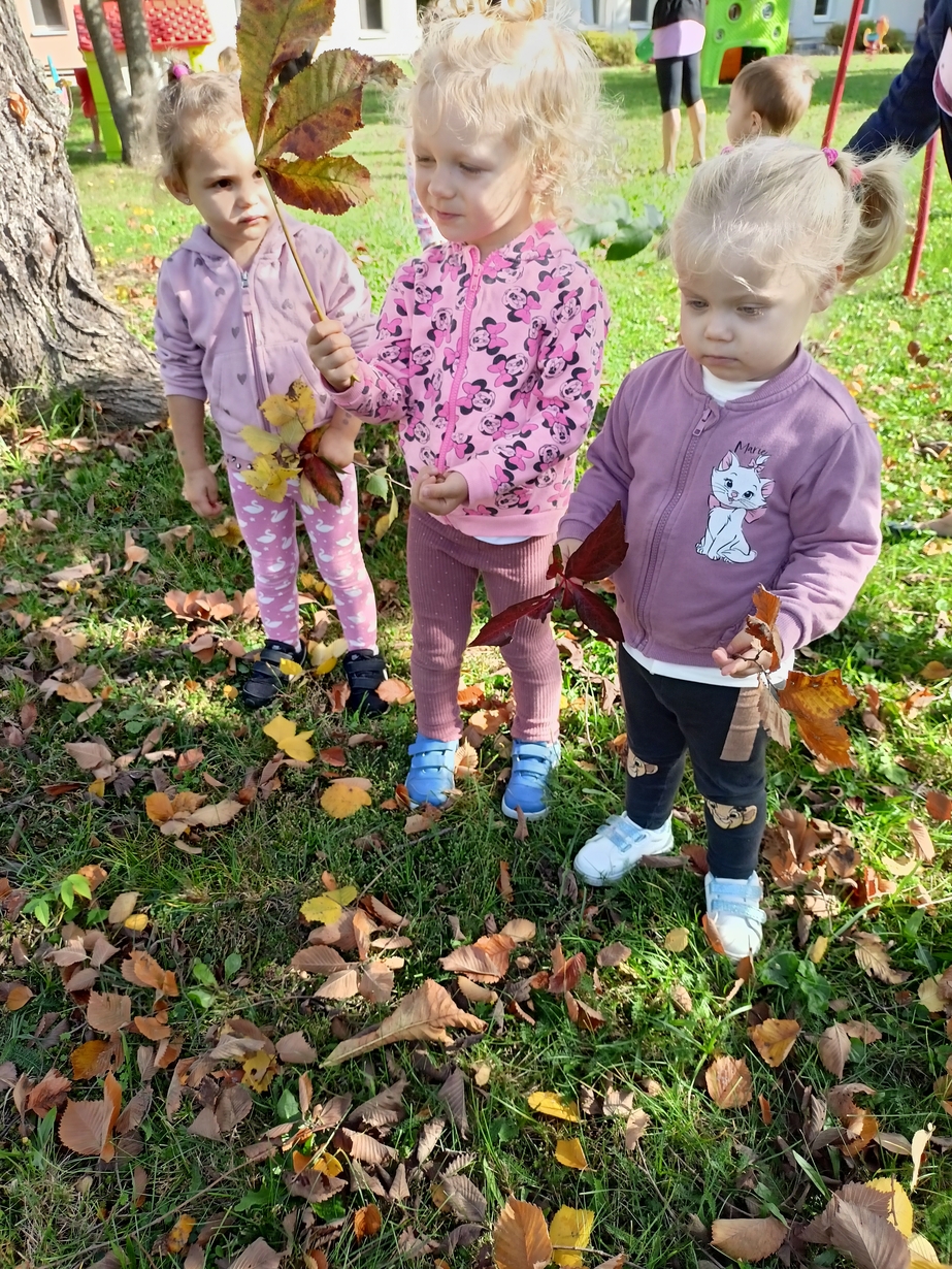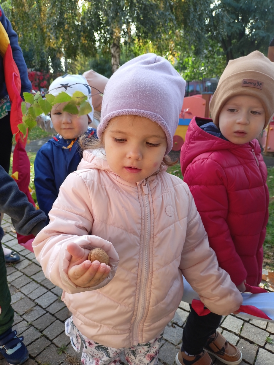 Dzieci z grupy"Pszczółki" wybrały się że śpiewem na spacer w poszukiwaniu oznak jesieni. Piękna pogoda jak i humor dopisywały dzieciom.