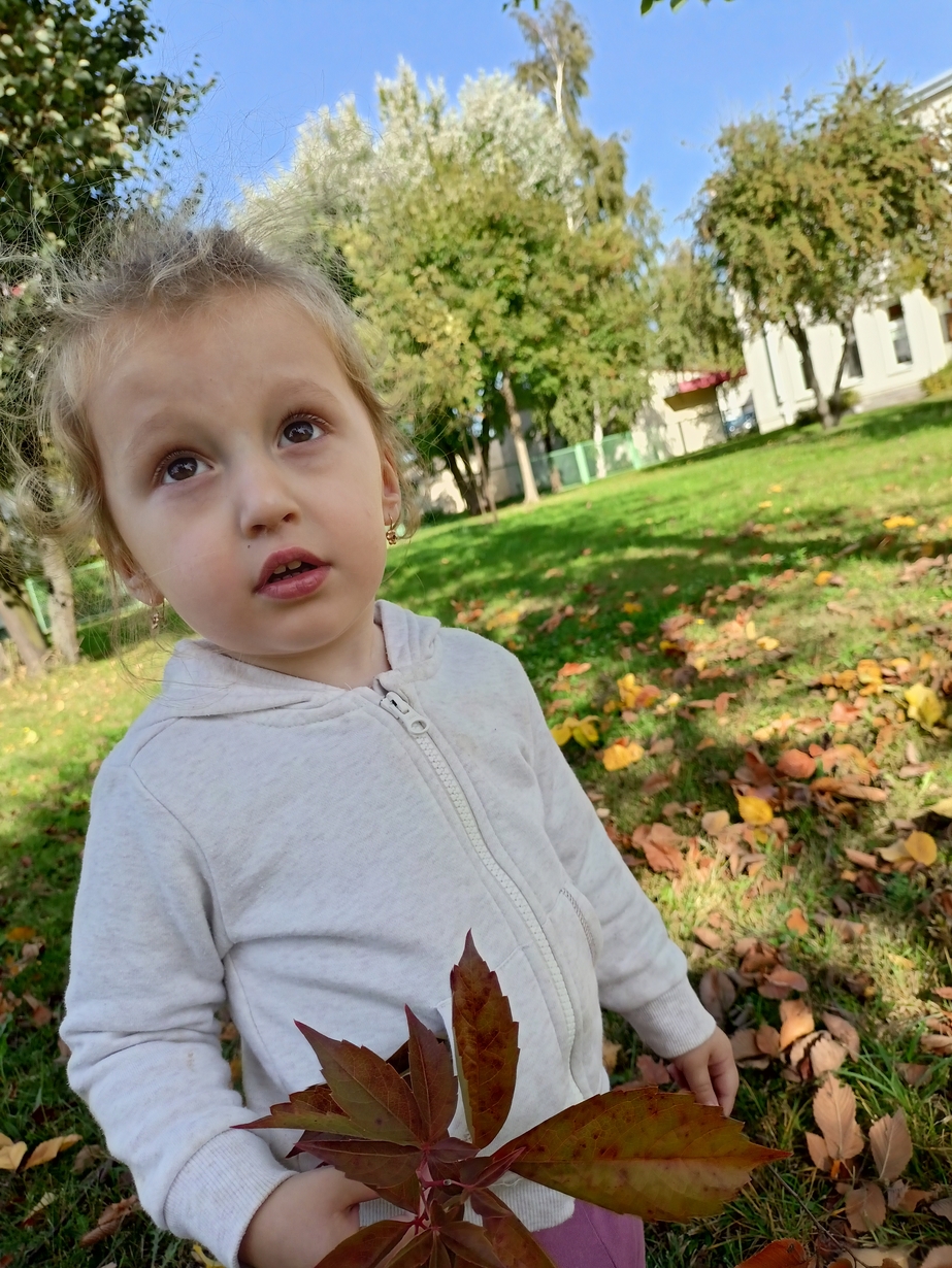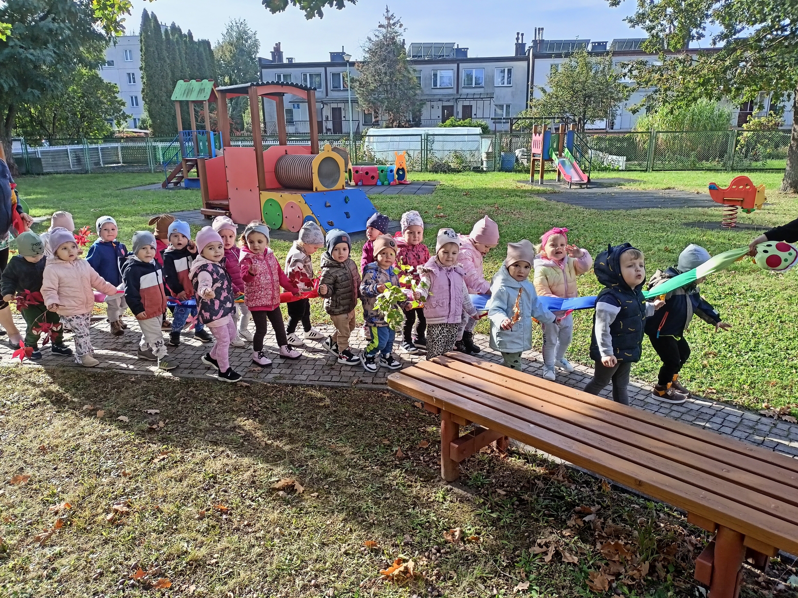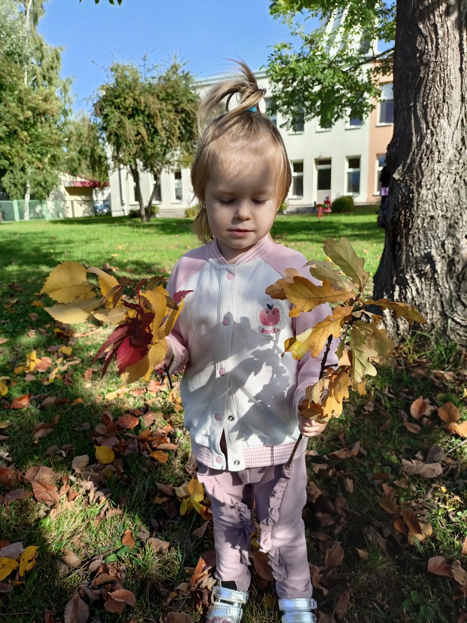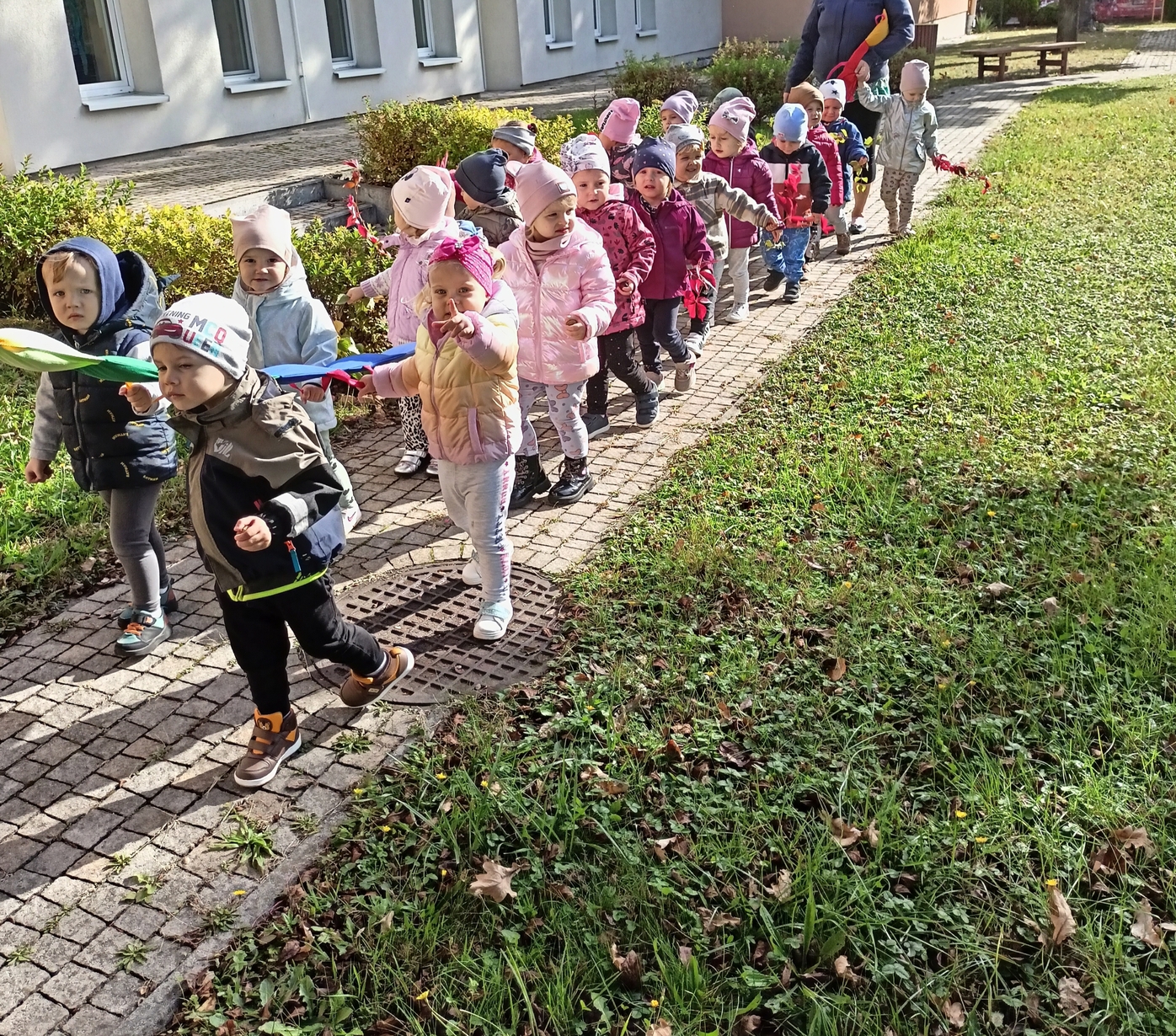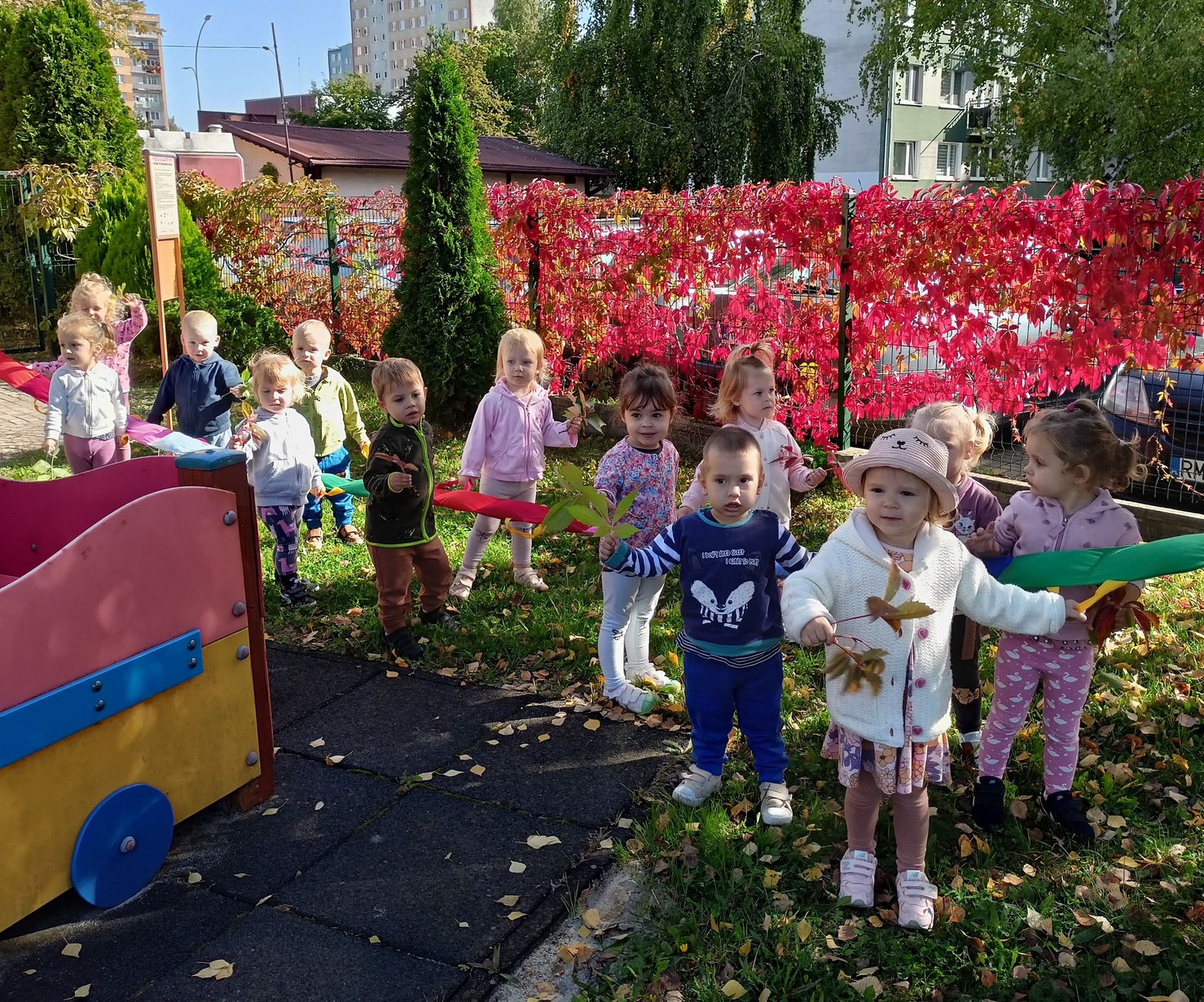 Dzieci z grupy"Pszczółki" wybrały się że śpiewem na spacer w poszukiwaniu oznak jesieni. Piękna pogoda jak i humor dopisywały dzieciom.