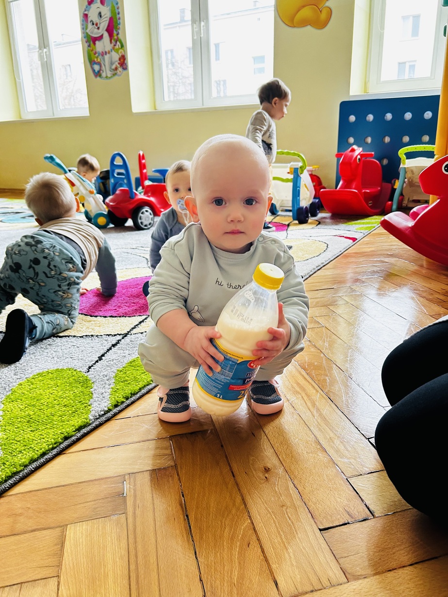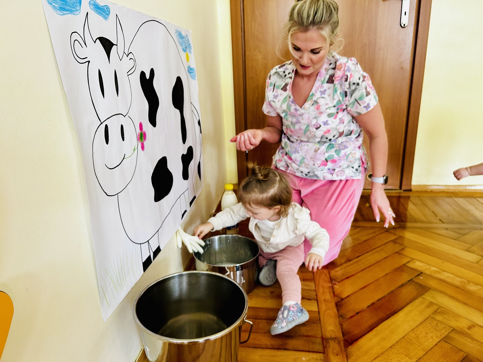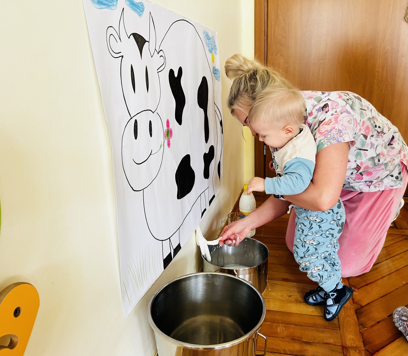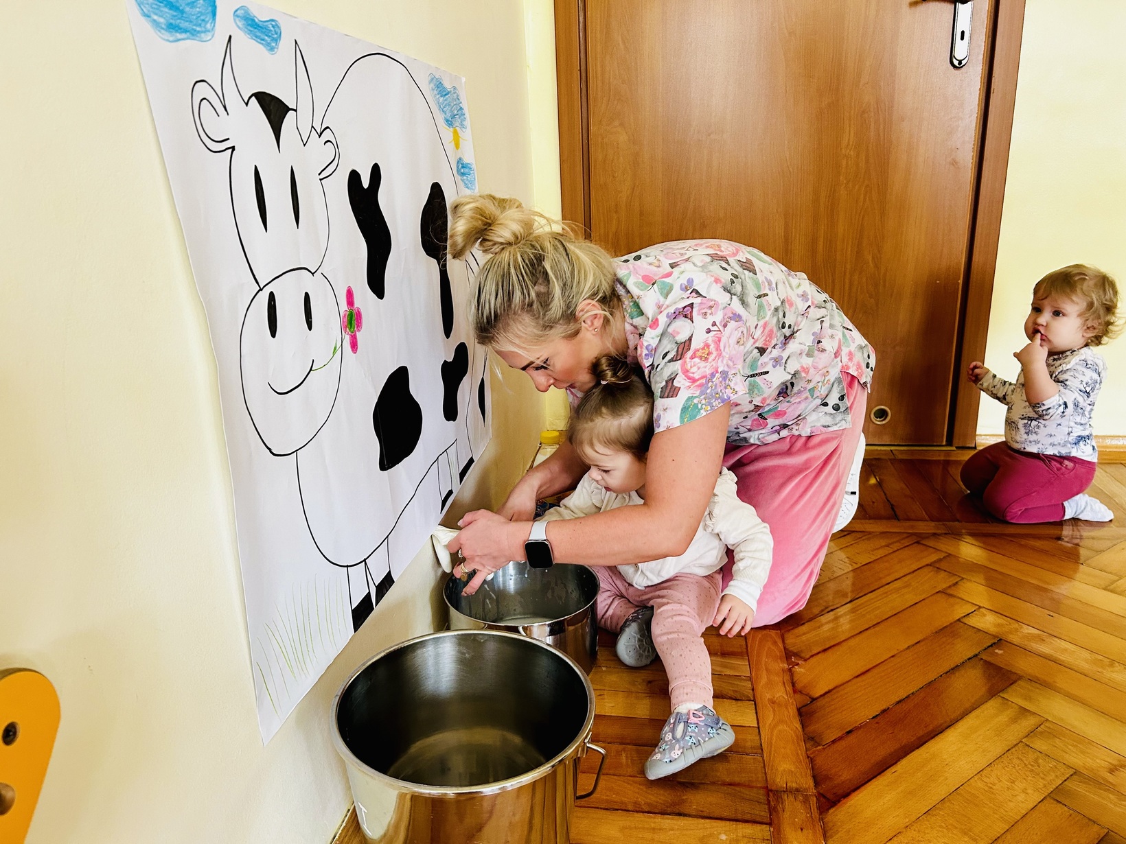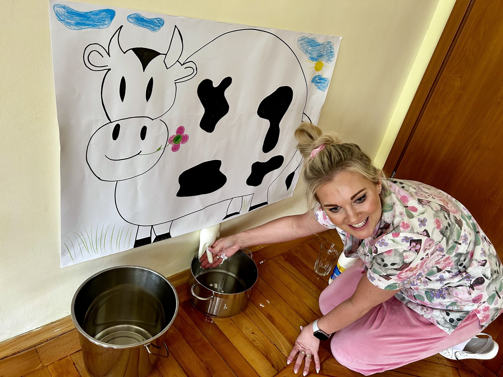 Ogromną frajdę sprawiło dzieciom dojenie krowy Muci (wykonanej z papieru i lateksowej rękawicy)