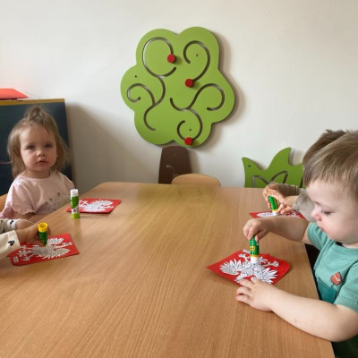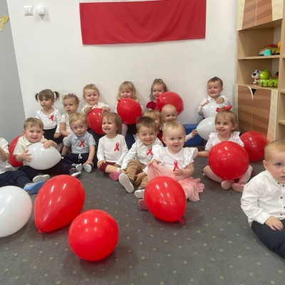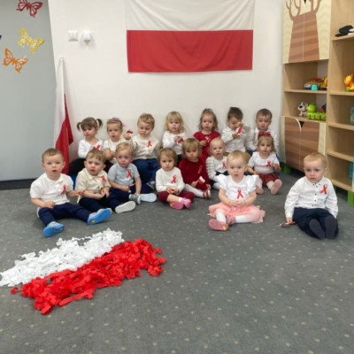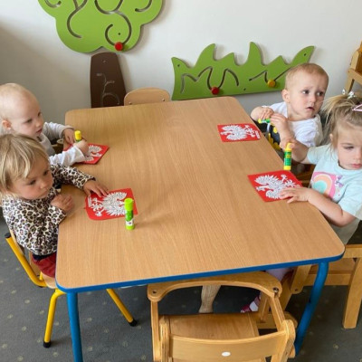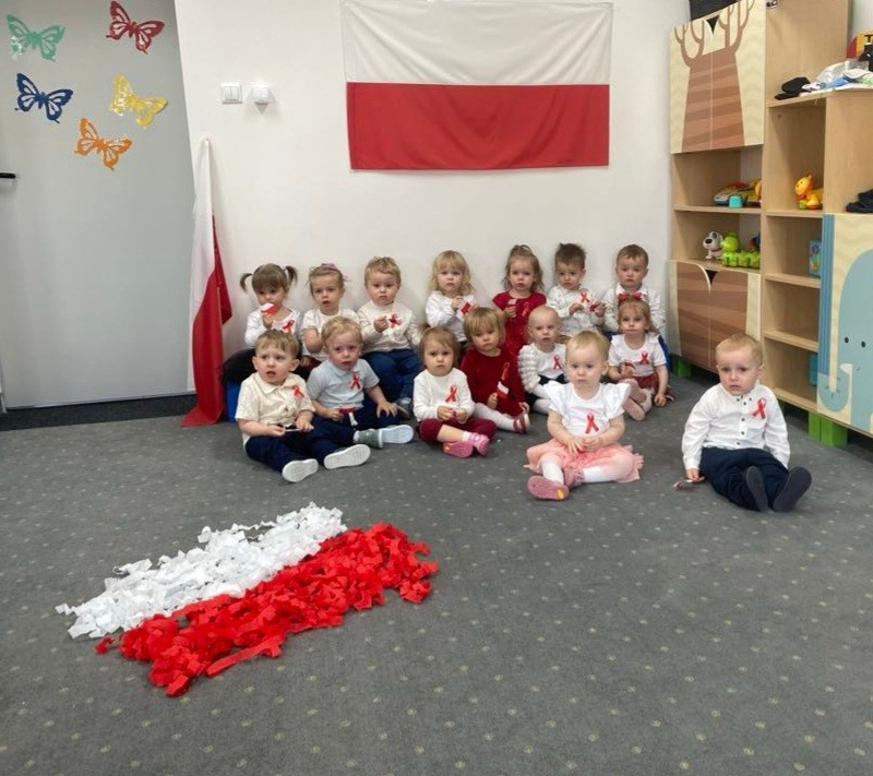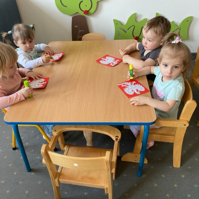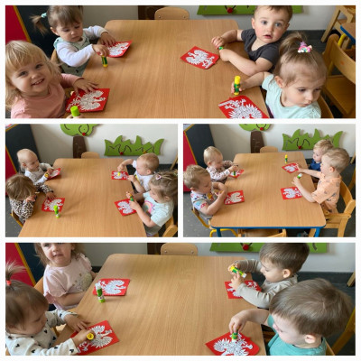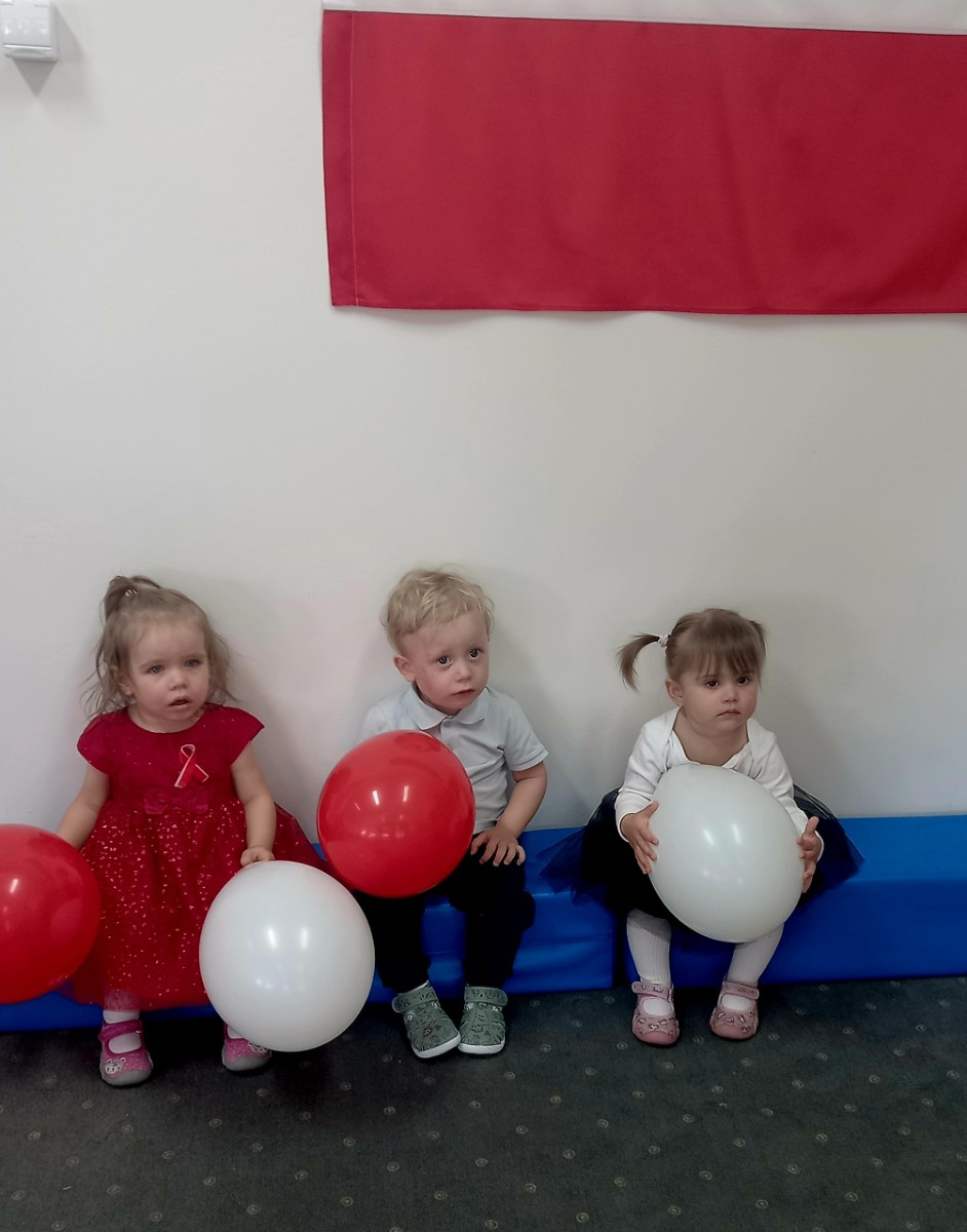Maluszki zapoznały się z symbolami narodowymi, wykonały prace plastyczne - "Godło Polski", uczyły się wierszy " Kto Ty jesteś?" , " Powiewa flaga" oraz śpiewały hymn Polski " Mazurek Dąbrowskiego" wyrażając w ten sposób miłość i przywiązanie do Ojczyzny.