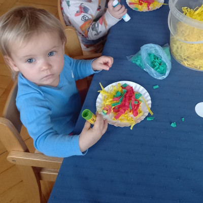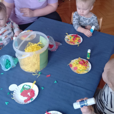 Dzieci wykonały również spaghetti z bibuły i papieru kolorowego z dodatkami według własnego pomysłu.