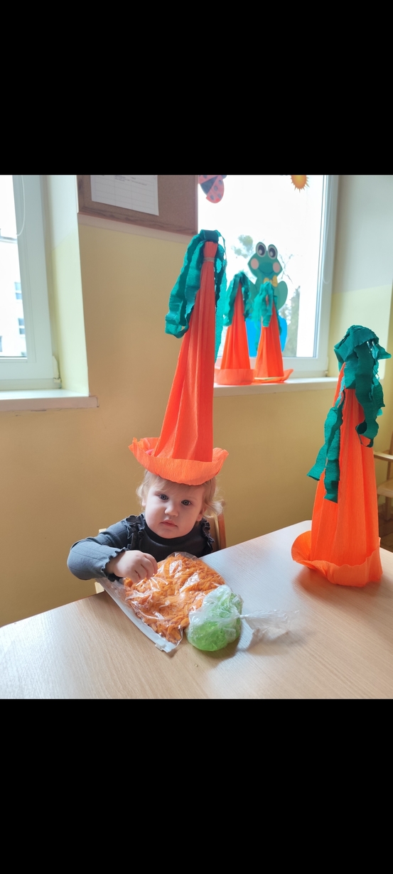 Dzisiaj nasze dzieciaczki ćwiczyły motorykę duzą. Za pomocą różnych struktur wykonanych z tartej marchewki i zielonej galaretki próbowały formować kształt marchewki.
