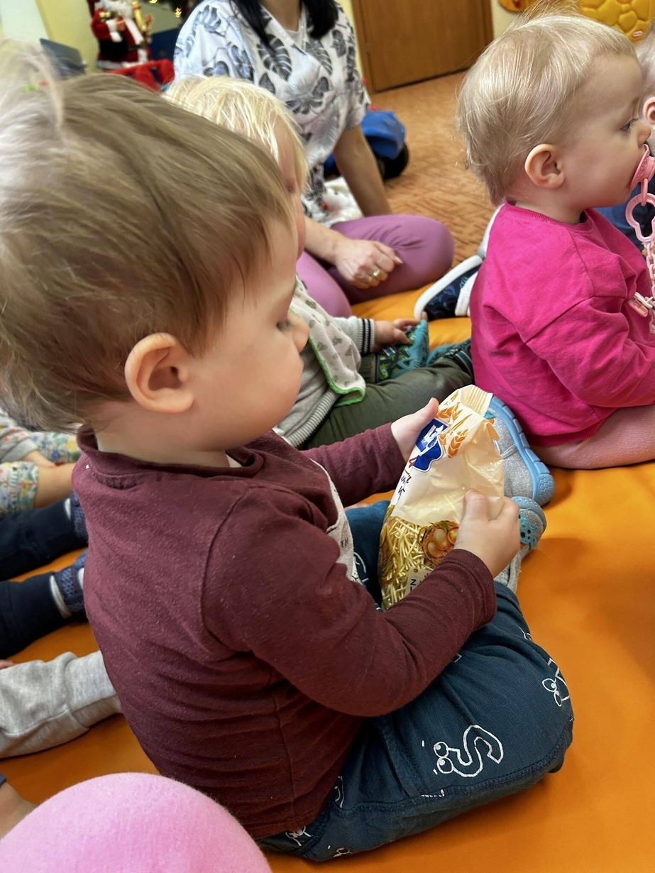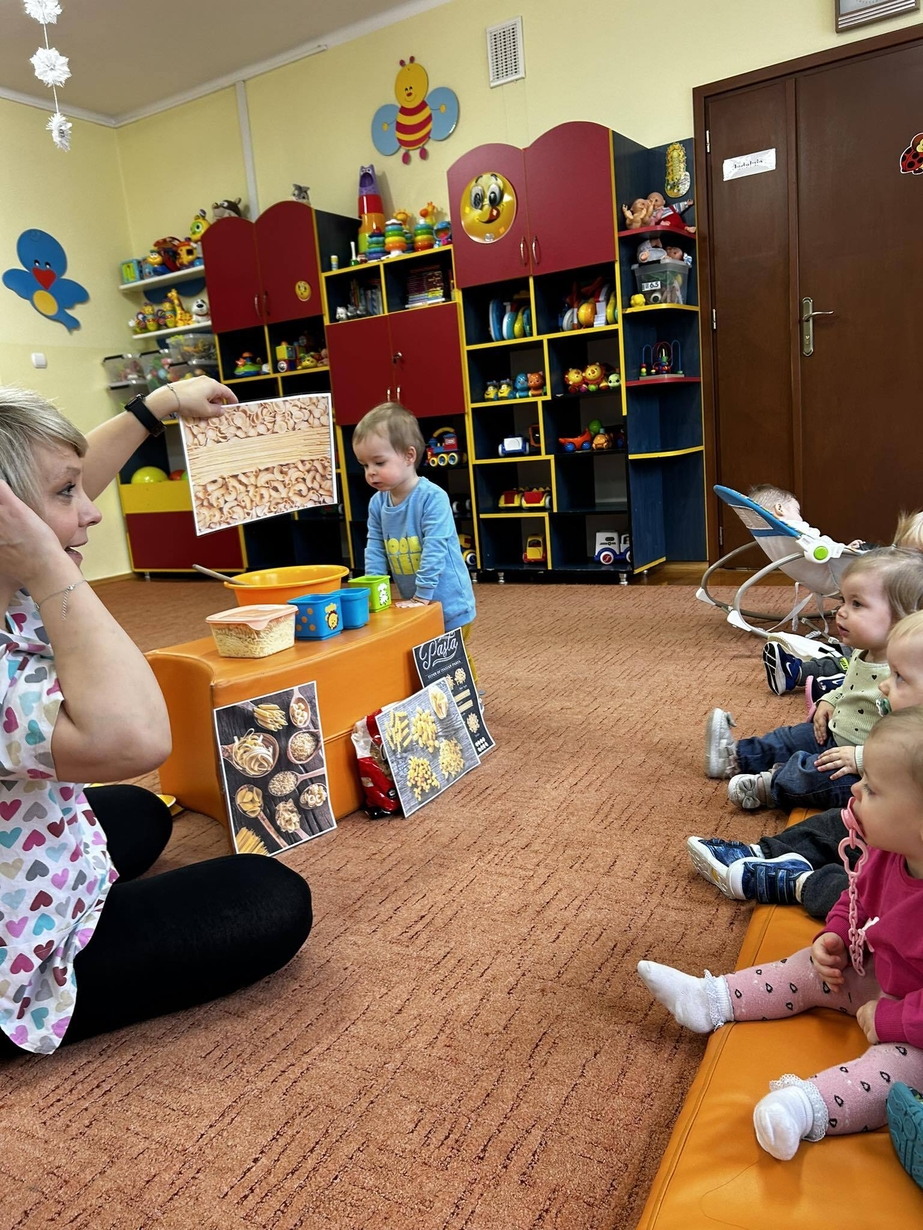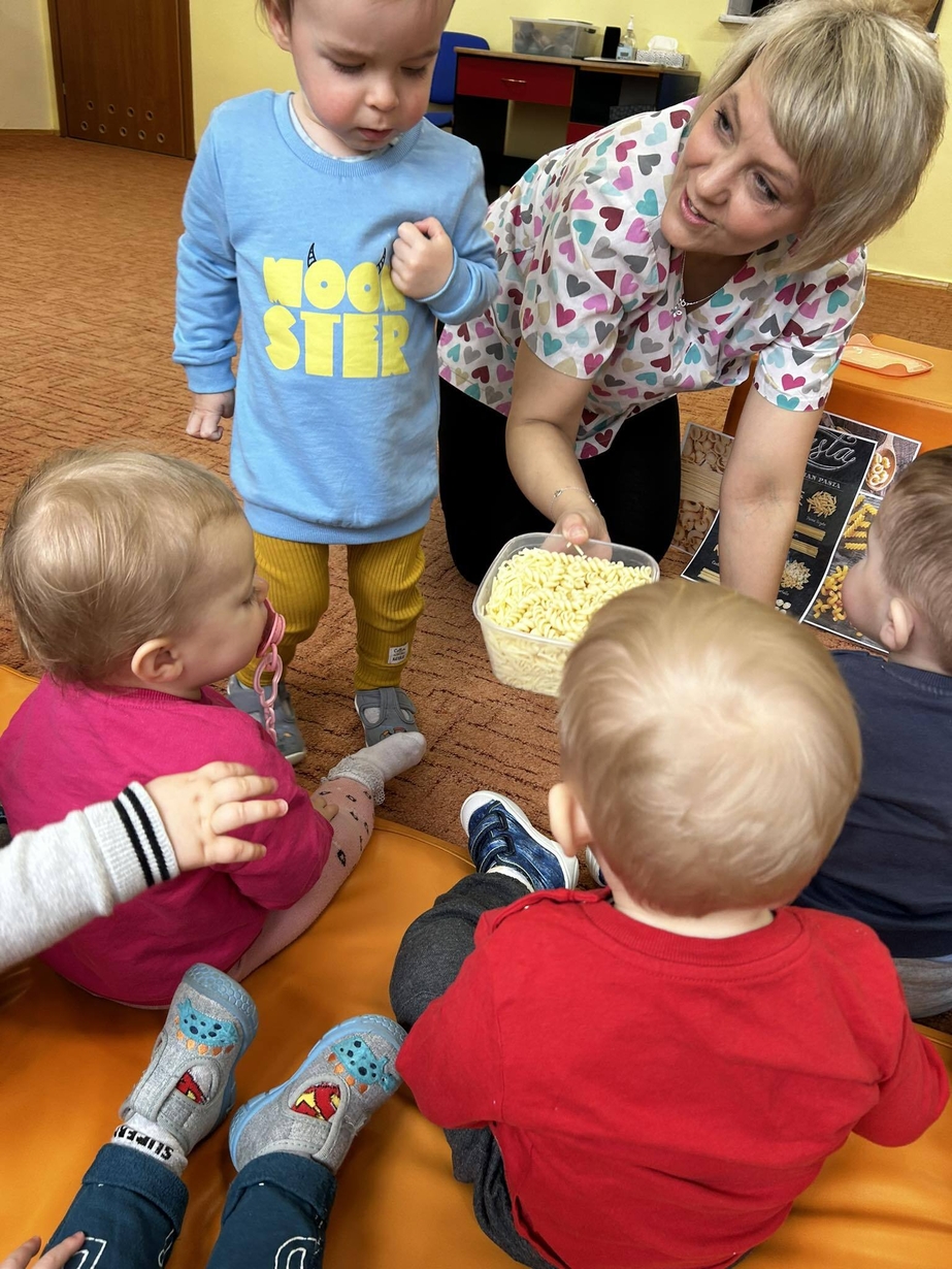 Na piedestale i jako danie główne były makarony, maluszki mogły zamieszać makaron, dotknąć nawet ugotowany makaron.