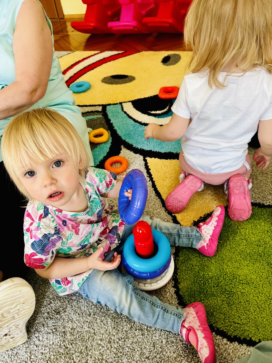 Zgodne zabawy dzieci piramidkami . Zabawa ta rozwija wyobraźnię, oraz wszechstronny rozwój dziecka .