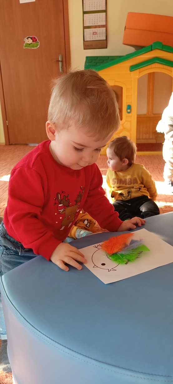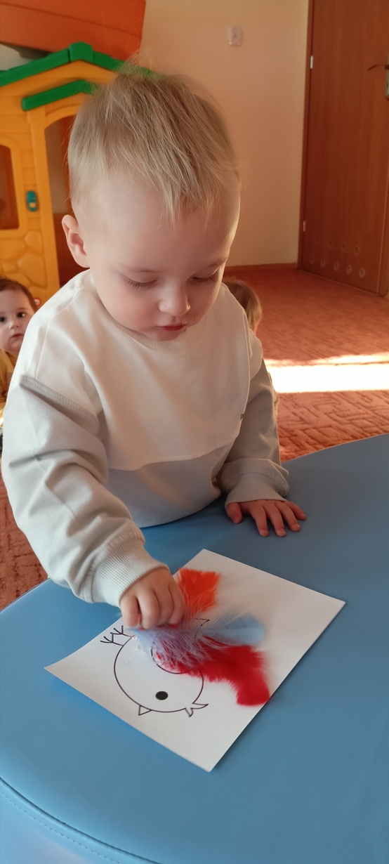 Super zabawą było również wykonywanie pracy plastycznej. Dzieciaczki przyklejały kolorowe piórka do ptaszka z papieru.