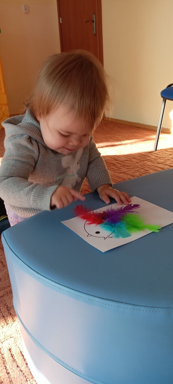 łapaniem piórka w rączki czy łaskotanie piórkiem po czole, brodzie czy policzku.