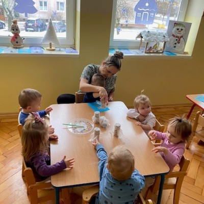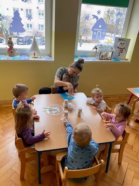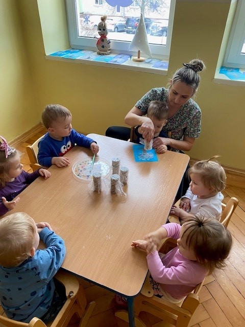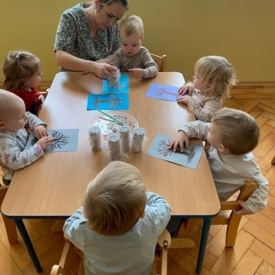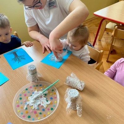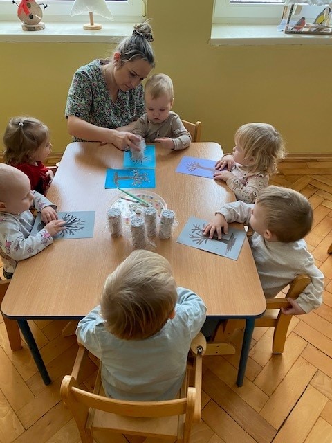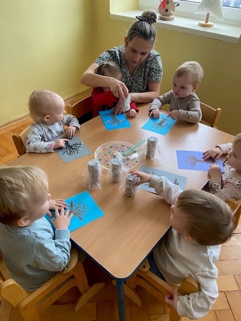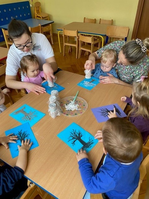 Dzieci malowały z pomocą opiekunek przepiękne drzewa obsypane śniegiem ☺️