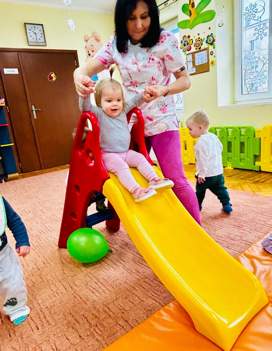 Zabawa na zjeżdżalni rozwija poczucie równowagi i koordynację ruchową.