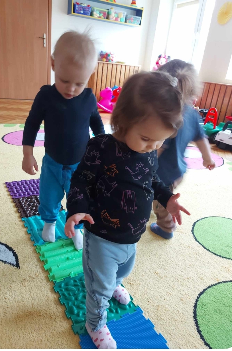 Chodzenie po zróżnicowanych strukturach pobudza receptory dotykowe w stopach.