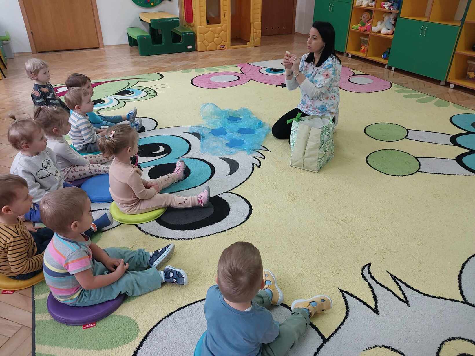 Dzieci dowiedziały się, gdzie mieszkają delfiny, jak śpią oraz czym się żywią. Misie z zaciekawieniem słuchały również dźwięków jakie wydobywają z siebie te ssaki. W małym akwarium zaczarowaliśmy wodę na niebiesko,aby maluszki mogły zobaczyć w jakim środowisku żyją delfinki . Dzieciaczki przymierzały gogle ,w jakich można obserwować podwodny świat.
