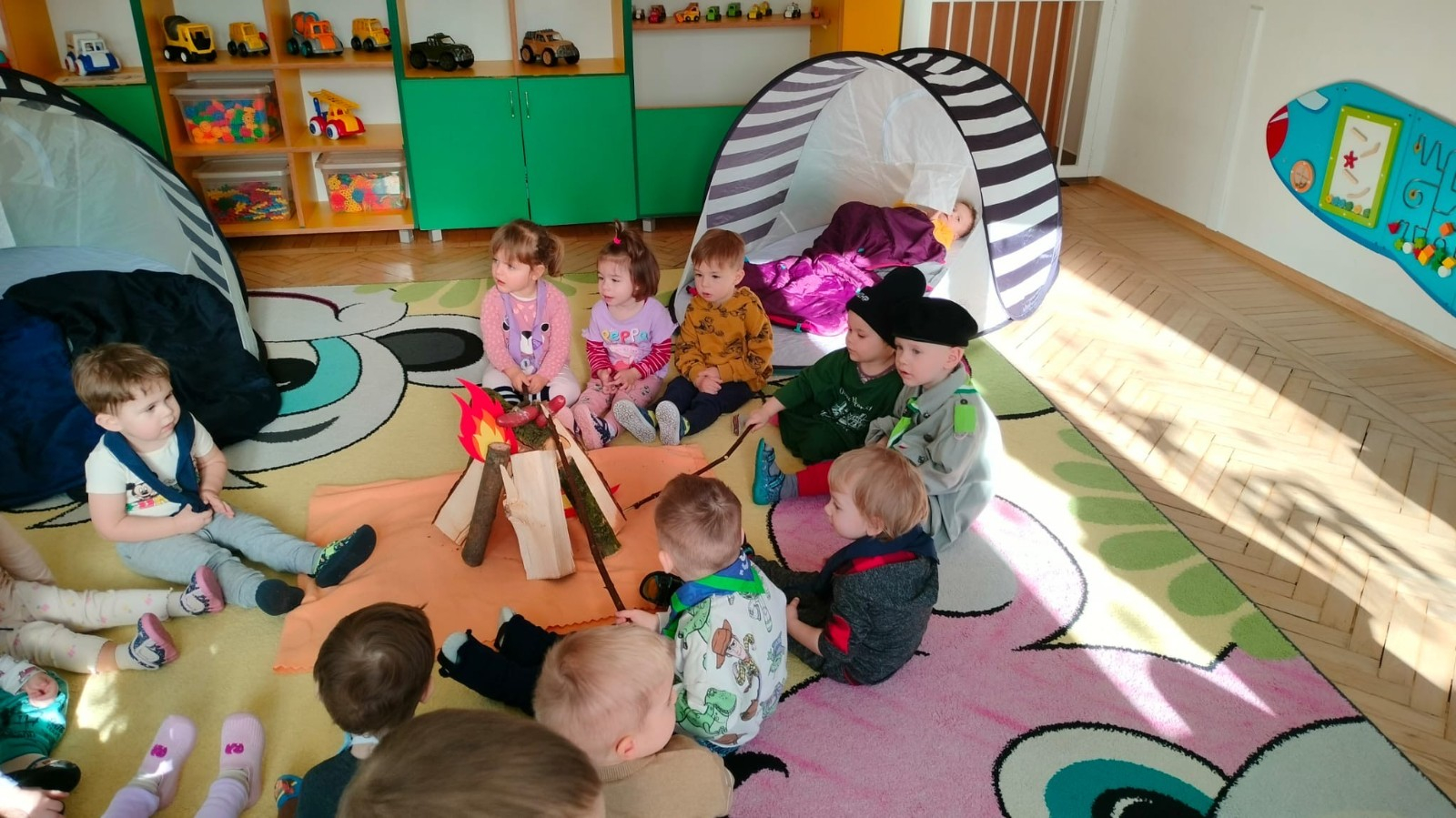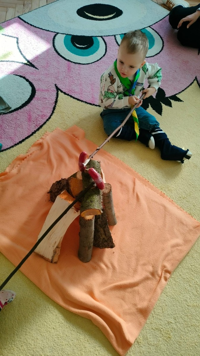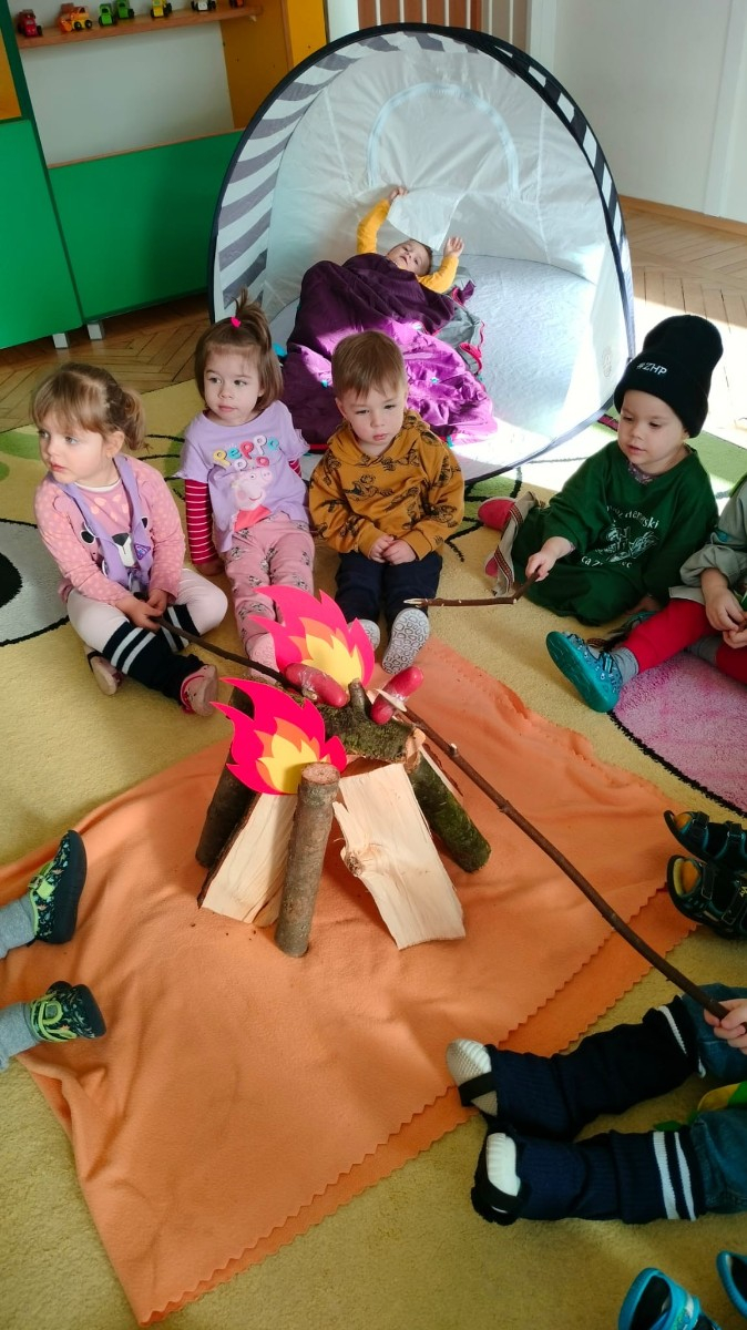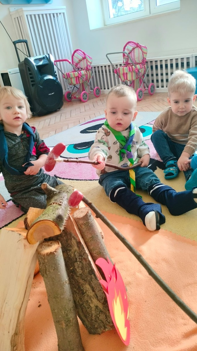 Tego dnia nasza sala zabaw zamieniła się w biwak harcerski. Były namioty🏕️, śpiwory , w których spały maluszki. Rozpaliliśmy ognisk🔥, przy którym wspólnie wśpiewaliśmy piosenki harcerskie i piekliśmy kiełbaski na kijach.