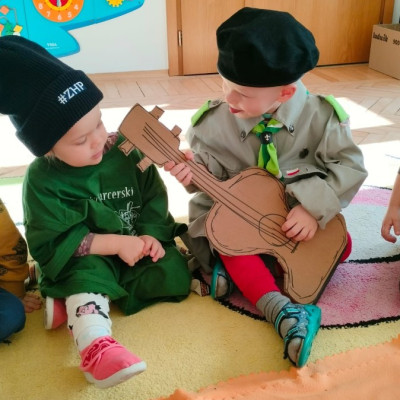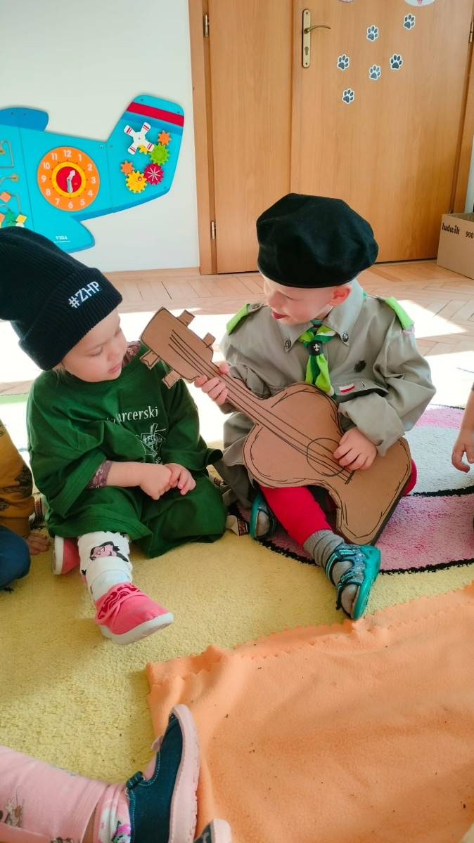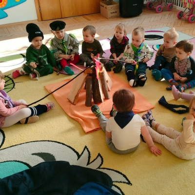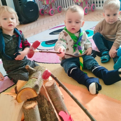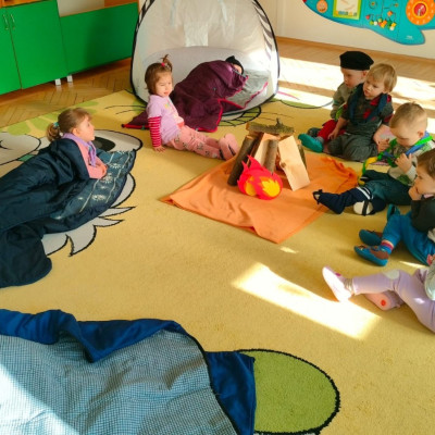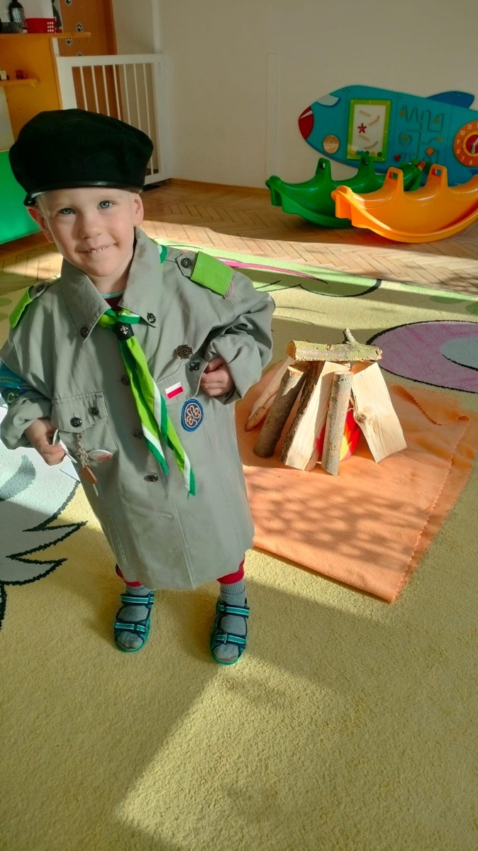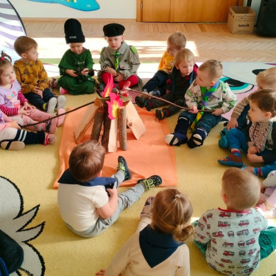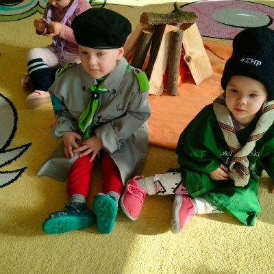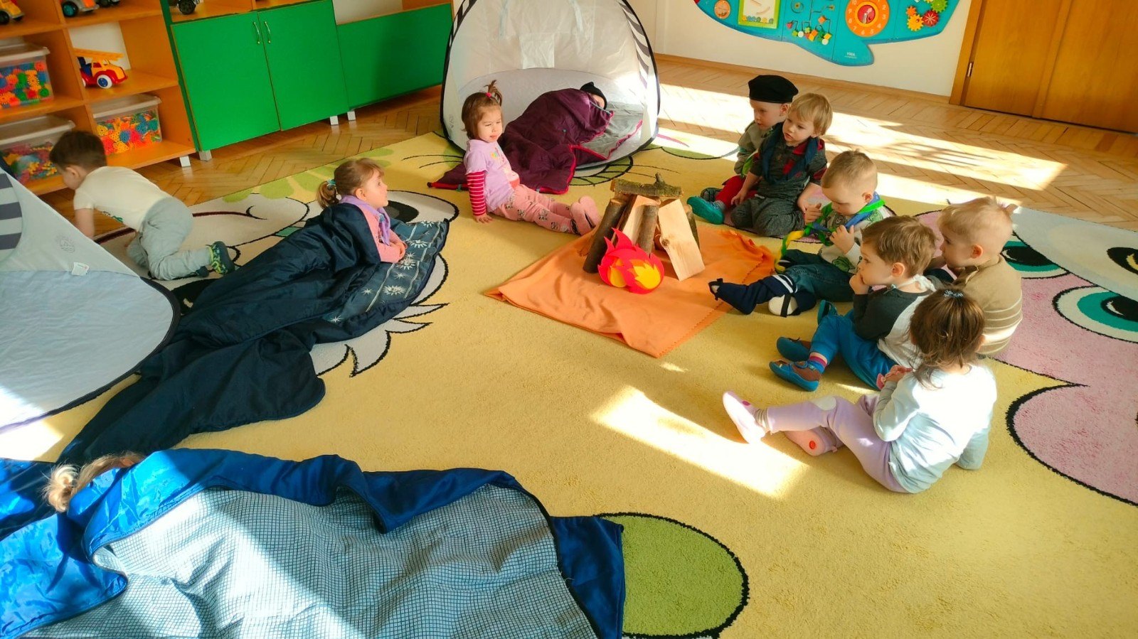 Tego dnia nasza sala zabaw zamieniła się w biwak harcerski. Były namioty🏕️, śpiwory , w których spały maluszki. Rozpaliliśmy ognisk🔥, przy którym wspólnie wśpiewaliśmy piosenki harcerskie i piekliśmy kiełbaski na kijach.