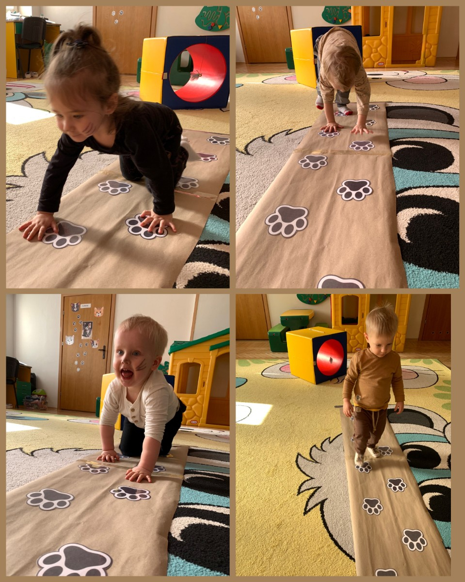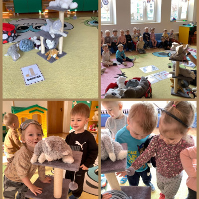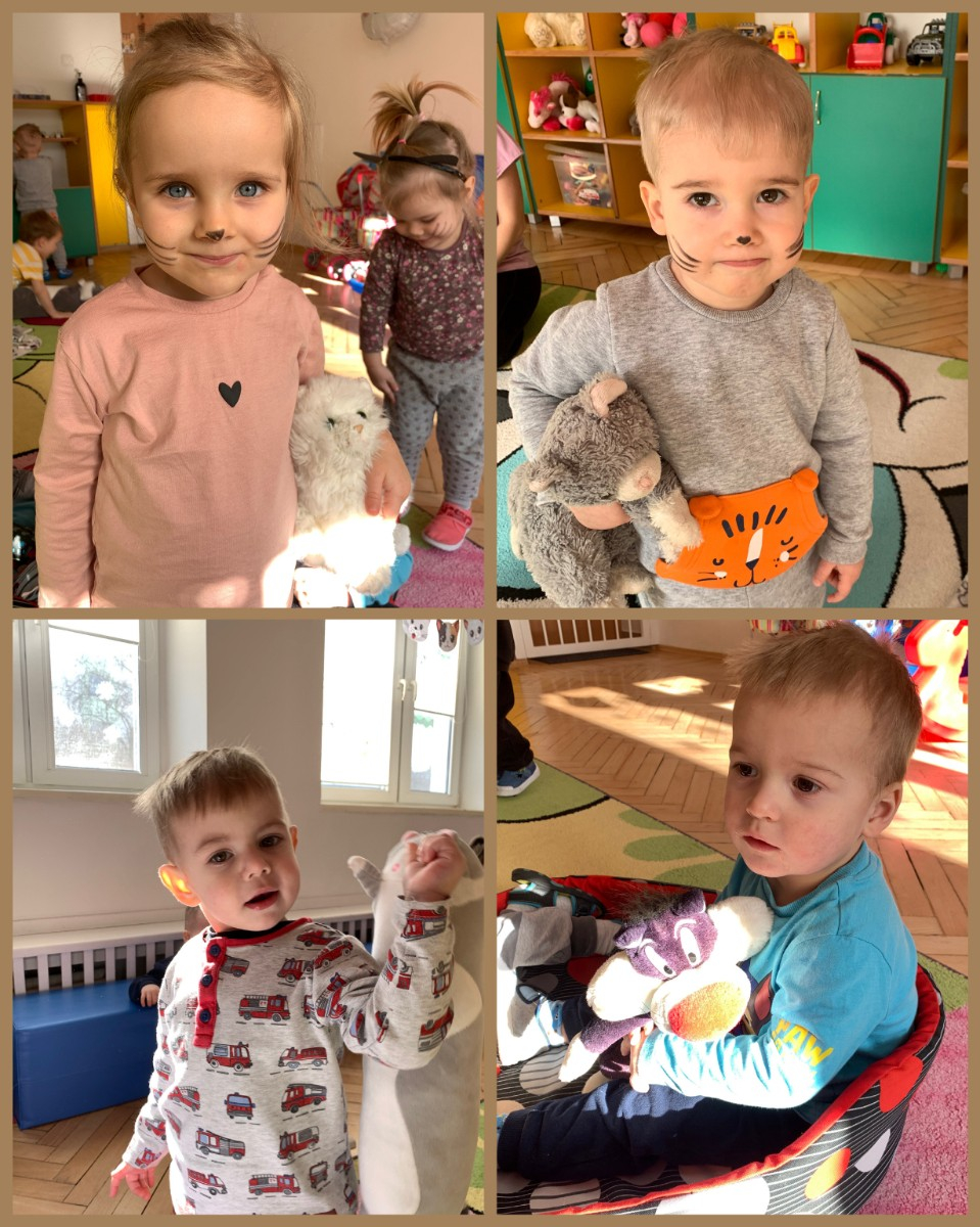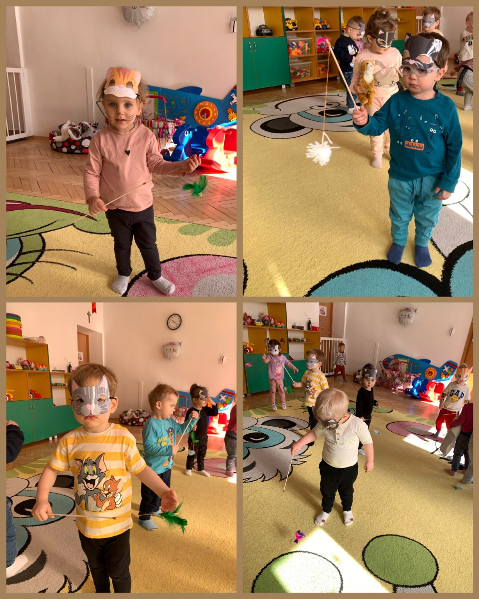 Nasza sala zamieniła się w kocie królestwo, a Maluszki przeobraziły się w urocze kociaki: maski, opaski z uszkami, pomalowane wąsiki oraz ogonki. Dzieci słuchały bajeczki o kotkach, poznały rasy oraz ich obyczaje. Były też wesołe ,,kocie zabawy”przy znanych piosenkach oraz koci tor przeszkód. 🐈