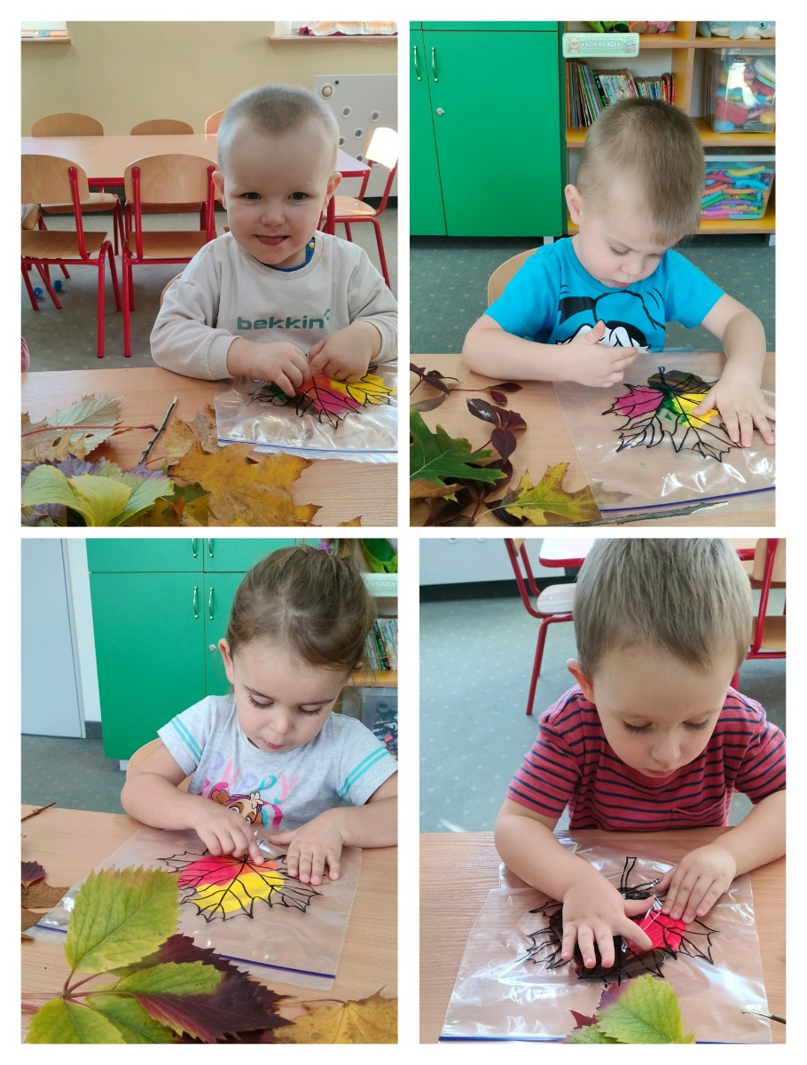 Zdjęcia przedstawiają dzieci podczas zajęć tematycznych o jesieni