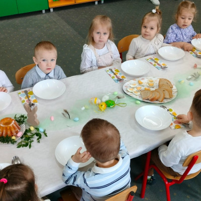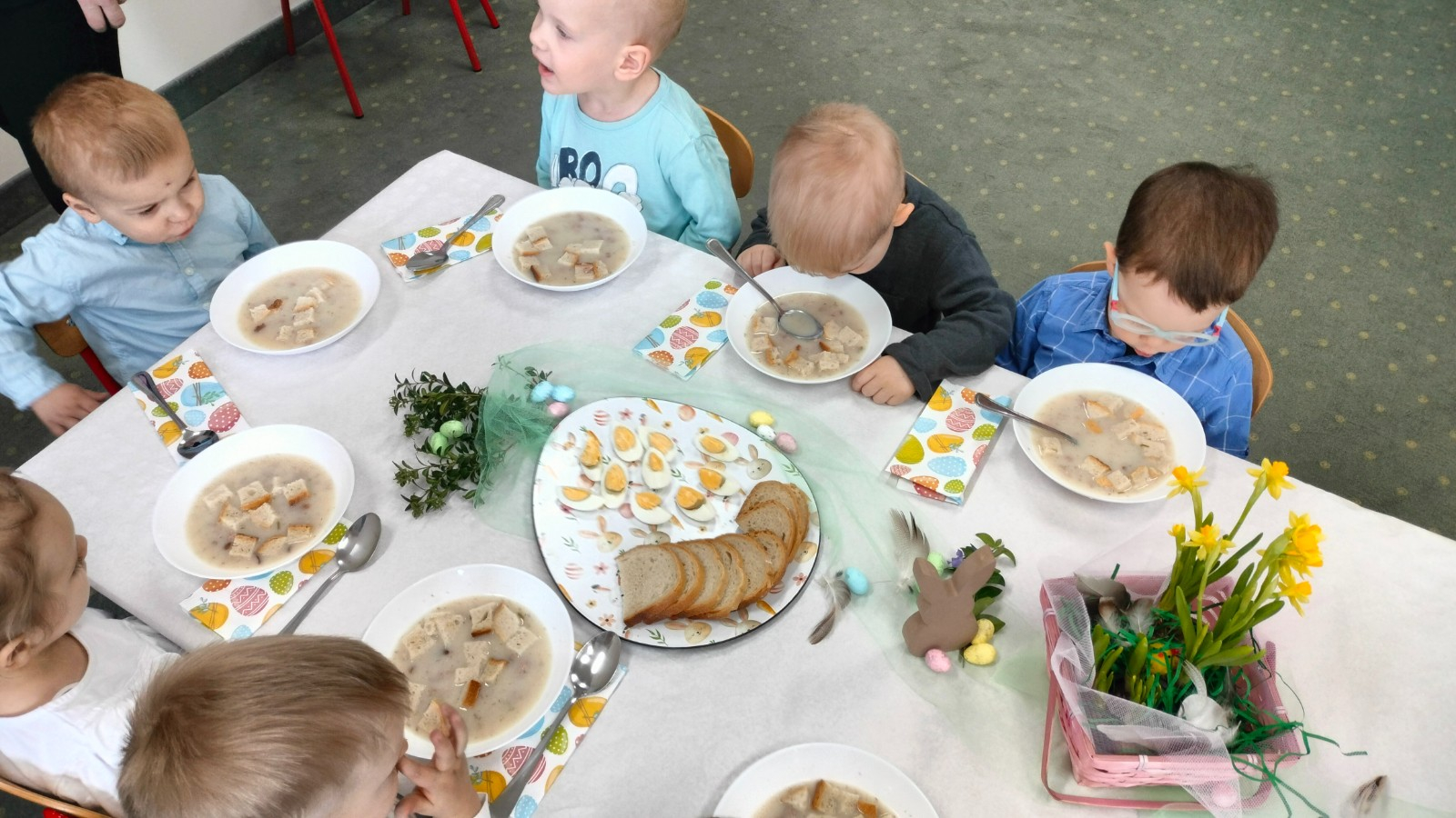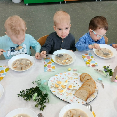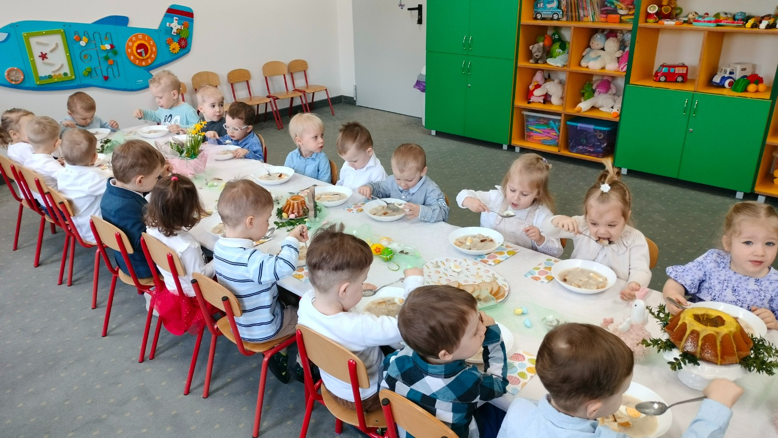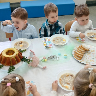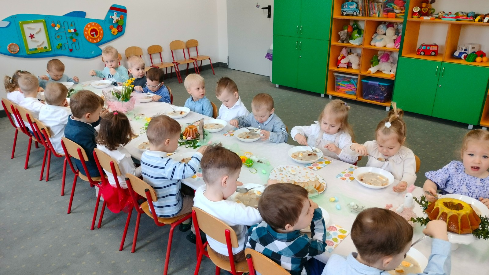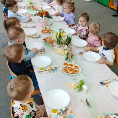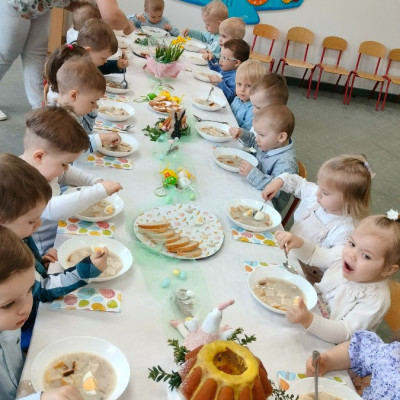 Wielkanoc to najstarsze i najważniejsze święto chrześcijaństwa mające bogatą tradycję i liczne religijne obrzędy. Jednym z nich jest uroczyste śniadanie. Również w naszym żłobku 16 kwietnia dzieci w odświętnych strojach zasiadły do śniadania wielkanocnego. Na stole pojawiły się tradycyjne wielkanocne przysmaki – jajka, kiełbaska, barszcz biały, babki. Nie zabrakło także pięknych wiosennych dekoracji oznaczających budzącą się do życia przyrodę. Spotkanie przy wspólnym świątecznym stole sprawiło dzieciom wiele radości.