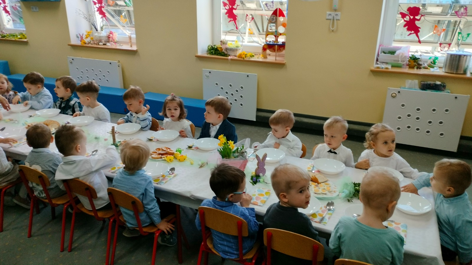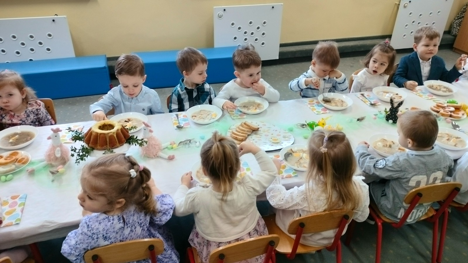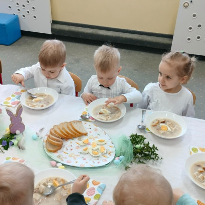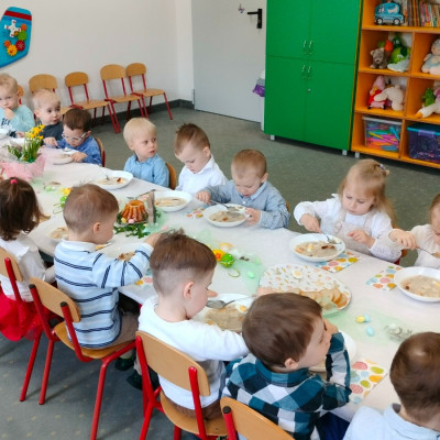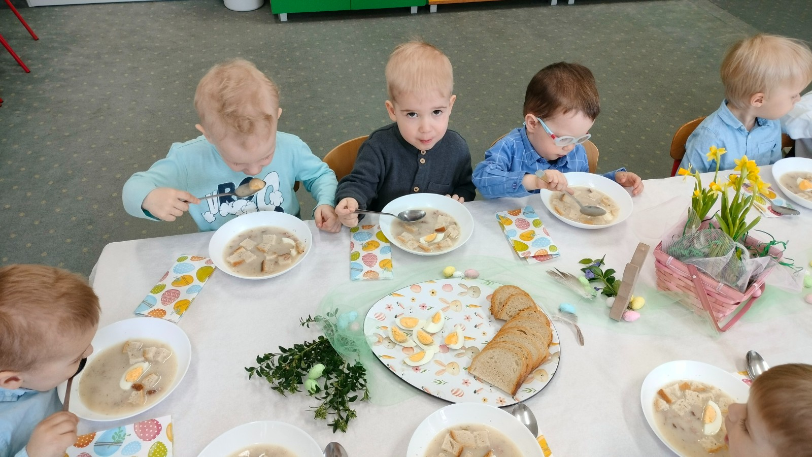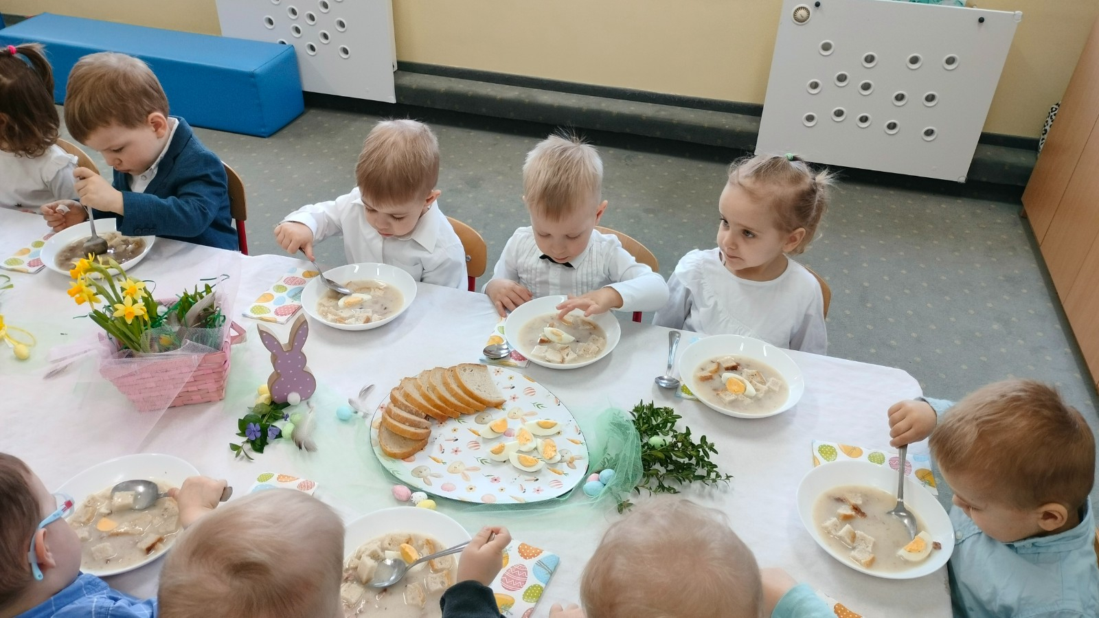 Wielkanoc to najstarsze i najważniejsze święto chrześcijaństwa mające bogatą tradycję i liczne religijne obrzędy. Jednym z nich jest uroczyste śniadanie. Również w naszym żłobku 16 kwietnia dzieci w odświętnych strojach zasiadły do śniadania wielkanocnego. Na stole pojawiły się tradycyjne wielkanocne przysmaki – jajka, kiełbaska, barszcz biały, babki. Nie zabrakło także pięknych wiosennych dekoracji oznaczających budzącą się do życia przyrodę. Spotkanie przy wspólnym świątecznym stole sprawiło dzieciom wiele radości.