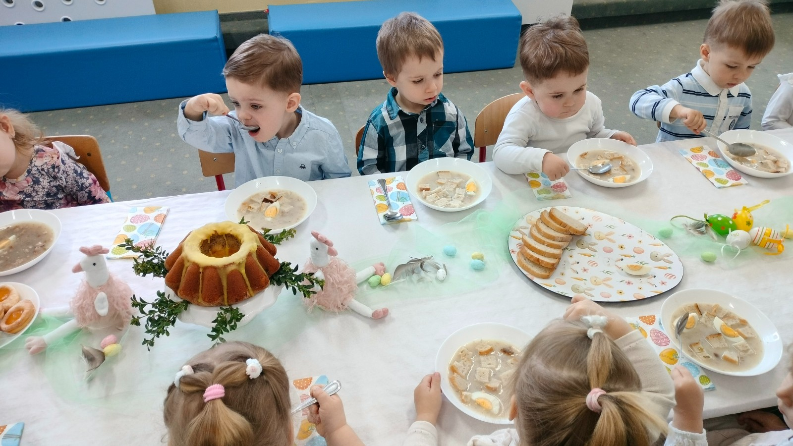 Zdjęcia przedstawiają dzieci podczas wspólnego śniadania wielkanocnego