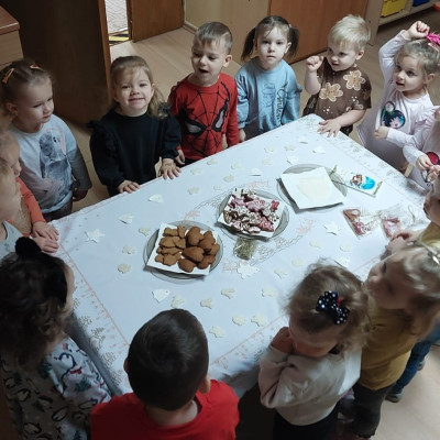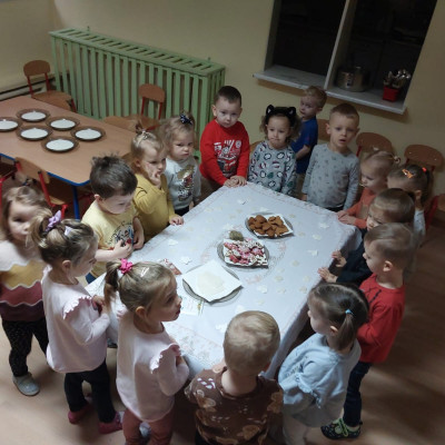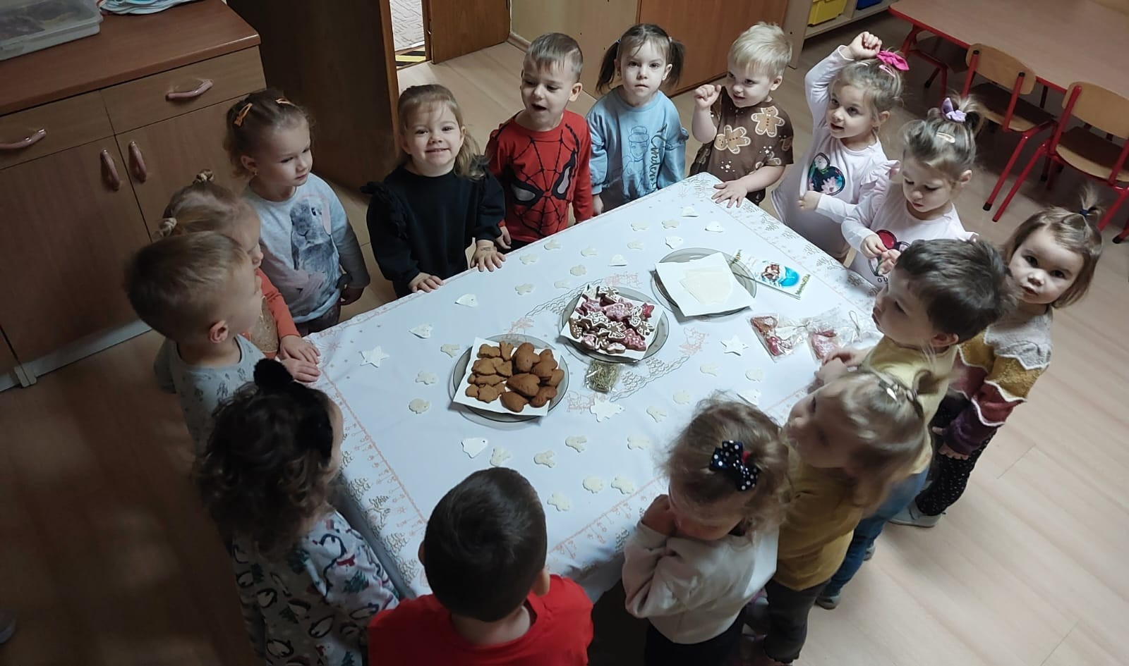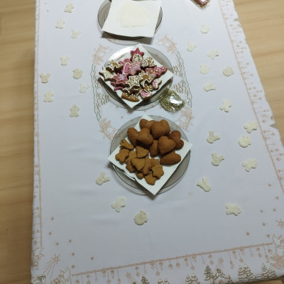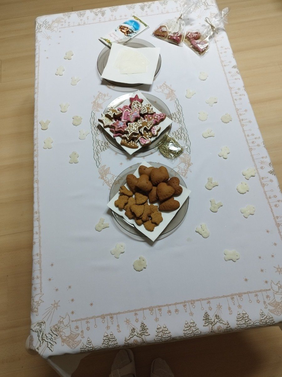 Zdjęcie przedstawia stół z pierniczkami i opłatkiem