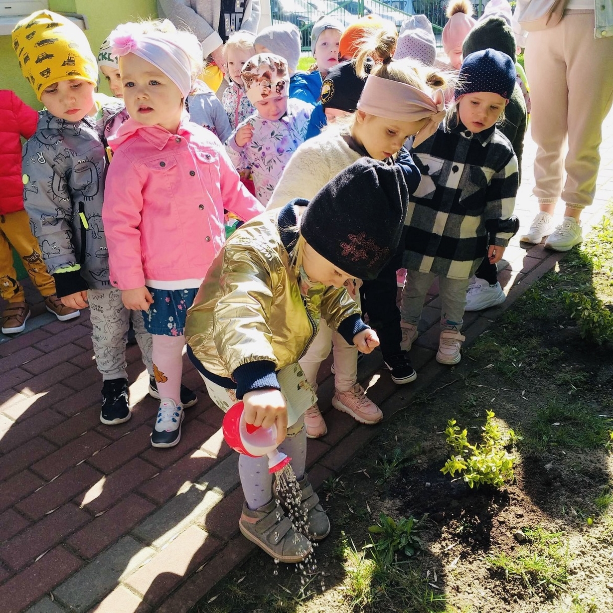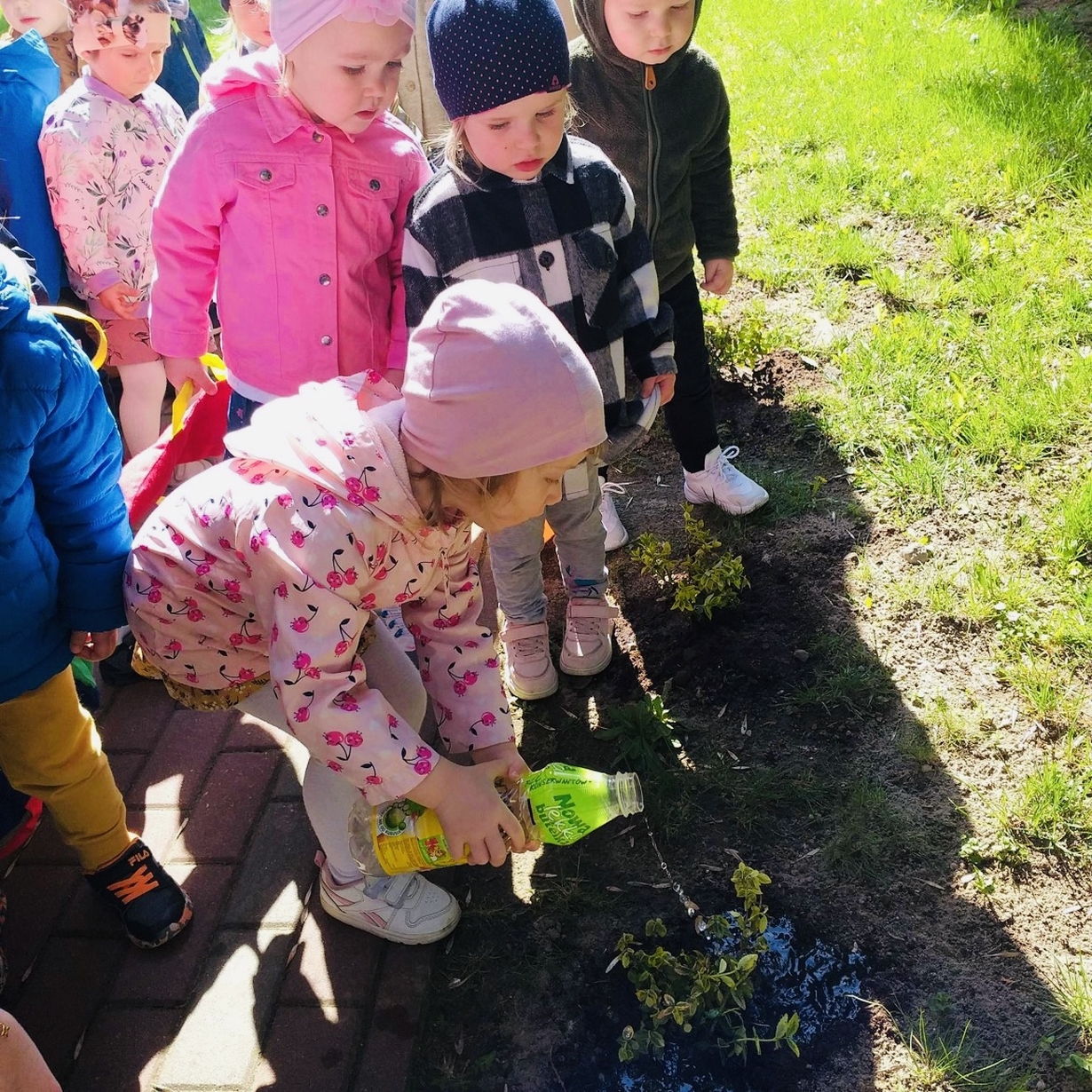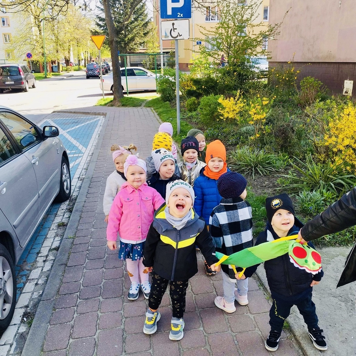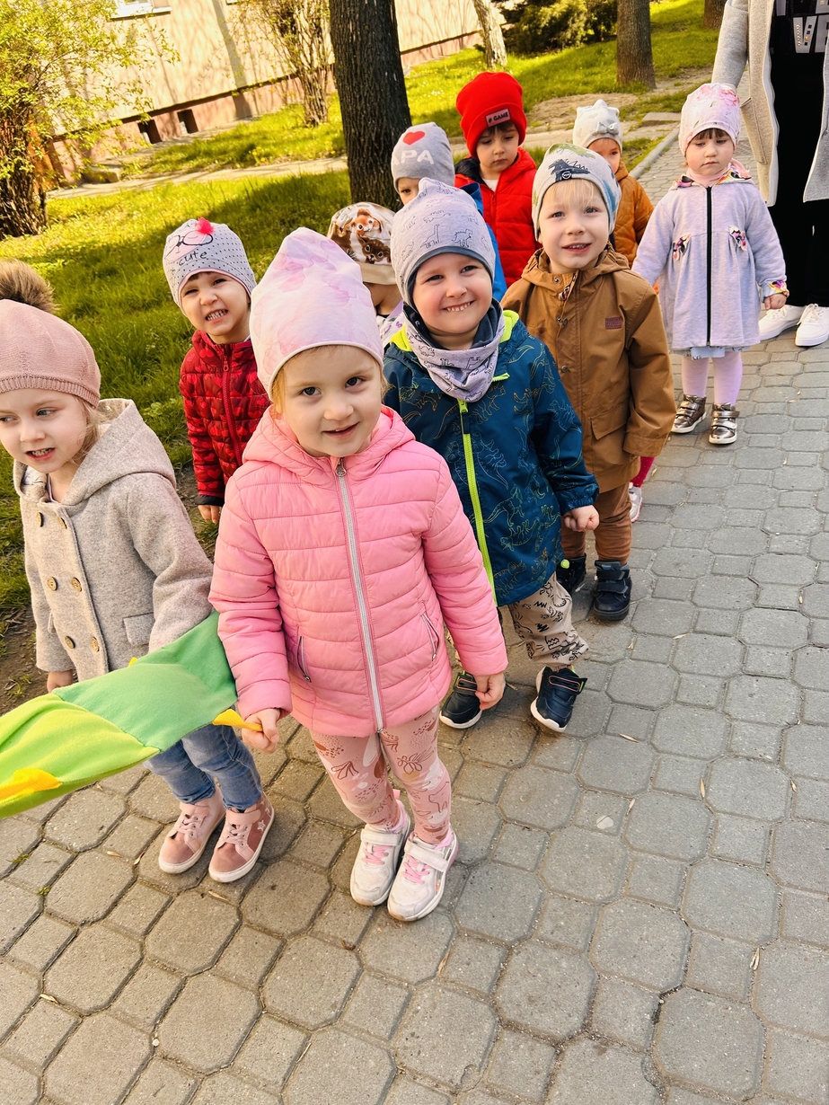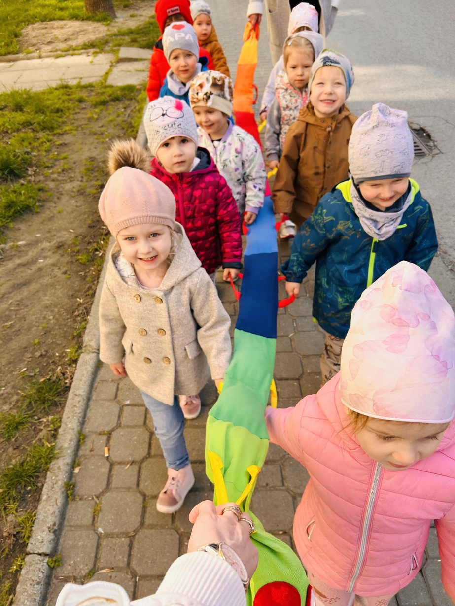Korzystając z pięknej pogody Motylki ?wyruszyły na spacer w poszukiwaniu wiosny . Dzieciaczki w towarzystwie węża dzielnie wędrowały . Pełni energii i w radosnym nastroju wrócili na pyszny obiad do żłobka .