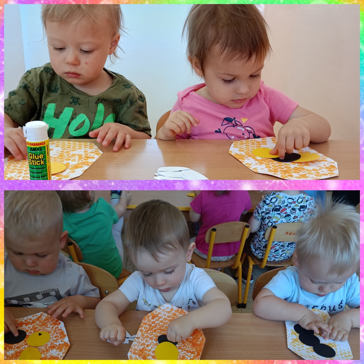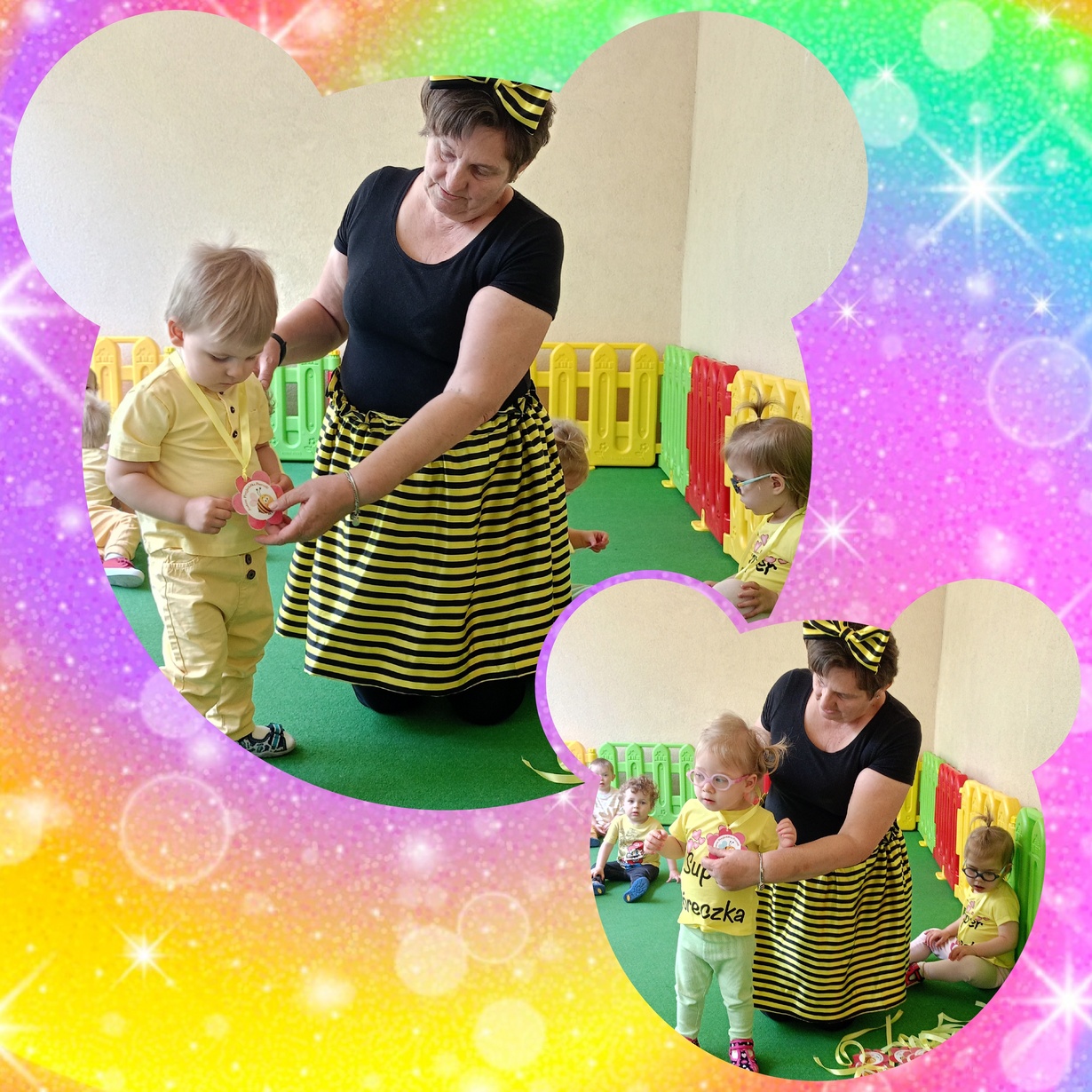 Dziś na naszej grupie podwójne święto - Światowy Dzień Pszczół i imieniny naszej grupy. Do tego święta przygotowywaliśmy się od dawna. Z samego rana dzieci przybyły ubrane na żółto a na szyjach dumnie nosiły medale z symbolem naszej grupy. Ciocie przygotowały kolorowe plansze, z których dzieci dowiedziały się jak wyglądają i co robią pszczółki. Pszczółki wykonały piękne prace plastyczne przedstawiające pszczółkę na plastrze miodu. Razem z Ciociami (również przebranymi za pszczółki ) wszyscy bawili się doskonale. Było wesoło i radośnie.