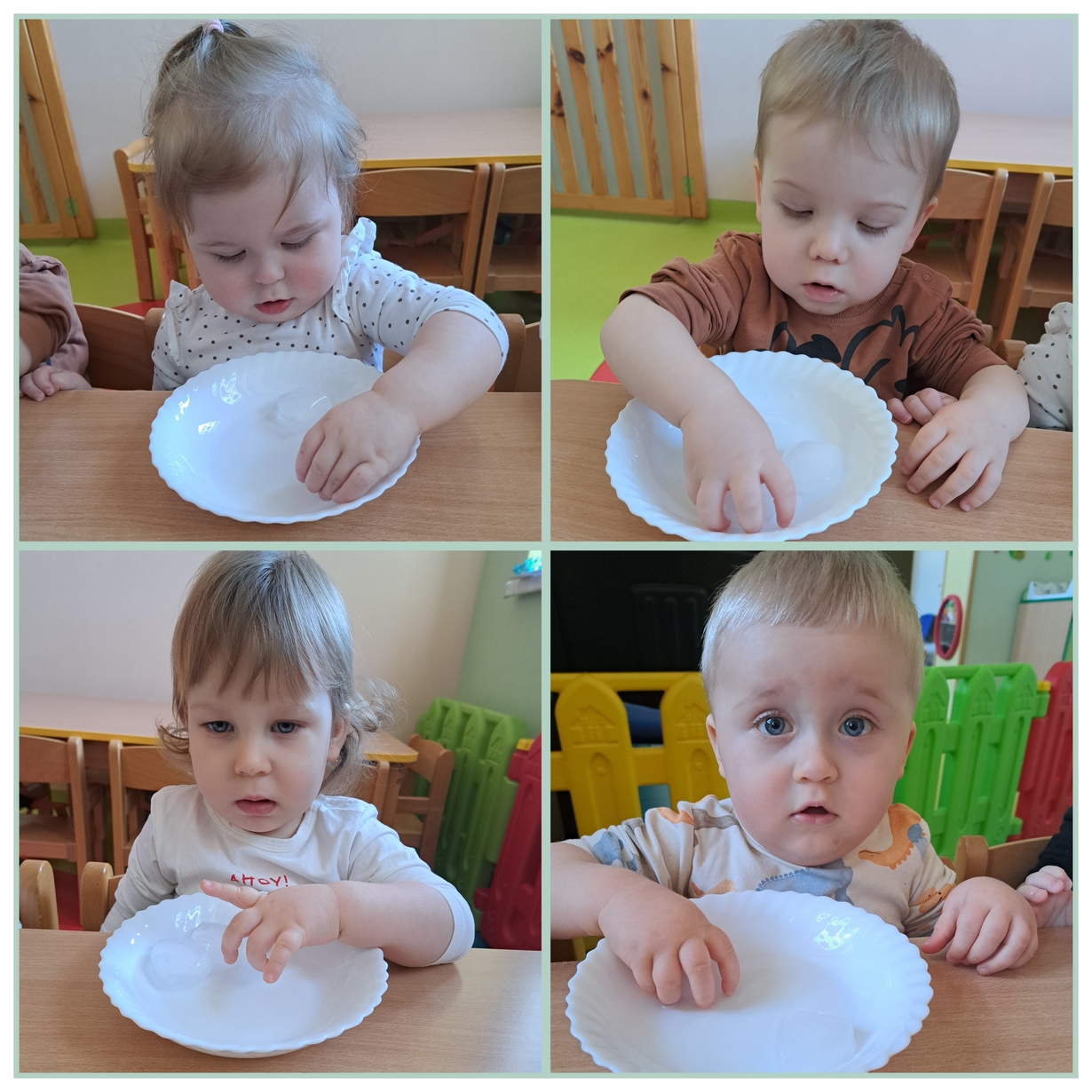 Następnie Motylki brały udział w zabawie badawczej podczas, której mogły poznać stan skupienia wody jakim jest lód. Z dużą ostrożnością, ale też zdziwieniem i zaciekawieniem dotykały kostek lodu. Mogły poznać jej kolor, smak i temperaturę. Nie zabrakło również zajęć twórczych z wykorzystaniem kredek, podczas których dzieci wykonały swoją kropelkę wody. Następnie wspólnie z opiekunkami stworzyły deszczową chmurkę.