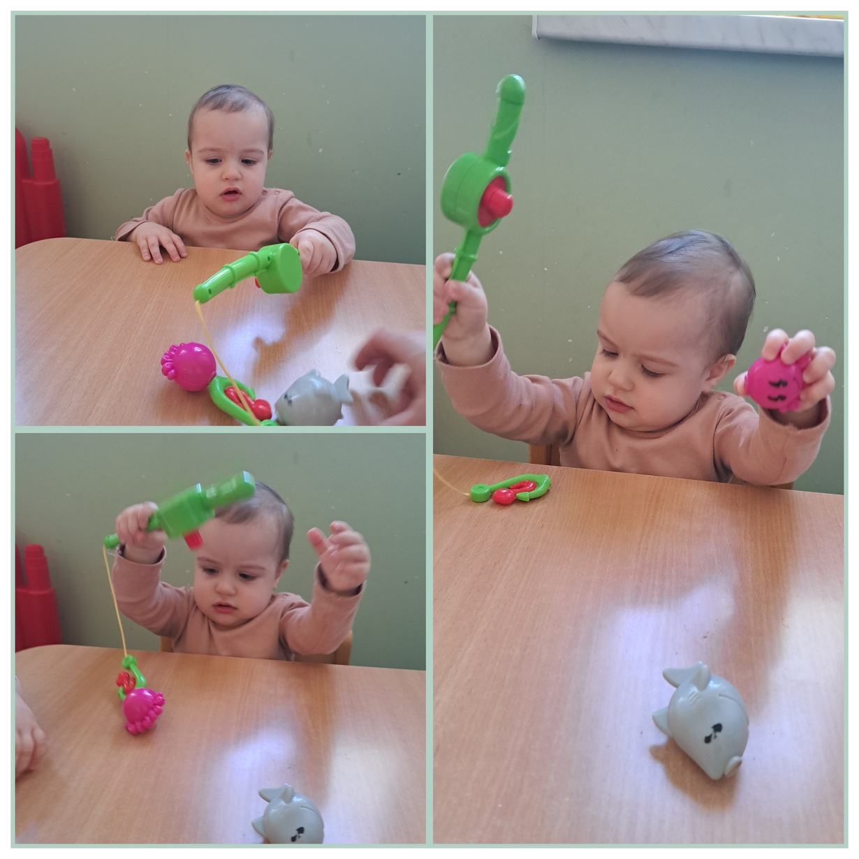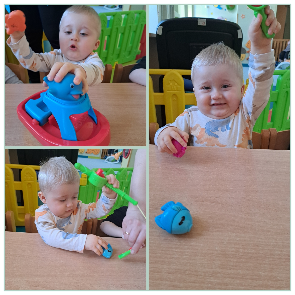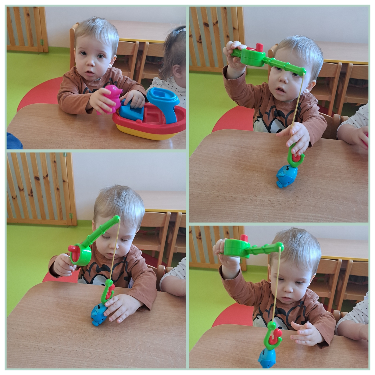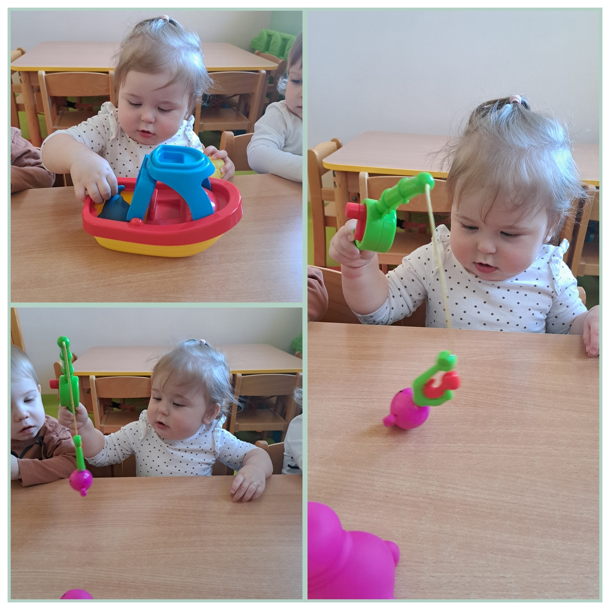 Następnie zamieniły się w wędkarzy i próbowały łowić kolorowe rybki, rozwijając tym samym koordynację wzrokowo-ruchową. Przekonały się, że złapać rybkę na wędkę to nie jest taka prosta sprawa. Starania opłaciły się i wszystkim udało się chociaż raz złowić rybkę. Zachwyt i duma z wykonanego zadania była bezcenna.