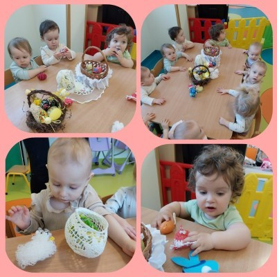 Następnie nasi podopieczni oglądali symbole wielkanocne tj.pisanki,koszyczek wielkanocny ,baranki itp.Nie zabrakło słodkiej niespodzianki od Pań kucharek,które przygotowały pyszne ciasteczka w kształcie jajek 🥚 Na koniec zajęć wszystkie dzieci z pomocą cioć stworzyły milutkie i białe futerko z waty dla baranka wielkanocnego .Dzień był pełen atrakcji i niespodzianek😊