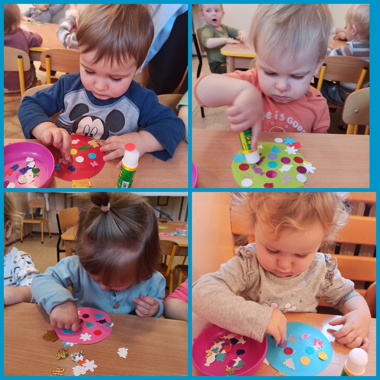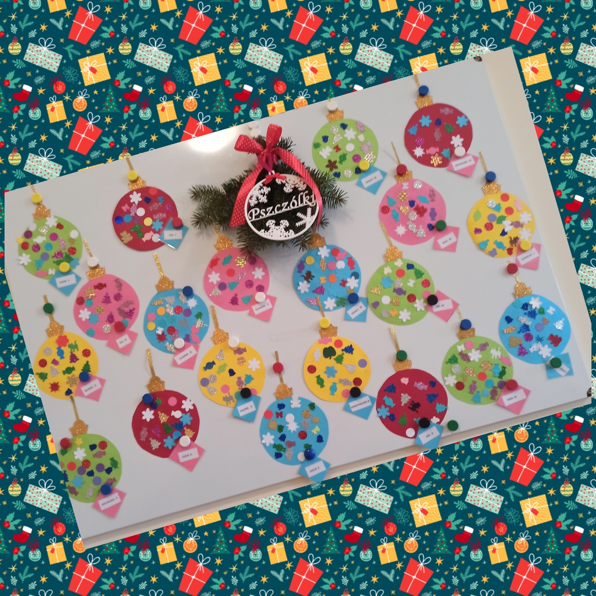 Kolorowe elementy przyklejane do papierowych bombek pięknie błyszczą na naszej tablicy.