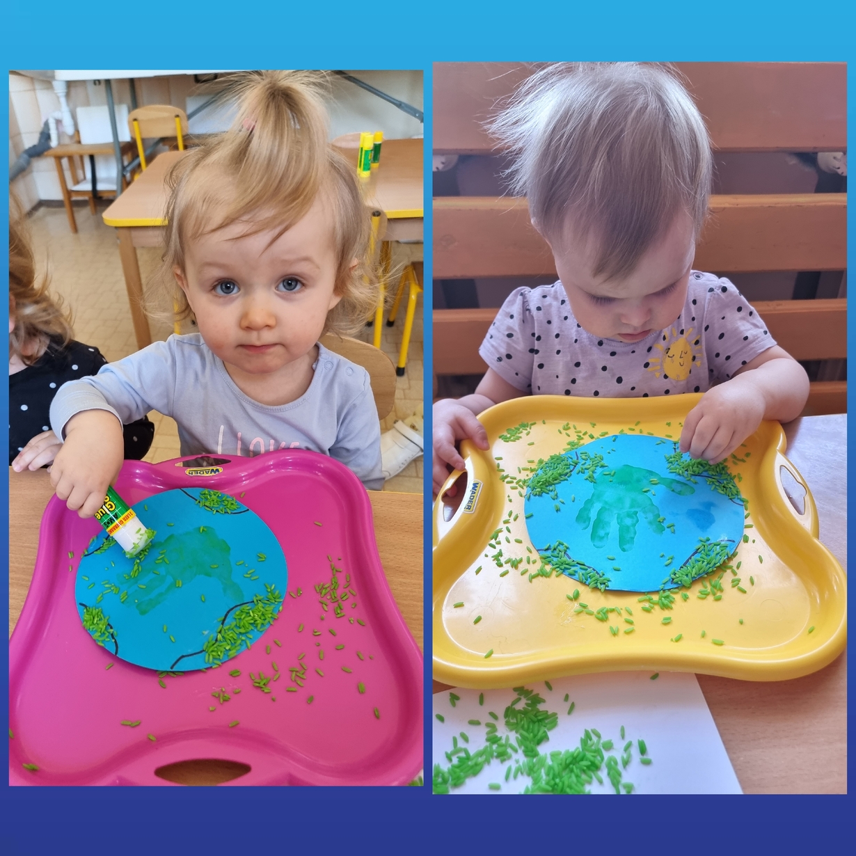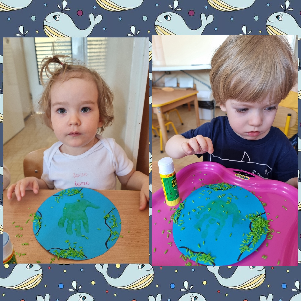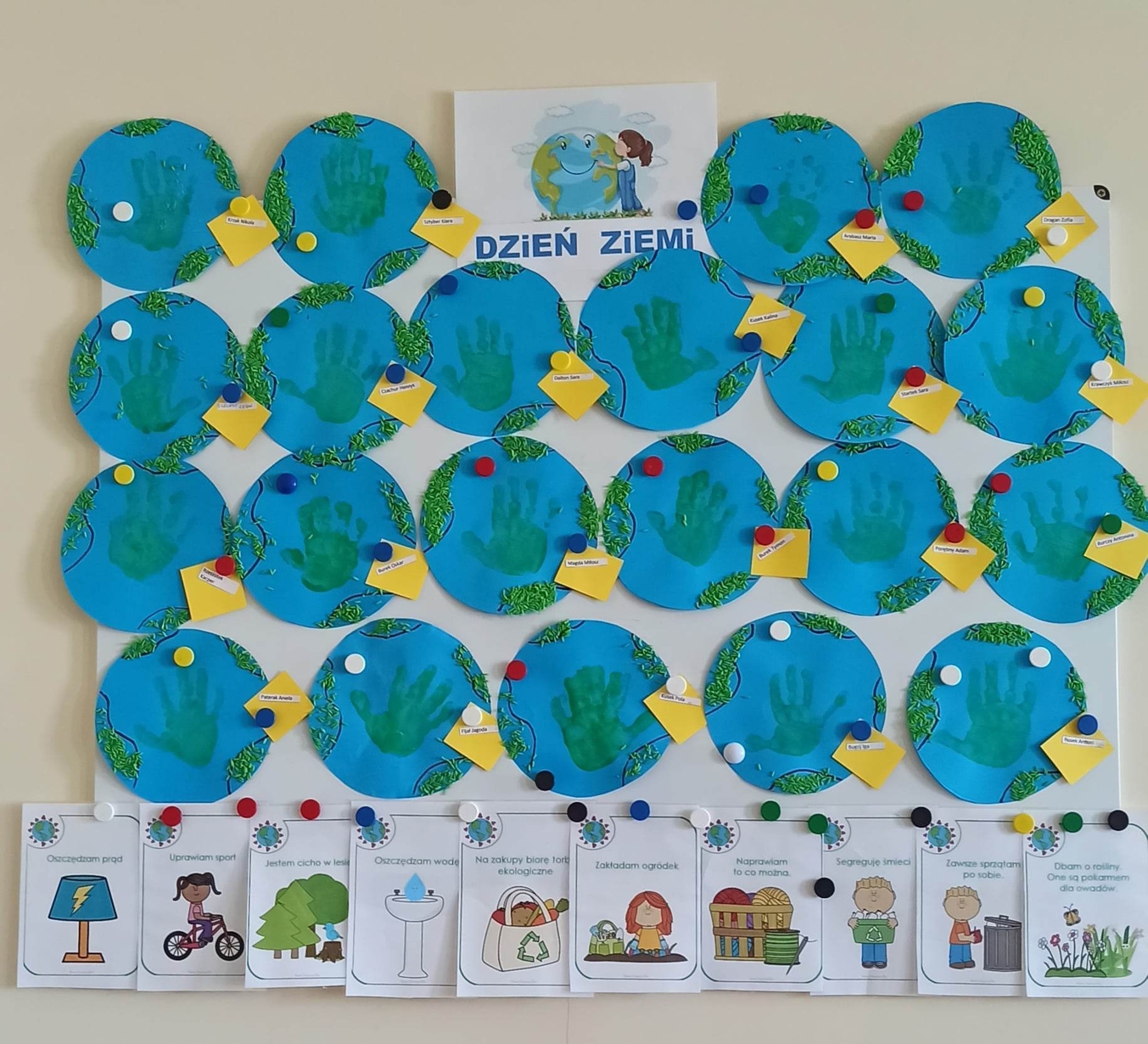 Na koniec powstały piękne prace plastyczne przedstawiające Ziemię z odbitą rączką nawiązującą do hasła