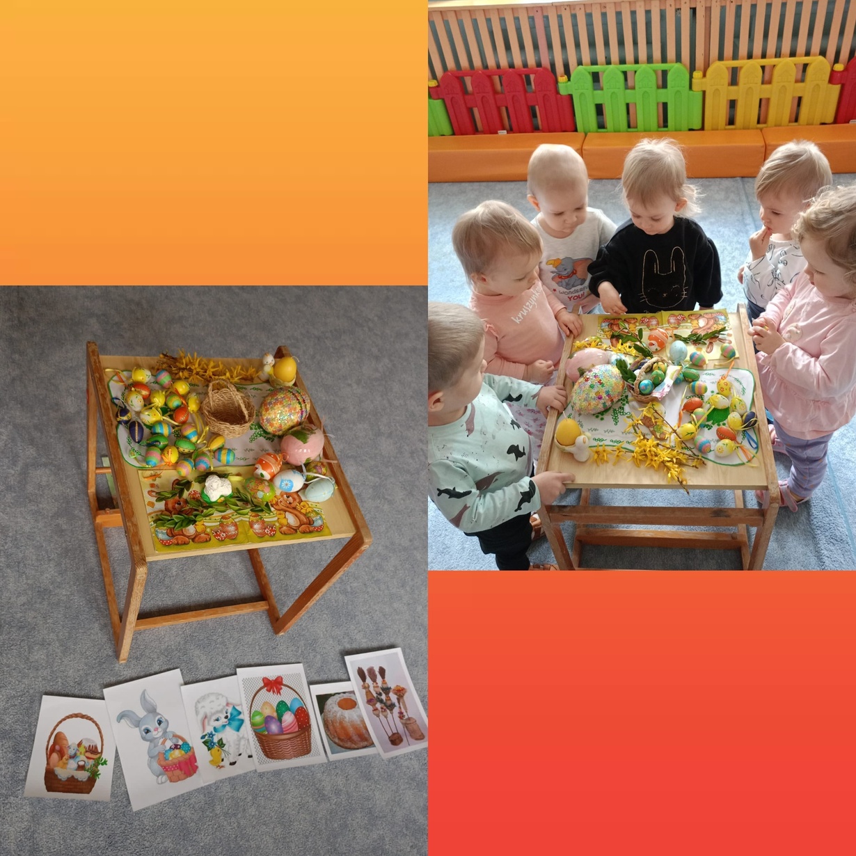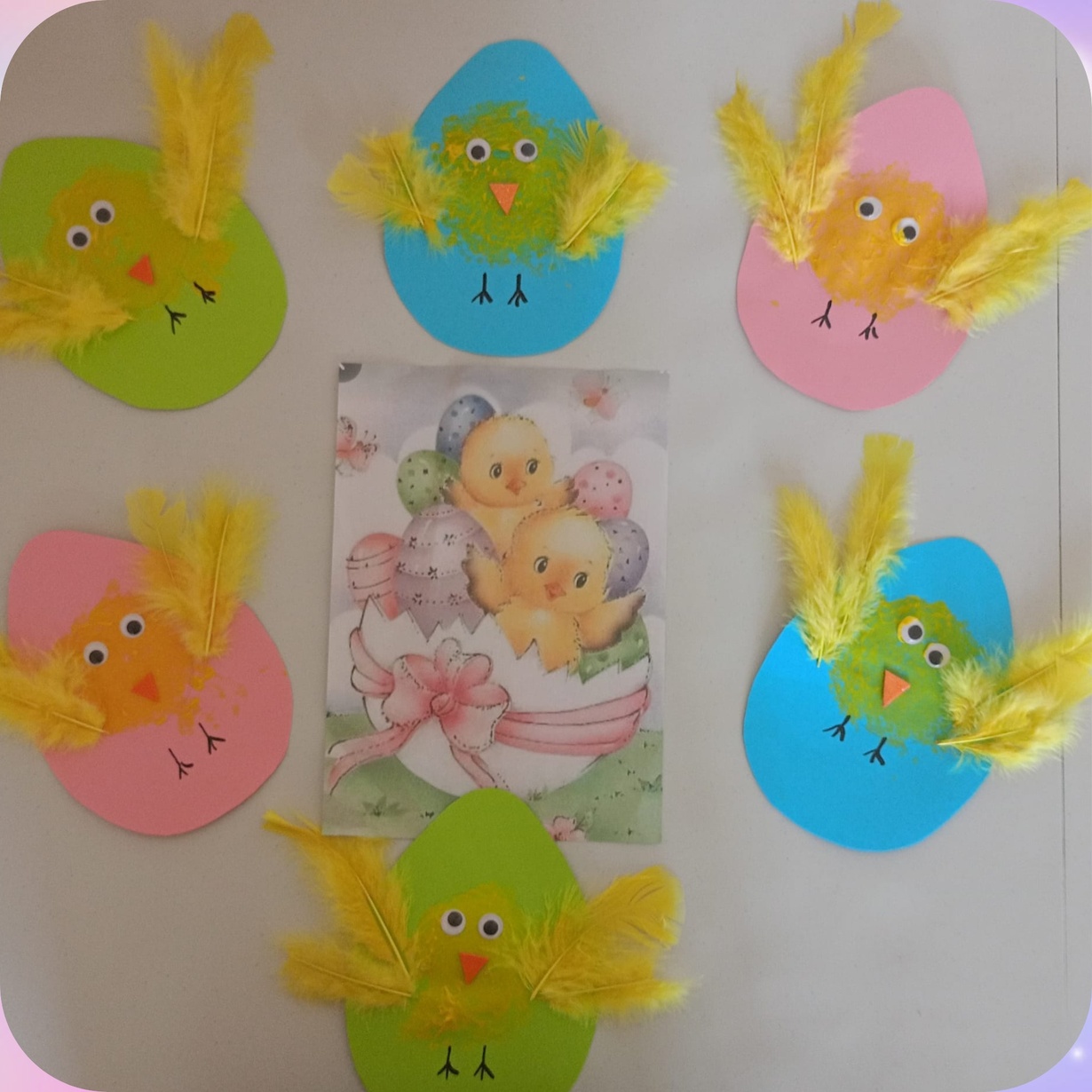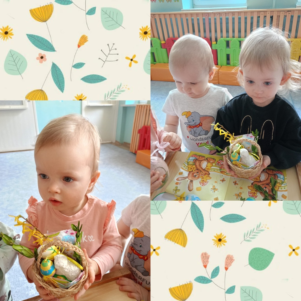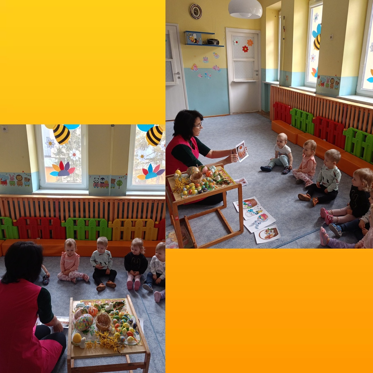 Pszczółki pełną parą przygotowują się do Świąt Wielkanocnych. Dziś dzieci poznały symbole wielkanocne : palma, pisanki, baranek, zajączek i słodka babeczka. Z zaciekawieniem oglądały kolorowe ilustracje i wraz z Ciociami przygotowały koszyczek ze święconką. Na koniec małe Pszczółki wymalowały żółciutkie kurczaczki ozdobione mięciutkimi piórkami.