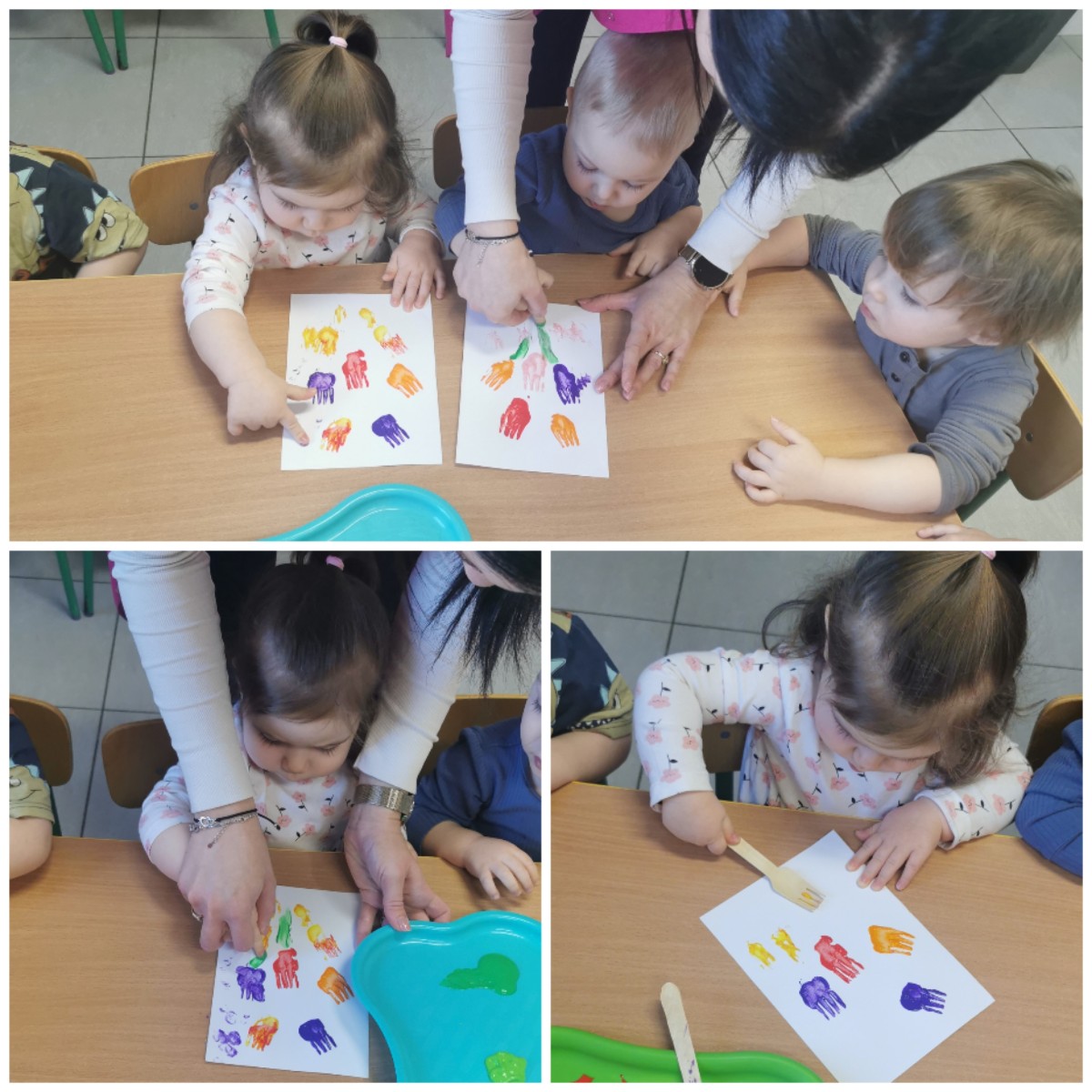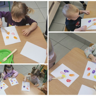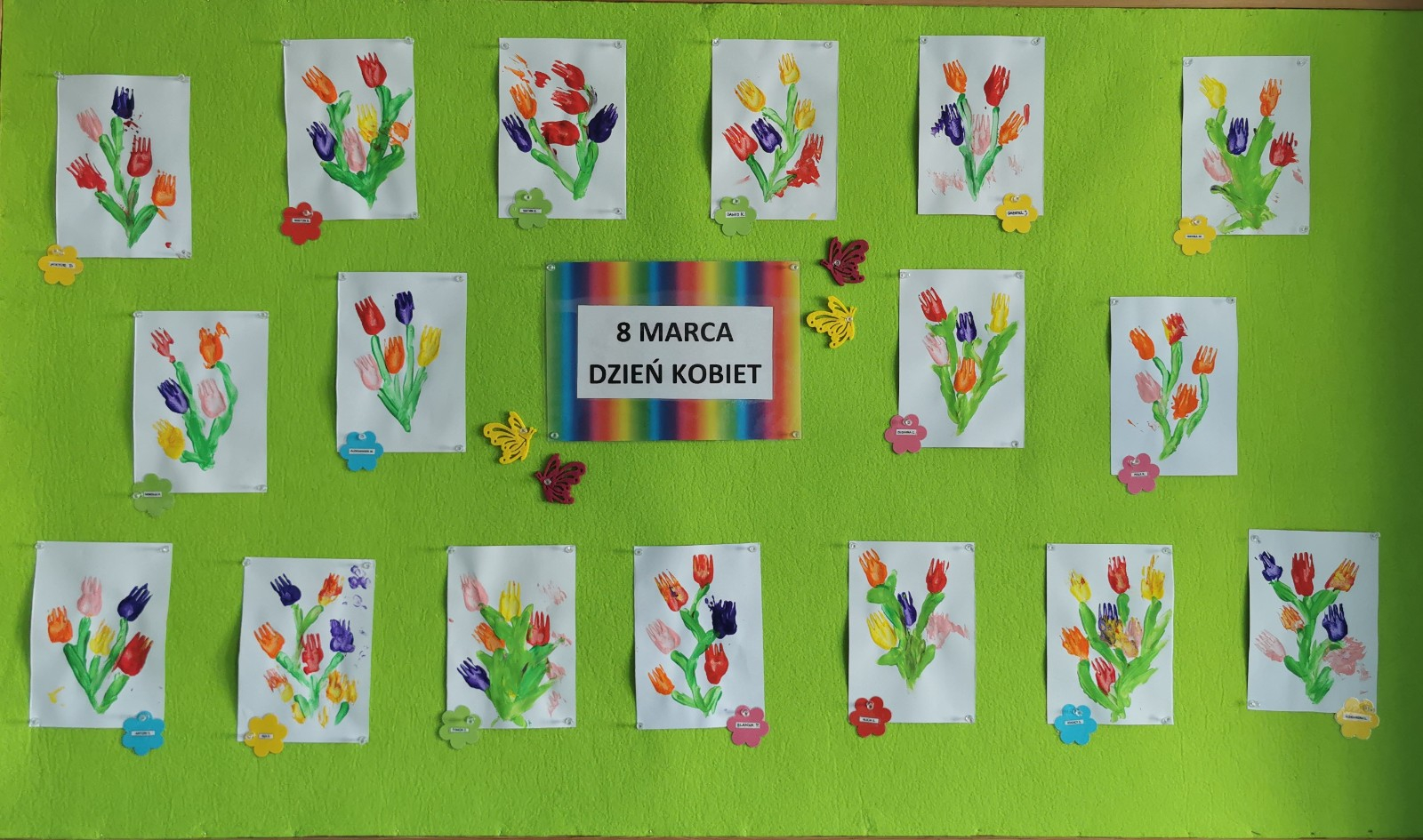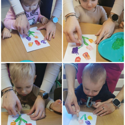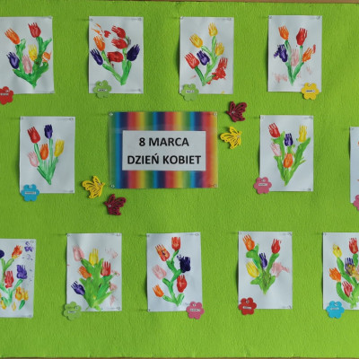 W ten niezwykły dzień w roku, kiedy to swoje święto obchodzą Panie, nasze małe Biedroneczki postanowiły uczcić te dzień a także rozwijać swój talent artystyczny. Z tej okazji stworzyliśmy piękne obrazki, przedstawiające bukiecik kolorowych tulipanów. Wykorzystaliśmy w tym celu farby i drewniane widelce, za pomocą których dzieci odbijały przy asekuracji cioć tulipany na kartce. Kolorowe kwiatki pięknie zapełniły naszą tablicę i z daleka przywołują wiosnę i cieplutkie słonko. Zapraszamy do obejrzenia zdjęć :)